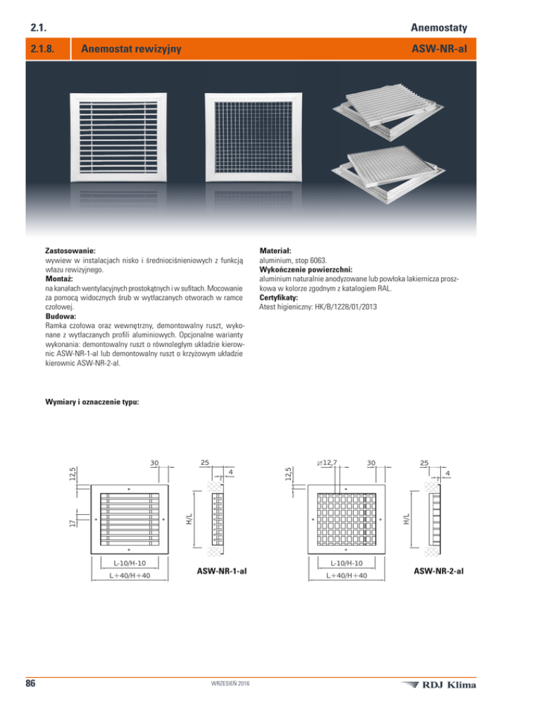 2.1. Anemostaty 2.1.8. Anemostat rewizyjny ASW-NR-al Zastosowanie: wywiew w instalacjach nisko i średniociśnieniowych z funkcją włazu rewizyjnego. Montaż: na kanałach wentylacyjnych prostokątnych i w sufitach. Mocowanie za pomocą widocznych śrub w wytłaczanych otworach w ramce czołowej. Budowa: Ramka czołowa oraz wewnętrzny, demontowalny ruszt, wykonane z wytłaczanych profili aluminiowych. Opcjonalne warianty wykonania: demontowalny ruszt o równoległym układzie kierownic ASW-NR-1-al lub demontowalny ruszt o krzyżowym układzie kierownic ASW-NR-2-al. Materiał: aluminium, stop 6063. Wykończenie powierzchni: aluminium naturalnie anodyzowane lub powłoka lakiernicza proszkowa w kolorze zgodnym z katalogiem RAL. Certyfikaty: Atest higieniczny: HK/B/1228/01/2013 Wymiary i oznaczenie typu: 12,7 4 12,5 25 30 25 4 17 12,5 30 L-10/H-10 L+40/H+40 86 ASW-NR-1-al WRZESIEŃ 2016 L-10/H-10 L+40/H+40 ASW-NR-2-al 2. Anemostaty - dane techniczne Oznaczenie produktów ASW ASW–1–al–P–595×595–RAL–SR/Ø–WMC Sposób montażu: Standard - otwory montażowe w ramie anemostatu WMC - mocowanie centralne B - bez otworów montażowych Skrzynka rozprężna / średnica przyłącza: SR - skrzynka rozprężna SRP - skrzynka rozprężna z przepustnicą na wlocie SRPw - skrzynka rozprężna z przepustnicą na wlocie sterowaną od wewnątrz SRIP - skrzynka rozprężna izolowana z przepustnicą na wlocie SRIPw - skrzynka rozprężna izolowana z przepustnicą na wlocie sterowaną od wewnątrz Kolor według palety RAL: Standard - RAL 9003 Wymiar: wymiar zewnętrzny A - anemostaty ASW wymiar zewnętrzny np. A/K - anemostaty kasetonowe ASW-K Element regulacyjny: P - przepustnica przeciwbieżna ocynkowana P al. - przepustnica przeciwbieżna aluminiowa P ko - przepustnica kwasoodporna Materiał: Standard - blacha czarna malowana proszkowo al - aluminium anodyzowane alp - blacha aluminiowa malowana proszkowo oc - blacha ocynkowana ocp - blacha ocynkowana malowana proszkowo ko - blacha odporna na korozję Typ nawiewnika sufitowego Przykład zamówienia: ASW–1–P–595–SR/Ø160–WMC Anemostat wywiewny stalowy, typ perforacji Ø6 z przepustnicą P ocynkowaną, wymiar 595x595, kolor standardowy RAL 9003, skrzynka rozprężna z przyłączem Ø160, mocowanie centralne. WRZESIEŃ 2016 87