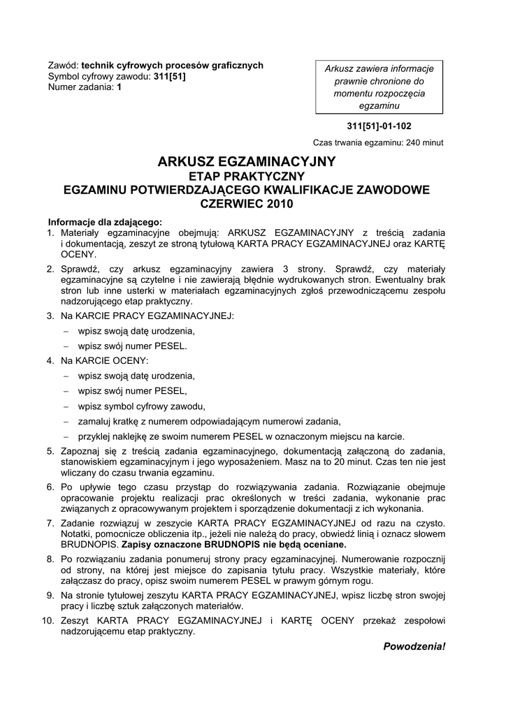 Zawód: technik cyfrowych procesów graficznych Symbol cyfrowy zawodu: 311[51] Numer zadania: 1 Arkusz zawiera informacje prawnie chronione do momentu rozpoczęcia egzaminu 311[51]-01-102 Czas trwania egzaminu: 240 minut ARKUSZ EGZAMINACYJNY ETAP PRAKTYCZNY EGZAMINU POTWIERDZAJĄCEGO KWALIFIKACJE ZAWODOWE CZERWIEC 2010 Informacje dla zdającego: 1. Materiały egzaminacyjne obejmują: ARKUSZ EGZAMINACYJNY z treścią zadania i dokumentacją, zeszyt ze stroną tytułową KARTA PRACY EGZAMINACYJNEJ oraz KARTĘ OCENY. 2. Sprawdź, czy arkusz egzaminacyjny zawiera 3 strony. Sprawdź, czy materiały egzaminacyjne są czytelne i nie zawierają błędnie wydrukowanych stron. Ewentualny brak stron lub inne usterki w materiałach egzaminacyjnych zgłoś przewodniczącemu zespołu nadzorującego etap praktyczny. 3. Na KARCIE PRACY EGZAMINACYJNEJ: wpisz swoją datę urodzenia, wpisz swój numer PESEL. 4. Na KARCIE OCENY: wpisz swoją datę urodzenia, wpisz swój numer PESEL, wpisz symbol cyfrowy zawodu, zamaluj kratkę z numerem odpowiadającym numerowi zadania, przyklej naklejkę ze swoim numerem PESEL w oznaczonym miejscu na karcie. 5. Zapoznaj się z treścią zadania egzaminacyjnego, dokumentacją załączoną do zadania, stanowiskiem egzaminacyjnym i jego wyposażeniem. Masz na to 20 minut. Czas ten nie jest wliczany do czasu trwania egzaminu. 6. Po upływie tego czasu przystąp do rozwiązywania zadania. Rozwiązanie obejmuje opracowanie projektu realizacji prac określonych w treści zadania, wykonanie prac związanych z opracowywanym projektem i sporządzenie dokumentacji z ich wykonania. 7. Zadanie rozwiązuj w zeszycie KARTA PRACY EGZAMINACYJNEJ od razu na czysto. Notatki, pomocnicze obliczenia itp., jeżeli nie należą do pracy, obwiedź linią i oznacz słowem BRUDNOPIS. Zapisy oznaczone BRUDNOPIS nie będą oceniane. 8. Po rozwiązaniu zadania ponumeruj strony pracy egzaminacyjnej. Numerowanie rozpocznij od strony, na której jest miejsce do zapisania tytułu pracy. Wszystkie materiały, które załączasz do pracy, opisz swoim numerem PESEL w prawym górnym rogu. 9. Na stronie tytułowej zeszytu KARTA PRACY EGZAMINACYJNEJ, wpisz liczbę stron swojej pracy i liczbę sztuk załączonych materiałów. 10. Zeszyt KARTA PRACY EGZAMINACYJNEJ i KARTĘ OCENY przekaż zespołowi nadzorującemu etap praktyczny. Powodzenia! Zadanie egzaminacyjne Agencja reklamowo-wydawnicza otrzymała zamówienie na zaprojektowanie i wykonanie 1000 sztuk wizytówek w formacie 50 x 90 mm. Przy projektowaniu wizytówek należy wykorzystać jeden z 5 udostępnionych szablonów (Załącznik nr 1), umieścić na niej logo firmy (Załącznik nr 1) oraz rozmieść użytki na formacie A4. Opracuj projekt realizacji prac w postaci schematu blokowego, dotyczący procesu wytworzenia 1000 sztuk wizytówek oraz wydrukuj 1 arkusz zawierający 10 użytków wizytówek. Podczas wykonania projektu pamiętaj o zachowaniu zasad typografii i kompozycji. Projekt realizacji prac powinien zawierać: 1. Tytuł pracy egzaminacyjnej wynikający z treści zadania. 2. Założenia - czyli niezbędne dane wynikające z treści zadania i załączników. 3. Dobór narzędzi graficznych niezbędnych podczas projektowania wizytówek wraz ze wskazaniem techniki drukowania. 4. Dobór maszyn i urządzeń niezbędnych do wykonania wizytówek i kontroli ich jakości. 5. Wypełnioną kartę zamówienia zawierającą: opis czynności, wykaz maszyn, urządzeń oraz materiałów wykorzystanych w graficznym i poligraficznym procesie wytwarzania wizytówek. 6. Opis metody kontroli parametrów jakości odbitki. 7. Schemat blokowy przebiegu procesu wytwarzania produktu poligraficznego obejmującego procesy graficzne i poligraficzne. 8. Wydruk 10 użytków wizytówek na arkuszu formatu A4 podpisany numerem PESEL. Do wykonania zadania wykorzystaj: Szablony wizytówek i logo firmy zamieszczone na płycie CD – Załącznik 1 szablon wizytówki – 5 wzorów (pliki: wizytówka1.indd, wizytówka2.indd, wizytówka3.indd, wizytówka4.indd, wizytówka5.indd), plik z logo firmy (pliki: Logo 2.jpg, logo klasyczne.pdf). Wykaz maszyn i urządzeń dostępnych w agencji reklamowej – Załącznik 2 Wykaz dostępnych materiałów – Załącznik nr 3 Kartę zamówienia – zamieszczoną w Karcie Pracy Egzaminacyjnej Czas przeznaczony na wykonanie zadania wynosi 240 minut. Strona 2 z 3 Załącznik 2 Wykaz maszyn i urządzeń dostępnych w agencji reklamowej komputer podłączony do sieci lokalnej, konsola do gier, skaner płaski, aparat cyfrowy, densytometr, oprogramowanie systemowe Windows Vista lub Windows 7, /dopuszcza się oprogramowanie Windows XP Professional/ oprogramowanie do grafiki Adobe InDesign, oprogramowanie AutoCAD, oprogramowanie do plików PDF Adobe Acrobat, oprogramowanie antywirusowe, maszyna offsetowa małoformatowa B3, maszyna cyfrowa zwojowa B3, drukarka sieciowa formatu A3, ploter drukujący, ploter tnący, przymiar liniowy, lupka poligraficzna, gilotyna ręczna, krajarka trójnożowa, krajarka jednonożowa, bigówka, perforówka. Załącznik 3 Wykaz dostępnych materiałów papier powlekany dwustronnie, format A4, 170g/m2, papier samoprzylepny, format A4 185g/m2, karton matowy niepowlekany, format A4, 200g/m2, papier kserograficzny matowy, format A4, 80g/m2, folia samoprzylepna, format A4, 130g/m2, tektura wielowarstwowa, format A4, gramatura 650g/m2. Strona 3 z 3