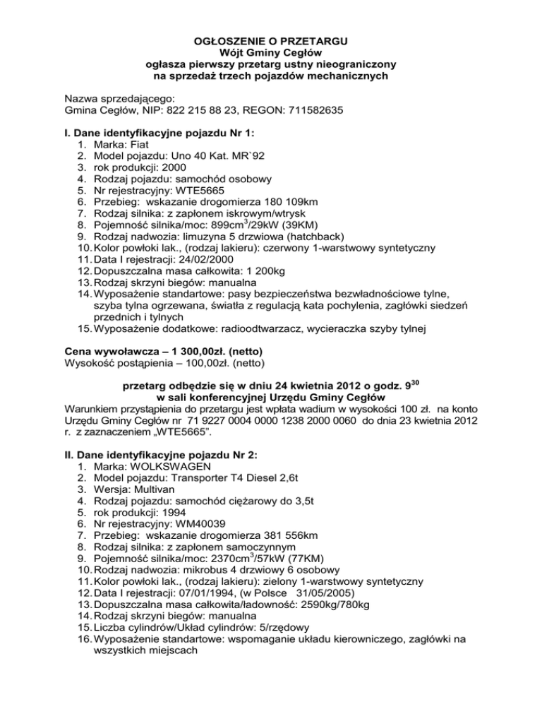 OGŁOSZENIE O PRZETARGU Wójt Gminy Cegłów ogłasza pierwszy przetarg ustny nieograniczony na sprzedaŜ trzech pojazdów mechanicznych Nazwa sprzedającego: Gmina Cegłów, NIP: 822 215 88 23, REGON: 711582635 I. Dane identyfikacyjne pojazdu Nr 1: 1. Marka: Fiat 2. Model pojazdu: Uno 40 Kat. MR`92 3. rok produkcji: 2000 4. Rodzaj pojazdu: samochód osobowy 5. Nr rejestracyjny: WTE5665 6. Przebieg: wskazanie drogomierza 180 109km 7. Rodzaj silnika: z zapłonem iskrowym/wtrysk 8. Pojemność silnika/moc: 899cm3/29kW (39KM) 9. Rodzaj nadwozia: limuzyna 5 drzwiowa (hatchback) 10. Kolor powłoki lak., (rodzaj lakieru): czerwony 1-warstwowy syntetyczny 11. Data I rejestracji: 24/02/2000 12. Dopuszczalna masa całkowita: 1 200kg 13. Rodzaj skrzyni biegów: manualna 14. WyposaŜenie standartowe: pasy bezpieczeństwa bezwładnościowe tylne, szyba tylna ogrzewana, światła z regulacją kata pochylenia, zagłówki siedzeń przednich i tylnych 15. WyposaŜenie dodatkowe: radioodtwarzacz, wycieraczka szyby tylnej Cena wywoławcza – 1 300,00zł. (netto) Wysokość postąpienia – 100,00zł. (netto) przetarg odbędzie się w dniu 24 kwietnia 2012 o godz. 930 w sali konferencyjnej Urzędu Gminy Cegłów Warunkiem przystąpienia do przetargu jest wpłata wadium w wysokości 100 zł. na konto Urzędu Gminy Cegłów nr 71 9227 0004 0000 1238 2000 0060 do dnia 23 kwietnia 2012 r. z zaznaczeniem „WTE5665”. II. Dane identyfikacyjne pojazdu Nr 2: 1. Marka: WOLKSWAGEN 2. Model pojazdu: Transporter T4 Diesel 2,6t 3. Wersja: Multivan 4. Rodzaj pojazdu: samochód cięŜarowy do 3,5t 5. rok produkcji: 1994 6. Nr rejestracyjny: WM40039 7. Przebieg: wskazanie drogomierza 381 556km 8. Rodzaj silnika: z zapłonem samoczynnym 9. Pojemność silnika/moc: 2370cm3/57kW (77KM) 10. Rodzaj nadwozia: mikrobus 4 drzwiowy 6 osobowy 11. Kolor powłoki lak., (rodzaj lakieru): zielony 1-warstwowy syntetyczny 12. Data I rejestracji: 07/01/1994, (w Polsce 31/05/2005) 13. Dopuszczalna masa całkowita/ładowność: 2590kg/780kg 14. Rodzaj skrzyni biegów: manualna 15. Liczba cylindrów/Układ cylindrów: 5/rzędowy 16. WyposaŜenie standartowe: wspomaganie układu kierowniczego, zagłówki na wszystkich miejscach 17. WyposaŜenie dodatkowe: radioodtwarzacz, szyba tylna ogrzewana. 18. Braki w wyposaŜeniu standartowym: wycieraczka i spryskiwacz tylnej szyby Cena wywoławcza – 4 500,00zł. (brutto) Wysokość postąpienia – 200,00zł. (brutto) przetarg odbędzie się w dniu 24 kwietnia 2012 o godz. 1000 w sali konferencyjnej Urzędu Gminy Cegłów Warunkiem przystąpienia do przetargu jest wpłata wadium w wysokości 300 zł. na konto Urzędu Gminy Cegłów nr 71 9227 0004 0000 1238 2000 0060 do dnia 23 kwietnia 2012 r. z zaznaczeniem „WM40039”. III. Dane identyfikacyjne pojazdu Nr :3 19. Marka: MEPROZET 20. Model pojazdu: PN 40 21. Wersja: wóz asenizacyjny 22. Rodzaj pojazdu: przyczepa 23. rok produkcji: 2004 24. Nr rejestracyjny: WM61095 25. Data I rejestracji: 20/07/2005 26. Dopuszczalna masa całkowita/masa własność/ładowność: 5550kg/1250kg/4300kg Cena wywoławcza – 11 200,00zł. (brutto) Wysokość postąpienia – 500,00zł. (brutto) przetarg odbędzie się w dniu 24 kwietnia 2012 o godz. 1030 w sali konferencyjnej Urzędu Gminy Cegłów Warunkiem przystąpienia do przetargu jest wpłata wadium w wysokości 1000 zł. na konto Urzędu Gminy Cegłów nr 71 9227 0004 0000 1238 2000 0060 do dnia 23 kwietnia 2012 r. z zaznaczeniem „WM61095”. Przed przystąpieniem do przetargu osoby zainteresowane nabyciem któregokolwiek pojazdu mają moŜliwość obejrzenia przedmiotu przetargu w dniach od 19 kwietnia 2012 r. do 20 kwietnia 2012 r. w godz. od.8.00 do 10.00 na terenie bazy w Cegłowie przy ulicy Dobrzyckiego 5, oraz zapoznania się z jego dokumentacją i Regulaminem przeprowadzenia przetargu ustnego nieograniczonego w siedzibie Urzędu Gminy Cegłów ul. Kościuszki 4, pok. nr 5. w godzinach pracy urzędu. Osobą uprawnioną do kontaktu jest Pan Dariusz Uchman – z-ca wójta. Tel. 25 759 59 43 Osoba fizyczna biorąca udział w przetargu zobowiązana jest posiadać: dowód osobisty i dowód wpłaty wadium, a osoba reprezentująca osobę prawną stosowane pełnomocnictwa, dowód osobisty oraz aktualny wypis z rejestru sądowego. W przypadku kopii wypisu kopia winna być potwierdzona za zgodność z oryginałem. Ponadto wszystkie osoby biorące udział w postępowaniu składają oświadczenie o zapoznaniu się z warunkami i przedmiotem przetargu. Ostateczny termin wpłaty ceny nabycia pojazdu pomniejszonej o wpłacone wadium upływa najpóźniej w dniu zawarcia umowy. WÓJT Marcin Uchman