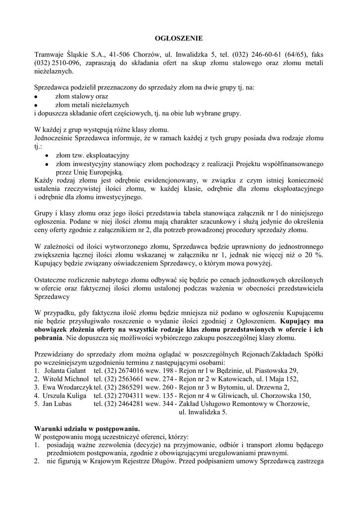 OGŁOSZENIE Tramwaje Śląskie S.A., 41-506 Chorzów, ul. Inwalidzka 5, tel. (032) 246-60-61 (64/65), faks (032) 2510-096, zapraszają do składania ofert na skup złomu stalowego oraz złomu metali nieżelaznych. Sprzedawca podzielił przeznaczony do sprzedaży złom na dwie grupy tj. na: złom stalowy oraz złom metali nieżelaznych i dopuszcza składanie ofert częściowych, tj. na obie lub wybrane grupy. W każdej z grup występują różne klasy złomu. Jednocześnie Sprzedawca informuje, że w ramach każdej z tych grupy posiada dwa rodzaje złomu tj.: złom tzw. eksploatacyjny złom inwestycyjny stanowiący złom pochodzący z realizacji Projektu współfinansowanego przez Unię Europejską. Każdy rodzaj złomu jest odrębnie ewidencjonowany, w związku z czym istniej konieczność ustalenia rzeczywistej ilości złomu, w każdej klasie, odrębnie dla złomu eksploatacyjnego i odrębnie dla złomu inwestycyjnego. Grupy i klasy złomu oraz jego ilości przedstawia tabela stanowiąca załącznik nr l do niniejszego ogłoszenia. Podane w niej ilości złomu mają charakter szacunkowy i służą jedynie do określenia ceny oferty zgodnie z załącznikiem nr 2, dla potrzeb prowadzonej procedury sprzedaży złomu. W zależności od ilości wytworzonego złomu, Sprzedawca będzie uprawniony do jednostronnego zwiększenia łącznej ilości złomu wskazanej w załączniku nr 1, jednak nie więcej niż o 20 %. Kupujący będzie związany oświadczeniem Sprzedawcy, o którym mowa powyżej. Ostateczne rozliczenie nabytego złomu odbywać się będzie po cenach jednostkowych określonych w ofercie oraz faktycznej ilości złomu ustalonej podczas ważenia w obecności przedstawiciela Sprzedawcy W przypadku, gdy faktyczna ilość złomu będzie mniejsza niż podano w ogłoszeniu Kupującemu nie będzie przysługiwało roszczenie o wydanie ilości zgodniej z Ogłoszeniem. Kupujący ma obowiązek złożenia oferty na wszystkie rodzaje klas złomu przedstawionych w ofercie i ich pobrania. Nie dopuszcza się możliwości wybiórczego zakupu poszczególnej klasy złomu. Przewidziany do sprzedaży złom można oglądać w poszczególnych Rejonach/Zakładach Spółki po wcześniejszym uzgodnieniu terminu z następującymi osobami: 1. Jolanta Galant tel. (32) 2674016 wew. 198 - Rejon nr l w Będzinie, ul. Piastowska 29, 2. Witold Michnol tel. (32) 2563661 wew. 274 - Rejon nr 2 w Katowicach, ul. l Maja 152, 3. Ewa Wrodarczyk tel. (32) 2865291 wew. 260 - Rejon nr 3 w Bytomiu, ul. Drzewna 2, 4. Urszula Kuliga tel. (32) 2704311 wew. 135 - Rejon nr 4 w Gliwicach, ul. Chorzowska 150, 5. Jan Lubas tel. (32) 2464281 wew. 344 - Zakład Usługowo Remontowy w Chorzowie, ul. Inwalidzka 5. Warunki udziału w postępowaniu. W postępowaniu mogą uczestniczyć oferenci, którzy: 1. posiadają ważne zezwolenia (decyzje) na przyjmowanie, odbiór i transport złomu będącego przedmiotem postępowania, zgodnie z obowiązującymi uregulowaniami prawnymi. 2. nie figurują w Krajowym Rejestrze Długów. Przed podpisaniem umowy Sprzedawcą zastrzega 3. sobie prawo do weryfikacji wiarygodności finansowej potencjalnego nabywcy poprzez jego sprawdzenie w bazie danych Krajowego Rejestru Długów. W związku z czym wymagał będzie od oferenta, którego oferta będzie najkorzystniejsza podpisania oświadczenia zgodnie ze wzorem stanowiącym załącznik nr 4. W przypadku odmowy podpisania wskazanego oświadczenia oferta wybranego wykonawcy zostanie odrzucona z postępowania, a Sprzedawca wybierze ofertę najkorzystniejszą spośród pozostałych ofert. wnieśli wadium w wymaganej wysokości. Sprzedawca oceni spełnienie warunków udziału na podstawie dokumentów dołączonych do oferty. Oferty wykonawców niespełniające warunków udziału w postępowaniu zostaną z niego odrzucone. Dokumenty i oświadczenia Oferent winien złożyć ofertę zawierającą następujące dokumenty i oświadczenia: 1. Formularz oferty - załącznik nr 2 do Ogłoszenia. 2. Aktualny odpis z właściwego rejestru lub z Centralnej Ewidencji i Informacji o Działalności Gospodarczej, jeżeli odrębne przepisy wymagają wpisu do rejestru lub ewidencji, wystawiony nie wcześniej niż 6 miesięcy przed upływem terminu składania ofert. 3. Ważne zezwolenie (decyzję) na przyjmowanie, odbiór i transport złomu będącego przedmiotem postępowania. 4. Dokument potwierdzający wniesienie wadium tj.: kopię dokumentu potwierdzającego wniesienie wadium w formie pieniężnej. Wadium 1. Oferent zobowiązany jest do wniesienia przed upływem terminu składania ofert wadium w formie pieniężnej w wysokości: a. 67.000,00 (słownie: sześćdziesiąt siedem tysięcy 00/100) w przypadku, gdy oferent składa ofertę wyłącznie na zakup grupy I (tj. złom stalowy). b. 16.000,00 (słownie: (szesnaście tysięcy 00/100) w przypadku, gdy oferent składa ofertę wyłącznie na zakup grupy II (tj. złom metali nieżelaznych). c. 83.000,00 (słownie: osiemdziesiąt trzy tysiące 00/100) w przypadku, gdy oferent składa ofertę na obie grupy. 2. Wadium wpłaca się przelewem na rachunek bankowy Sprzedawcy: Bank Pekao S.A. 23 1240 4272 1111 0000 4839 6893 określając tytuł wpłaty „Wadium – Sprzedaż złomu 1/2014”. 3. O uznaniu przez Sprzedawcę, że wadium wniesiono w wymaganym terminie, decyduje data wpływu środków na rachunek bankowy Sprzedawcy. 4. Oferent winien załączyć do oferty kopię dokumentu potwierdzającego wniesienie wadium. 5. Sprzedawca zwraca wadium wszystkim oferentom niezwłocznie po wyborze oferty najkorzystniejszej lub unieważnieniu postępowania, z wyjątkiem oferenta, którego oferta została wybrana jako najkorzystniejsza. 6. Wadium, złożone przez oferenta, którego oferta została wybrana zostanie w pełnej wysokości zaliczone na poczet zabezpieczenia należytego wykonania umowy. 7. Sprzedawca zwróci oferentowi zabezpieczenie należytego wykonania umowy w terminie do 14 dni licząc od ostatniego dnia realizacji transakcji i uz