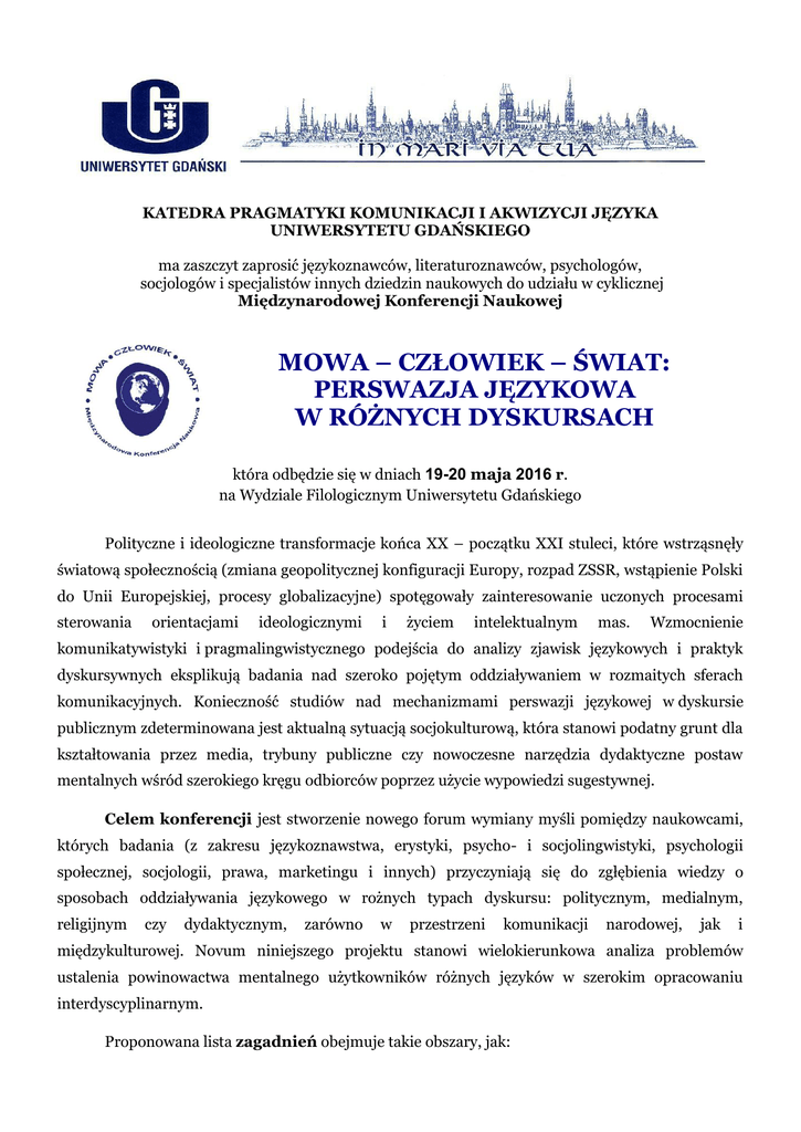 KATEDRA PRAGMATYKI KOMUNIKACJI I AKWIZYCJI JĘZYKA UNIWERSYTETU GDAŃSKIEGO ma zaszczyt zaprosić językoznawców, literaturoznawców, psychologów, socjologów i specjalistów innych dziedzin naukowych do udziału w cyklicznej Międzynarodowej Konferencji Naukowej MOWA – CZŁOWIEK – ŚWIAT: PERSWAZJA JĘZYKOWA W RÓŻNYCH DYSKURSACH która odbędzie się w dniach 19-20 maja 2016 r. na Wydziale Filologicznym Uniwersytetu Gdańskiego Polityczne i ideologiczne transformacje końca XX – początku XXI stuleci, które wstrząsnęły światową społecznością (zmiana geopolitycznej konfiguracji Europy, rozpad ZSSR, wstąpienie Polski do Unii Europejskiej, procesy globalizacyjne) spotęgowały zainteresowanie uczonych procesami sterowania orientacjami ideologicznymi i życiem intelektualnym mas. Wzmocnienie komunikatywistyki i pragmalingwistycznego podejścia do analizy zjawisk językowych i praktyk dyskursywnych eksplikują badania nad szeroko pojętym oddziaływaniem w rozmaitych sferach komunikacyjnych. Konieczność studiów nad mechanizmami perswazji językowej w dyskursie publicznym zdeterminowana jest aktualną sytuacją socjokulturową, która stanowi podatny grunt dla kształtowania przez media, trybuny publiczne czy nowoczesne narzędzia dydaktyczne postaw mentalnych wśród szerokiego kręgu odbiorców poprzez użycie wypowiedzi sugestywnej. Celem konferencji jest stworzenie nowego forum wymiany myśli pomiędzy naukowcami, których badania (z zakresu językoznawstwa, erystyki, psycho- i socjolingwistyki, psychologii społecznej, socjologii, prawa, marketingu i innych) przyczyniają się do zgłębienia wiedzy o sposobach oddziaływania językowego w rożnych typach dyskursu: politycznym, medialnym, religijnym czy dydaktycznym, zarówno w przestrzeni komunikacji narodowej, jak i międzykulturowej. Novum niniejszego projektu stanowi wielokierunkowa analiza problemów ustalenia powinowactwa mentalnego użytkowników różnych języków w szerokim opracowaniu interdyscyplinarnym. Proponowana lista zagadnień obejmuje takie obszary, jak:  argumentacja i manipulacja w komunikacji prywatnej i publicznej;  typologia i hierarchia gatunków perswazyjnych;  taktyczno-strategiczne planowanie wypowiedzi, współdziałanie nadawcy i odbiorcy w procesie komunikacji;  specyfika oddziaływania językowego w dyskursie politycznym, medialnym, religijnym, dydaktycznym. Czekamy również na propozycje od Państwa. Języki konferencji: język polski i rosyjski. Forma wystąpienia: referat (czas prezentacji 15 minut, wystąpienie plenarne – 20 minut). Teksty referatów, które otrzymają pozytywną recenzję, zostaną opublikowane w tomie konferencyjnym o charakterze monograficznym. Zgłoszenia, dane o autorach oraz dane do faktury prosimy przesyłać do 31 stycznia 2016 na adres: [email protected] Termin nadsyłania tekstów artykułów upływa z dniem 31 kwietnia 2016 r. Wysokość opłaty konferencyjnej wynosi 400 złotych. W kwotę wliczone zostały:  koszty organizacyjne, publikacja referatów konferencyjnych.  obiady w dniach 19 i 20 maja 2016 r.  wycieczka w dniu 20 maja „Stare Miasto Gdańsk…” Przy zaocznym udziale opłata konferencyjna wynosi 250 zł (koszty publikacji artykułu). Wpłaty prosimy dokonywać na poniższe konto: Uniwersytet Gdański w Gdańsku Bank PEKAO S.A. IV O/Gdańsk 59124012711111001043682415 KF-60-15 + Imię Nazwisko Noclegi – w gestii uczestników. Poniżej możliwe opcje: - Hotel Uniwersytecki (Wydział Prawa i Administracji), opłata orientacyjna 100 zł/doba, konieczność wcześniejszej rezerwacji, tel. (58) 523 29 62. - Hotel OLIVIA, al. Grunwaldzka 470: pokój 2os./dla 1 os. 150,00 zł/doba, tel.: (58) 343 31 00 Serdecznie zapraszamy Państwa do udziału! Z poważaniem, dr hab. Żanna Sładkiewicz dr Aleksandra Klimkiewicz