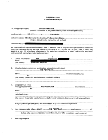 O ŚWIADCZENIE o stanie maj ątkowym Ja, ni żej podpisany(a), urodzony(a) Sławomir Mazurek (imiona i nazwisko, w przypadku kobiet poda ć nazwisko panie ńskie) 1.10.1979 r w Zamościu zatrudniony(a) w Ministerstwie Środowiska, Podsekretarz Stanu (miejsce zatrudnienia, stanowisko lub funkcja) zamieszkały(a) po zapoznaniu się z przepisami ustawy z dnia 21 sierpnia 1997 r. o ograniczeniu prowadzenia dzia łalności gospodarczej przez osoby pe łnią ce funkcje publiczne (Dz. U. z 2006 r. Nr 216, poz. 1584, z pó źn. zm .), zgodnie z a rt. 10 tej ustawy o świadczam, że posiadam wchodz ące w skład małże ń skiej wspólno ści ustawowej lub stanowi ące mój maj ątek odrębny: 1. Dom o powierzchni: 180 m2 •ołożon adres: tytuł prawny własność wspólna 2. Mieszkanie (własnościowe, spółdzielcze własnościowe lub inne): NIE POSIADAM adres: . powierzchnia całkowita: m2 tytuł prawny (własność , współwłasność, wielkość udziału): 3. Gospodarstwo rolne: rodzaj gospodarstwa: m2 adres: NIE POSIADAM powierzchnia• rodzaj zabudowy: tytuł prawny (własność, współwłasność, użytkowanie wieczyste, dzierżawa, inny tytu ł, poda ć jaki): Z tego tytu łu osi ągn ąłem(ęłam) w roku ubiegłym przychód i dochód w wysoko ści: 4. Inne nieruchomo ści (place, działki): NIE POSIADAM powierzchnia: (adres, tytu ł prawny: własność, współwłasność, inny tytuł - podać jaki oraz inne dane) 5. Zasoby pieniężne: m2 - środki pieni ężne zgromadzone w walucie polskiej: ME POSIADAM - ś rodki pieni ężne zgromadzone w walucie obcej: NIE POSIADAM - papiery warto ściowe: NIE POSIADAM na kwotę: I I Nabyłem(am) (nabył mój małżonek) mienie od Skarbu Pa ń stwa, innej pa ństwowej osoby prawnej, jednostek samorz ądu terytorialnego, ich zwi ązków lub od komunalnej osoby prawnej, które podlega ło zbyciu w drodze przetargu: nie* tak* Poda ć rodzaj mienia, dat ę nabycia, od kogo III 1. a* Nie jestem członkiem zarządu ani rady nadzorczej, komisji rewizyjnej spó łki prawa handlowego, ani też członkiem zarządu fundacji prowadz ącej działalność gospodarczą. b* --ee (wymienić peł nione funkcje i stanowiska wraz z nazwami spó łek i fundacji) Z tego tytu łu osiągn ąłem(ęłam) w roku ubiegłym dochód w wysoko ści: 2. a* Nie jestem zatrudniony(a) ani te ż nie wykonuję innych zajęć w spółkach prawa handlowego, które mogłyby wywołać podejrzenie o moj ą stronniczo ść lub interesowno ść. b* Z tego tytu łu osiągn ąłem(ęłam) w roku ubiegłym dochód w wysoko ści: 3. a* Nie jestem cz łonkiem zarzą du, rady nadzorczej ani komisji rewizyjnej spó łdzielni.') b* Jcctcm cz łonkiem zarządu, rady nadzorczej Iuh komicji rcwizyjncj spó łdziclni: (poda ć pełnioną funkcj ę, nazwę i adres spółdzielni) Z tego tytułu osiągn ąłem(ęł am) w roku ubieg łym dochód w wysoko ści: 4. W nast ę pujących spół kach prawa handlowego posiadam ni żej podane udzia ły lub akcje: NIE POSIADAM (nazwa spó łki - adresy, wielko ść udziałów, ilość akcji) Z tego tytu łu osiągn ąłem(ęłam) w roku ubieg łym dochód w wysokości: Równocześnie oświadczam, że w spółce moje udziały (lub akcje) przekraczaj ą 10%. W pozostałych spółkach prawa handlowego posiadane udzia ły lub akcje nie stanowi ą 10% kapitału. IV 1. Nie prowadzę działalnoś ci gospodarczej na w łasny rachunek ani wspólnie z innymi osobami, nie zarzadzam również taka działalności ą ani nie jestem przedstawicielem czy te ż pełnomocnikiem w prowadzeniu takiej dzia łalności.2) 2. Prowadz ę w wyżej okreś lony sposób działalność polegaj ącą na: NIE POSIADAM Z tego tytu łu osiągnąłem(ęłam) w roku ubiegłym dochód w wysoko ści: V Składniki mienia ruchomego o warto ści powyżej 10.000 złotych (w przypadku pojazdów mechanicznych należy podać markę , model i rok produkcji): Mazda 2, 2008r., Peugeot 407, 2008r VI Zobowiązania pieni ęż ne o warto ści powyżej 10.000 złotych, w tym zaci ągnięte kredyty i po życzki, oraz warunki, na jakich zosta ły udzielone (wobec kogo, w zwi ązku z jakim zdarzeniem, w jakiej wysoko ści): Kredyt mieszkaniowy W łasny Kąt hipoteczny na zakup domu. Kwota udzielonego kredytu 547 560 zł Kredyt na zakup samochodu 21 500 z ł VII Inne dodatkowe dane o stanie maj ątkowym: 1. Własna działalność gospodarcza do dn. 19.11.2015 r. - zawieszona 126 152,96 2. Ze stosunku pracy — dochód 14 578, 25 Z tego tytułu osiągn ąłem(głam) w roku ubiegłym dochód w wysoko ści: 140 731,21 Powyższe oświadczenie składam świadomy(a), że na podstawie a rt. 14 ust. 1 ustawy z dnia 21 sierpnia 1997 r. o ograniczeniu prowadzenia dzia łalności gospodarczej przez osoby pe łniące funkcje publiczne (Dz. U. z 2006 r. Nr 216, poz. 1584, z p62n. zm .) za podanie nieprawdy grozi kard p z awienia w9lno ści. )i0 A , ~ ,~. o 2(,)// (miejscowo ść , data) 1) Nie dotyczy rad nadzorczych spó łdzielni mieszkaniowych. 2) Nie dotyczy dzia łalności wytwórczej w rolnictwie. * Niewłaściwe skre ślić i uzupełnić, wpisuj ą c w poszczególnych punktach odpowiednie dane