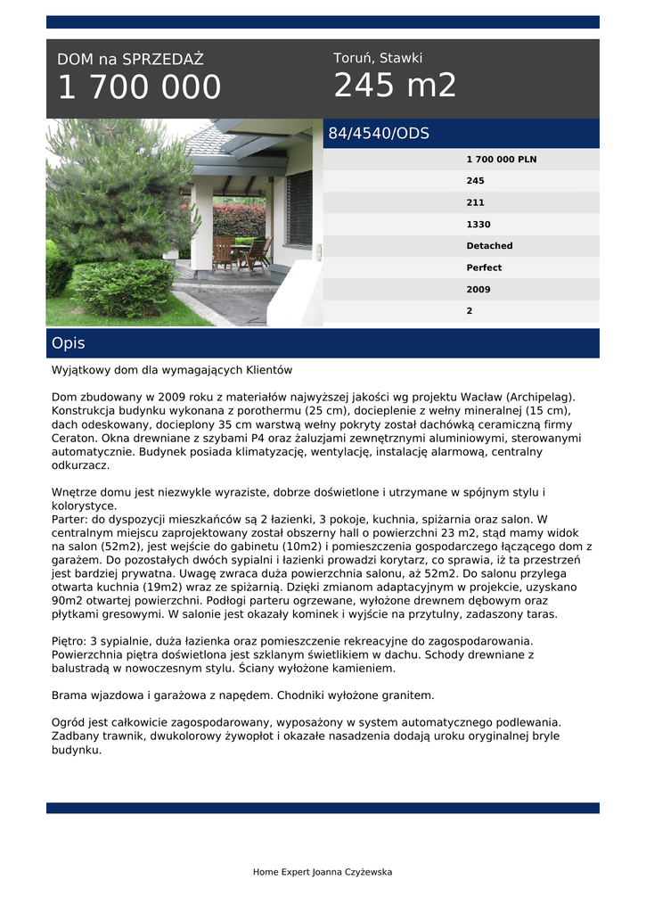 Toruń, Stawki DOM na SPRZEDAŻ 245 m2 1 700 000 84/4540/ODS 1 700 000 PLN 245 211 1330 Detached Perfect 2009 2 Opis Wyjątkowy dom dla wymagających Klientów Dom zbudowany w 2009 roku z materiałów najwyższej jakości wg projektu Wacław (Archipelag). Konstrukcja budynku wykonana z porothermu (25 cm), docieplenie z wełny mineralnej (15 cm), dach odeskowany, docieplony 35 cm warstwą wełny pokryty został dachówką ceramiczną firmy Ceraton. Okna drewniane z szybami P4 oraz żaluzjami zewnętrznymi aluminiowymi, sterowanymi automatycznie. Budynek posiada klimatyzację, wentylację, instalację alarmową, centralny odkurzacz. Wnętrze domu jest niezwykle wyraziste, dobrze doświetlone i utrzymane w spójnym stylu i kolorystyce. Parter: do dyspozycji mieszkańców są 2 łazienki, 3 pokoje, kuchnia, spiżarnia oraz salon. W centralnym miejscu zaprojektowany został obszerny hall o powierzchni 23 m2, stąd mamy widok na salon (52m2), jest wejście do gabinetu (10m2) i pomieszczenia gospodarczego łączącego dom z garażem. Do pozostałych dwóch sypialni i łazienki prowadzi korytarz, co sprawia, iż ta przestrzeń jest bardziej prywatna. Uwagę zwraca duża powierzchnia salonu, aż 52m2. Do salonu przylega otwarta kuchnia (19m2) wraz ze spiżarnią. Dzięki zmianom adaptacyjnym w projekcie, uzyskano 90m2 otwartej powierzchni. Podłogi parteru ogrzewane, wyłożone drewnem dębowym oraz płytkami gresowymi. W salonie jest okazały kominek i wyjście na przytulny, zadaszony taras. Piętro: 3 sypialnie, duża łazienka oraz pomieszczenie rekreacyjne do zagospodarowania. Powierzchnia piętra doświetlona jest szklanym świetlikiem w dachu. Schody drewniane z balustradą w nowoczesnym stylu. Ściany wyłożone kamieniem. Brama wjazdowa i garażowa z napędem. Chodniki wyłożone granitem. Ogród jest całkowicie zagospodarowany, wyposażony w system automatycznego podlewania. Zadbany trawnik, dwukolorowy żywopłot i okazałe nasadzenia dodają uroku oryginalnej bryle budynku. Home Expert Joanna Czyżewska Home Expert Joanna Czyżewska tel. 56/476 09 55 email: [email protected] Home Expert Joanna Czyżewska Powered by TCPDF (www.tcpdf.org)