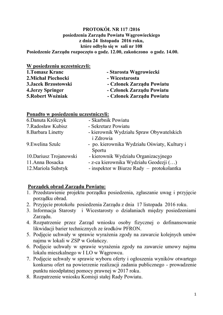 PROTOKÓŁ NR 117 /2016 posiedzenia Zarządu Powiatu Wągrowieckiego z dnia 24 listopada 2016 roku, które odbyło się w sali nr 108 Posiedzenie Zarządu rozpoczęto o godz. 12.00, zakończono o godz. 14.00. W posiedzeniu uczestniczyli: 1.Tomasz Kranc 2.Michał Piechocki 3.Jacek Brzostowski 4.Jerzy Springer 5.Robert Woźniak - Starosta Wągrowiecki - Wicestarosta - Członek Zarządu Powiatu - Członek Zarządu Powiatu - Członek Zarządu Powiatu Ponadto w posiedzeniu uczestniczyli: 6.Danuta Królczyk - Skarbnik Powiatu 7.Radosław Kubisz - Sekretarz Powiatu 8.Barbara Linetty - kierownik Wydziału Spraw Obywatelskich i Zdrowia 9.Ewelina Szulc - po. kierownika Wydziału Oświaty, Kultury i Sportu 10.Dariusz Trojanowski - kierownik Wydziału Organizacyjnego 11.Anna Bosacka - z-ca kierownika Wydziału Geodezji (…) 12.Mariola Substyk - inspektor w Biurze Rady – protokolantka Porządek obrad Zarządu Powiatu: 1. Przedstawienie projektu porządku posiedzenia, zgłaszanie uwag i przyjęcie porządku obrad. 2. Przyjęcie protokołu posiedzenia Zarządu z dnia 17 listopada 2016 roku. 3. Informacja Starosty i Wicestarosty o działaniach między posiedzeniami Zarządu. 4. Rozpatrzenie przez Zarząd wniosku osoby fizycznej o dofinansowanie likwidacji barier technicznych ze środków PFRON. 5. Podjęcie uchwały w sprawie wyrażenia zgody na zawarcie kolejnych umów najmu w lokali w ZSP w Gołańczy. 6. Podjęcie uchwały w sprawie wyrażenia zgody na zawarcie umowy najmu lokalu mieszkalnego w I LO w Wągrowcu. 7. Podjęcie uchwały w sprawie wyboru oferty i ogłoszenia wyników otwartego konkursu ofert na powierzenie realizacji zadania publicznego - prowadzenie punktu nieodpłatnej pomocy prawnej w 2017 roku. 8. Rozpatrzenie wniosku Komisji stałej Rady Powiatu. 1 9. Podjęcie uchwały w sprawie wkładu niepieniężnego z tytułu użytkowania pomieszczeń usytuowanych w Starostwie Powiatowym w Wągrowcu na potrzeby realizacji projektu partnerskiego pt.: „Zdecyduj o sobie – zdobądź dotacje na założenie firmy”. 10.Podjęcie uchwały w sprawie powołania Komisji Odbioru wykonanych w 2016 roku prac konserwatorskich, restauratorskich i robót budowlanych przy zabytku wpisanym do rejestru zabytków położonym na terenie Powiatu Wągrowieckiego. 11.Ustalenie działań związanych w obchodami 100. rocznicy Powstania Wielkopolskiego. 12.Uwagi i wnioski . 13.Ustalenie terminu następnego posiedzenia Zarządu. Ad 1 Odczytano i bez uwag przyjęto porządek posiedzenia Zarządu. Ad 2 Bez uwag przyjęto protokół z posiedzenia Zarządu z dnia 17 listopada 2016 r. Ad 3 Starosta uczestniczył w : wieczorze poezji na rzecz hospicjum , który odbył się w ZSP nr 2 w Wągrowcu, otwarciu przeglądu teatrów szkolnych „Kurtyna 2016”, posiedzeniu Kapituły Złota Pieczęć 2016, uroczystościach związanych z obchodami Dnia Samorządowca, spotkaniu z okazji Dnia Pracownika Socjalnego, Konwencie Starostów , który odbywał się w Pile, spotkaniu z p. G. Wróblewską z Regionalnej Izby Obrachunkowej w Poznaniu , posiedzeniu Komisji Bezpieczeństwa i Komunikacji, akcji pn. „ Szlachetna Paczka”, rozmowach z Burmistrzem M i G Skoki dotyczących inwestycji drogowych w Skokach m.in. ul. Antoniewska. Wicestarosta uczestniczył w : zakończeniu przeglądu teatrów szkolnych „Kurtyna 2016”, posiedzeniu komisji w Powiatowym Urzędzie Pracy w sprawie podziału środków finansowych na utworzenie nowych miejsc pracy oraz utworzenie nowych stanowisk pracy, posiedzeniu Kapituły Złota Pieczęć, 2 uroczystości związanej z Narodowym Świętem Niepodległości, rozpoczęciu turnieju piłkarskiego, uroczystości związanej z obchodami 70. lecia pszczelarzy w Łeknie, mszy świętej poświęconej parafii pw. św. J. Apostoła w Wągrowcu, spotkaniu z okazji Dnia Pracownika Socjalnego, posiedzeniu Komisji Finansów, Obszarów Wiejskich i Strategii Rozwoju Powiatu, konferencji w sprawie bezpieczeństwa (partnerstwo publiczno-prywatne), konsultacjach w sprawie obligacji . Członek Zarządu J. Brzostowski uczestniczył posiedzeniu komisji w Powiatowym Urzędzie Pracy w sprawie podziału środków finansowych na utworzenie nowych miejsc pracy i utworzenie nowych stanowisk pracy, posiedzeniu Komisji Edukacji (…). Członek Zarządu J. Springer uczestniczył w uroczystości związanej z obchodami Dnia Samorządowca, podsumowaniu akcji Honorowy Dawca Krwi, uczestniczył w podsumowaniu i ocenie prac konkursowych na projekt breloczka o tematyce antynarkotykowej oraz na plakat pn. Stop Dopalaczom, uczestniczył w posiedzeniu Komisji Finansów,(…). Członek Zarządu R. Woźniak uczestniczył w wieczorze poezji na rzecz hospicjum, który odbył się w ZSP nr 2 w Wągrowcu , uczestniczy w posiedzeniu komisji w Powiatowym Urzędzie Pracy w sprawie podziału środków finansowych na utworzenie nowych miejsc pracy oraz i utworzenie nowych stanowisk pracy, brał udział w uroczystości z okazji Dnia Samorządowca oraz uczestniczył w posiedzeniu Komisji Edukacji (…). Ad 4 Zarząd Powiatu pozytywnie jednomyślnie 5 za rozpatrzył wniosek osoby fizycznej o dofinansowanie likwidacji barier technicznych ze środków PFRON. Wniosek omówił A. Szyper, referent w Powiatowym Centrum Pomocy Rodzinie w Wągrowcu. Wniosek jest załącznikiem nr 1 do protokołu. Ad 5 Zarząd Powiatu jednomyślnie 5 za podjął uchwałę w sprawie wyrażenia zgody na zawarcie kolejnych umów najmu w lokali w ZSP w Gołańczy, którą omówiła A. Bosacka, z-ca kierownika Wydziału Geodezji (…). 3 Uchwała jest załącznikiem nr 2 do protokołu. Ad 6 Zarząd Powiatu jednomyślnie 5 za, podjął uchwałę w sprawie wyrażenia zgody na zawarcie umowy najmu lokalu mieszkalnego w I LO w Wągrowcu, którą omówiła A. Bosacka , z-ca kierownika Wydziału Geodezji (…). Podjęta uchwała jest załącznikiem nr 3 do protokołu. Ad 7 Zarząd Powiatu po naniesieniu poprawek jednomyślnie 5 za podjął uchwałę w sprawie wyboru oferty i ogłoszenia wynik