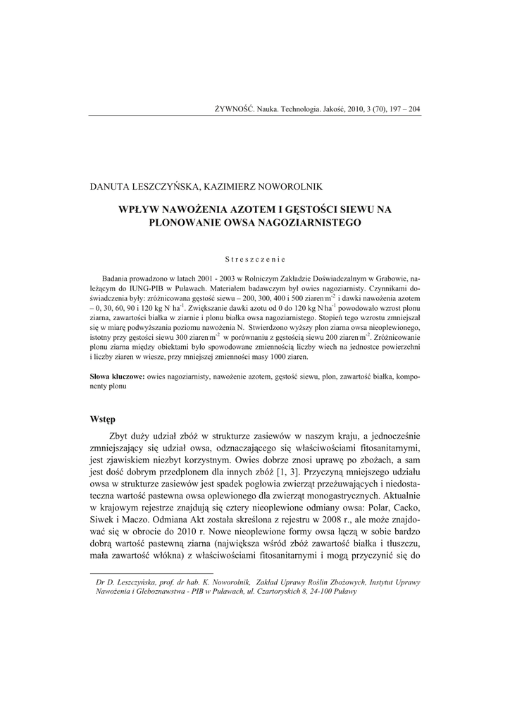 ŻYWNOŚĆ. Nauka. Technologia. Jakość, 2010, 3 (70), 197 – 204 DANUTA LESZCZYŃSKA, KAZIMIERZ NOWOROLNIK WPŁYW NAWOŻENIA AZOTEM I GĘSTOŚCI SIEWU NA PLONOWANIE OWSA NAGOZIARNISTEGO Streszczenie Badania prowadzono w latach 2001 - 2003 w Rolniczym Zakładzie Doświadczalnym w Grabowie, należącym do IUNG-PIB w Puławach. Materiałem badawczym był owies nagoziarnisty. Czynnikami doświadczenia były: zróżnicowana gęstość siewu – 200, 300, 400 i 500 ziaren.m-2 i dawki nawożenia azotem – 0, 30, 60, 90 i 120 kg N. ha-1. Zwiększanie dawki azotu od 0 do 120 kg N.ha-1 powodowało wzrost plonu ziarna, zawartości białka w ziarnie i plonu białka owsa nagoziarnistego. Stopień tego wzrostu zmniejszał się w miarę podwyższania poziomu nawożenia N. Stwierdzono wyższy plon ziarna owsa nieoplewionego, istotny przy gęstości siewu 300 ziaren.m-2 w porównaniu z gęstością siewu 200 ziaren.m-2. Zróżnicowanie plonu ziarna między obiektami było spowodowane zmiennością liczby wiech na jednostce powierzchni i liczby ziaren w wiesze, przy mniejszej zmienności masy 1000 ziaren. Słowa kluczowe: owies nagoziarnisty, nawożenie azotem, gęstość siewu, plon, zawartość białka, komponenty plonu Wstęp Zbyt duży udział zbóż w strukturze zasiewów w naszym kraju, a jednocześnie zmniejszający się udział owsa, odznaczającego się właściwościami fitosanitarnymi, jest zjawiskiem niezbyt korzystnym. Owies dobrze znosi uprawę po zbożach, a sam jest dość dobrym przedplonem dla innych zbóż [1, 3]. Przyczyną mniejszego udziału owsa w strukturze zasiewów jest spadek pogłowia zwierząt przeżuwających i niedostateczna wartość pastewna owsa oplewionego dla zwierząt monogastrycznych. Aktualnie w krajowym rejestrze znajdują się cztery nieoplewione odmiany owsa: Polar, Cacko, Siwek i Maczo. Odmiana Akt została skreślona z rejestru w 2008 r., ale może znajdować się w obrocie do 2010 r. Nowe nieoplewione formy owsa łączą w sobie bardzo dobrą wartość pastewną ziarna (największa wśród zbóż zawartość białka i tłuszczu, mała zawartość włókna) z właściwościami fitosanitarnymi i mogą przyczynić się do Dr D. Leszczyńska, prof. dr hab. K. Noworolnik, Zakład Uprawy Roślin Zbożowych, Instytut Uprawy Nawożenia i Gleboznawstwa - PIB w Puławach, ul. Czartoryskich 8, 24-100 Puławy 198 Danuta Leszczyńska, Kazimierz Noworolnik wzrostu powierzchni uprawy owsa [2, 5]. Stwierdzono zbliżony plon ziarna nieoplewionej odmiany Akt do plonu owsa oplewionego po odliczeniu łuski, jak również zbliżony zbiór białka i energii metabolicznej netto [4, 8, 9, 10, 14, 16]. Z uwagi na odmienny genotyp forma nagoziarnista owsa może wykazywać inne wymagania co do niektórych czynników agrotechnicznych w stosunku do formy oplewionej. W doświadczalnictwie terenowym województwa podlaskiego porównano reakcję nagoziarnistych odmian owsa (Akt, STH 3997) z odmianą oplewioną (Skrzat) na poziom nawożenia azotem [8] i na gęstość siewu [9]. Większą efektywność dużej dawki 90 kg N.ha-1, a mniejszą niższych dawek 30 i 60 kg N.ha-1 zaobserwowano w przypadku owsa nagoziarnistego w porównaniu z owsem oplewionym. W wymienionych badaniach stwierdzono dodatnią reakcję nagoziarnistej odmiany Akt na dużą gęstość siewu – 650 ziaren.m-2, podczas gdy owies oplewiony plonował podobnie przy gęstościach 550 i 650 ziaren.m-2. W dostępnej literaturze brak jest informacji dotyczących współdziałania nawożenia azotem z gęstością siewu na plonowanie owsa nagoziarnistego. Celem badań było określenie wpływu nawożenia azotem i gęstości siewu na plon ziarna, komponenty plonu, zawartość białka w ziarnie i plon białka owsa nagoziarnistego. Materiał i metody badań W latach 2001 - 2003 przeprowadzono dwuczynnikowe doświadczenie polowe z owsem nagoziarnistym (odmiana Akt) w RZD IUNG - PIB Grabów. Pierwszym czynnikiem doświadczenia była gęstość siewu: 200, 300, 400 i 500 ziaren.m-2, a drugim dawka azotu: 0, 30, 60, 90 i 120 kg N.ha-1. Doświadczenie zakładano na glebie kompleksu żytniego bardzo dobrego, o składzie granulometrycznym piasku gliniastego lekkiego zalegającego na glinie lekkiej. Przedplonem był jęczmień jary, a doświadczenie założono metodą losowanych podbloków, w 4 powtórzeniach. Gleba wykazywała wysoką zasobność w P i średnią zasobność w K i Mg. Nawożenie podstawowe stosowano w ilości: 50 kg P2O5 i 90 kg K2O ·ha-1. Owies wysiewano w terminie 5 - 18 kwietnia. Ochrona owsa była zgodna z zaleceniami IOR-PIB. Po zbiorze określano plon ziarna i komponenty plonu: liczbę wiech.m-2, liczbę ziaren w wiesze, masę 1000 ziaren oraz zawartość azotu ogólnego w ziarnie (metodą Kjeldahla), przeliczając N x 6,25 i plon białka. Wyniki opracowano statystycznie metodą analizy wariancji. Półprzedziały ufności wyliczono przy zastosowaniu testu Tukey’a. W latach prowadzenia badań wystąpiły niesprzyjające warunki pogodowe dla uprawy owsa. W maju roku 2001 wystąpiła susza, która silnie osłabiła wzrost i rozwój roślin, podobnie było w drugim roku badań (silna susza wystąpiła w maju, a także w trzeciej dekadzie czerwca). Trzeci rok badań charakteryzował się dwukrotnie mniejszymi opadami w miesiącach czerwcu i lipcu niż średnie z wielolecia, co powodowało 199 WPŁYW NAWOŻENIA AZOTEM I GĘSTOŚCI SIEWU NA PLONOWANIE OWSA NAGOZIARNISTEGO masowe więdnięcie roślin. Niekorzystne warunki pogodowe w okresach wegetacji owsa przyczyniły się do niskich plonów. Wyniki i dyskusja Nie stwierdzono istotnego współdziałania nawożenia azotem z gęstością siewu, jak również współdziałań tych czynników z latami badań w zakresie kształtowania plonu ziarna. Istotnie na plon ziarna owsa wpłynęło nawożenie azotem (tab. 1). Uzyskano znaczny wzrost plonu w miarę zwiększania dawki N do 60 kg.ha-1. Stwierdzono istotny wzrost plonu przy zwiększaniu gęstości wysiewu do 300 zia. -2 ren