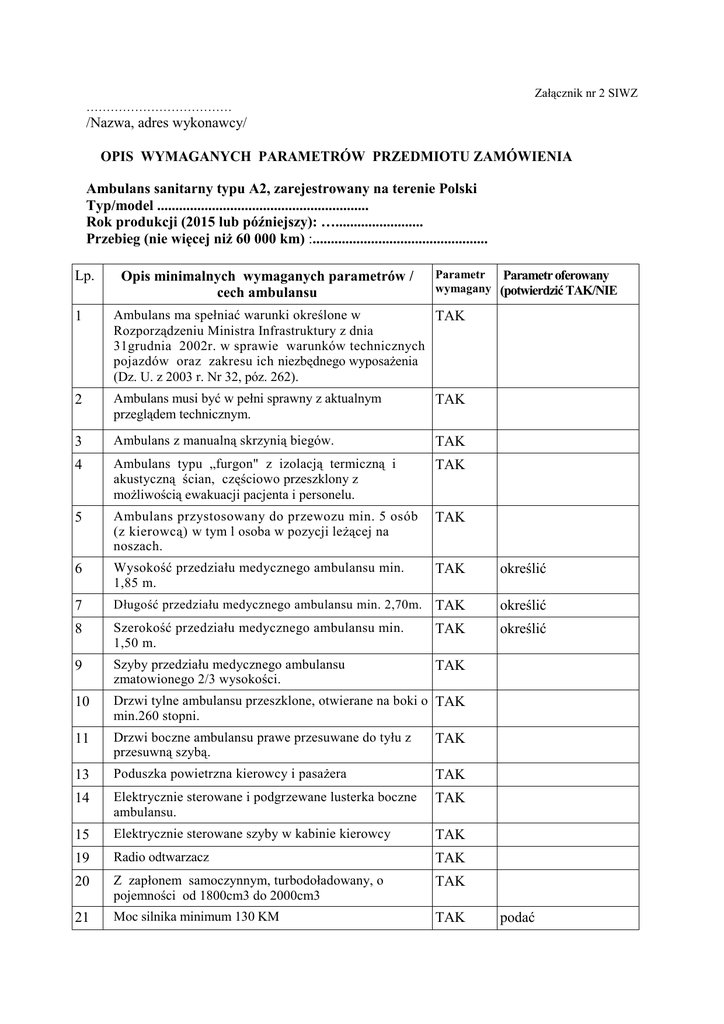 /Nazwa, adres wykonawcy/ OPIS WYMAGANYCH PARAMETRÓW