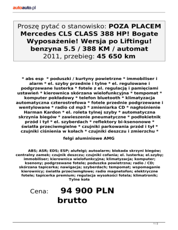 Proszę pytać o stanowisko: POZA PLACEM Mercedes CLS CLASS 388 HP! Bogate Wyposażenie! Wersja po Liftingu! benzyna 5.5 / 388 KM / automat 2011, przebieg: 45 650 km * abs esp * poduszki / kurtyny powietrzne * immobiliser i alarm * el. szyby przednie i tylne * el. regulowane i podgrzewane lusterka * fotele z el. regulacją i pamięciami ustawień * kierownica skórzana wielofunkcyjna * tempomat * komputer pokładowy * telefon bluetooth * klimatyzacja automatyczna czterostrefowa * fotele przednie podgrzewane i wentylowane * radio cd mp3 * zmieniarka CD * nagłośnienie Harman Kardon * el. roleta tylnej szyby * automatyczna skrzynia biegów * zawieszenie pneumatyczne * podłokietnik przód i tył * el. szyberdach * reflektory bi-ksenonowe * światła przeciwmgielne * czujniki parkowania przód i tył * czujniki ciśnienia w kołach * czujniki deszczu i zmierzchu * felgi aluminiowe AMG ABS; ASR; EDS; ESP; alufelgi; autoalarm; blokada skrzyni biegów; centralny zamek; czujnik deszczu; czujniki cofania; el. lusterka; el.szyby; immobiliser; kierownica wielofunkcyjna; klimatyzacja; komputer; ksenony; podgrzewane fotele; poduszka powietrzna; radio / CD; skórzana tapicerka; nawigacja; szyberdach; tempomat; wspomaganie kierownicy; światła przeciwmgłowe; radio magnetofon; elektryczne fotele; tapicerka premium; regulacja wysokości fotela; klimatronik; Tylne koła Cena: 94 900 PLN brutto 1/2 Opiekun: Szymon Więckowski +48 519 022 900 Al. Krakowska 178, Punkt A 2/2