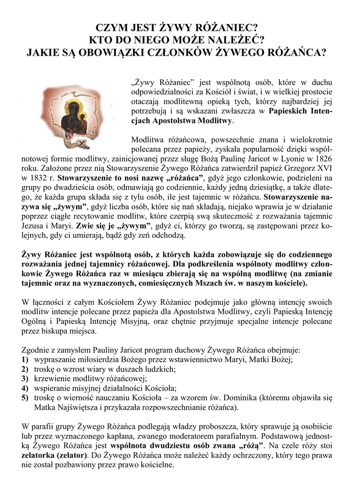 CZYM JEST ŻYWY RÓŻANIEC? KTO DO NIEGO MOŻE NALEŻEĆ? JAKIE SĄ OBOWIĄZKI CZŁONKÓW ŻYWEGO RÓŻAŃCA? „Żywy Różaniec” jest wspólnotą osób, które w duchu odpowiedzialności za Kościół i świat, i w wielkiej prostocie otaczają modlitewną opieką tych, którzy najbardziej jej potrzebują i są wskazani zwłaszcza w Papieskich Intencjach Apostolstwa Modlitwy. Modlitwa różańcowa, powszechnie znana i wielokrotnie polecana przez papieży, zyskała popularność dzięki wspólnotowej formie modlitwy, zainicjowanej przez sługę Bożą Paulinę Jaricot w Lyonie w 1826 roku. Założone przez nią Stowarzyszenie Żywego Różańca zatwierdził papież Grzegorz XVI w 1832 r. Stowarzyszenie to nosi nazwę „różańca”, gdyż jego członkowie, podzieleni na grupy po dwadzieścia osób, odmawiają go codziennie, każdy jedną dziesiątkę, a także dlatego, że każda grupa składa się z tylu osób, ile jest tajemnic w różańcu. Stowarzyszenie nazywa się „żywym”, gdyż liczba osób, które się nań składają, niejako wprawia je w działanie poprzez ciągłe recytowanie modlitw, które czerpią swą skuteczność z rozważania tajemnic Jezusa i Maryi. Zwie się je „żywym”, gdyż ci, którzy go tworzą, są zastępowani przez kolejnych, gdy ci umierają, bądź gdy zeń odchodzą. Żywy Różaniec jest wspólnotą osób, z których każda zobowiązuje się do codziennego rozważania jednej tajemnicy różańcowej. Dla podkreślenia wspólnoty modlitwy członkowie Żywego Różańca raz w miesiącu zbierają się na wspólną modlitwę (na zmianie tajemnic oraz na wyznaczonych, comiesięcznych Mszach św. w naszym kościele). W łączności z całym Kościołem Żywy Różaniec podejmuje jako główną intencję swoich modlitw intencje polecane przez papieża dla Apostolstwa Modlitwy, czyli Papieską Intencję Ogólną i Papieską Intencję Misyjną, oraz chętnie przyjmuje specjalne intencje polecane przez biskupa miejsca. Zgodnie z zamysłem Pauliny Jaricot program duchowy Żywego Różańca obejmuje: 1) wypraszanie miłosierdzia Bożego przez wstawiennictwo Maryi, Matki Bożej; 2) troskę o wzrost wiary w duszach ludzkich; 3) krzewienie modlitwy różańcowej; 4) wspieranie misyjnej działalności Kościoła; 5) troskę o wierność nauczaniu Kościoła – za wzorem św. Dominika (któremu objawiła się Matka Najświętsza i przykazała rozpowszechnianie różańca). W parafii grupy Żywego Różańca podlegają władzy proboszcza, który sprawuje ją osobiście lub przez wyznaczonego kapłana, zwanego moderatorem parafialnym. Podstawową jednostką Żywego Różańca jest wspólnota dwudziestu osób zwana „różą”. Na czele róży stoi zelatorka (zelator). Do Żywego Różańca może należeć każdy ochrzczony, który tego prawa nie został pozbawiony przez prawo kościelne. ZADANIA I OBOWIĄZKI CZŁONKÓW ŻYWEGO RÓŻAŃCA: 1) codzienne rozważanie jednej wyznaczonej tajemnicy (dziesiątki) różańca świętego; opuszczenie tej modlitwy nie sprowadza grzechu ciężkiego; 2) udział w miesięcznym spotkaniu formacyjnym (najczęściej w 1 niedzielę miesiąca) połączonym ze zmianą tajemnic (jeśli zdrowie na to pozwala); 3) uczestnictwo w życiu sakramentalnym Kościoła: regularne przystępowanie do spowiedzi i Komunii świętej; 4) rozszerzanie czci Najświętszej Maryi Panny przykładem życia i działalnością apostolską, zwłaszcza przez krzewienie modlitwy różańcowej; 5) odważne stawanie w obronie wiary; 6) udział w pogrzebie członka Żywego Różańca należącego do tej samej róży. ZADANIA I OBOWIĄZKI ZELATORKI (ZELATORA): 1) troszczy się o prawdziwego ducha modlitwy we wspólnocie; 2) czuwa nad pełnym składem osobowym róży (20 osób) oraz przeprowadza comiesięczną wymianę tajemnic; 3) zachęca członków do gorliwej działalności apostolskiej, także wśród chorych i ubogich; 4) utrzymuje stałą łączność między kapłanem odpowiedzialnym za Żywy Różaniec a różą i między różami; 5) odwiedza chorych członków róży i zmienia im tajemnice w domu; 6) zbiera składki na Mszę świętą, dzieła charytatywne, misje i inne cele (członkowie składają ofiary pieniężne wg swoich możliwości). PRZYWILEJE I ODPUSTY: Każdy z członków Żywego Różańca, na podstawie przywileju udzielonego przez Stolicę Apostolską może zyskać odpust zupełny pod zwykłymi warunkami w dniu: 1) przyjęcia do Stowarzyszenia Żywego Różańca; 2) uroczystości Narodzenia Pańskiego (25 grudnia); 3) uroczystości Zmartwychwstania Pańskiego (Wielkanoc); 4) uroczystości Zwiastowania Pańskiego (25 marca, chyba że przeniesione na inny dzień); 5) uroczystości Wniebowzięcia Najświętszej Maryi Panny (15 sierpnia); 6) wspomnienia Najświętszej Maryi Panny Różańcowej (7 października); 7) uroczystości Niepokalanego Poczęcia Najświętszej Maryi Panny (8 grudnia); 8) święta Ofiarowania Pańskiego (2 lutego). Ponadto, każdy z członków Żywego Różańca uczestniczy w dobrach duchowych Zakonu Dominikanów i uczestniczy w obietnicach Najświętszej Maryi Panny dotyczących tych, którzy odmawiają różaniec. Wszyscy członkowie Żywego Różańca są otoczeni modlitwą pozostałych członków Żywego Różańca, tak za życia, jak i po śmierci.