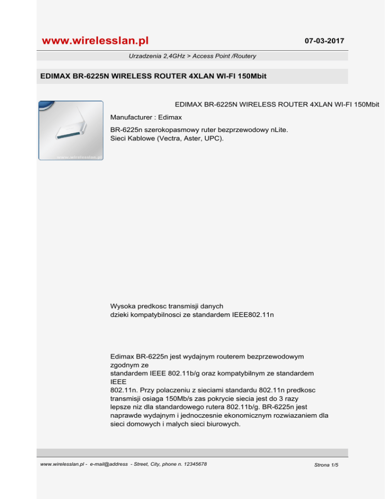 www.wirelesslan.pl 07-03-2017 Urzadzenia 2,4GHz > Access Point /Routery EDIMAX BR-6225N WIRELESS ROUTER 4XLAN WI-FI 150Mbit EDIMAX BR-6225N WIRELESS ROUTER 4XLAN WI-FI 150Mbit Manufacturer : Edimax BR-6225n szerokopasmowy ruter bezprzewodowy nLite. Sieci Kablowe (Vectra, Aster, UPC). Wysoka predkosc transmisji danych dzieki kompatybilnosci ze standardem IEEE802.11n Edimax BR-6225n jest wydajnym routerem bezprzewodowym zgodnym ze standardem IEEE 802.11b/g oraz kompatybilnym ze standardem IEEE 802.11n. Przy polaczeniu z sieciami standardu 802.11n predkosc transmisji osiaga 150Mb/s zas pokrycie siecia jest do 3 razy lepsze niz dla standardowego rutera 802.11b/g. BR-6225n jest naprawde wydajnym i jednoczesnie ekonomicznym rozwiazaniem dla sieci domowych i malych sieci biurowych. www.wirelesslan.pl - e-mail@address - Street, City, phone n. 12345678 Strona 1/5 www.wirelesslan.pl 07-03-2017 Szerokie mozliwosci wspoldzielenia polaczenia internetowego Dzieki wbudowanej funkcji NAT (translacja adresow) Edimax BR-6225n pozwala na wspoldzielenie polaczenia internetowego przez maksymalnie 253 uzytkownikow podlaczonych przewodowo badz bezprzewodowo. Zdalny badz lokalny system zarzadzania System zarzadzania Edimax EZView pozwala na zmiane ustawien rutera zarowno z poziomu sieci LAN jak i za posrednictwem internetu. Urzadzenia kompatybilne z UpnP sa automatycznie wykrywane zas informacje o nich mozna uzyskac za posrednictwem interfejsu rutera. Dzieki temu mozliwa jest latwa zmiana ich adresow IP, zarzadzanie przydzialem pasma, otwieranie portow lub dodawanie urzadzen do DMZ. Obsluga trybu polaczenia WISP (bezprzewodowy ISP) Urzadzenie moze zostac podlaczone do punktu dostepu dostawcy internetu za posrednictwem sieci bezprzewodowej. Dzialajac w takim trybie BR-6225n pozwala nie tylko na podlaczenie klientow przewodowych ale rowniez tworzy siec bezprzewodowa udostepniajac w ten www.wirelesslan.pl - e-mail@address - Street, City, phone n. 12345678 Strona 2/5 www.wirelesslan.pl 07-03-2017 sposob internet wszystkim klientom bezprzewodowym. Latwa w uzyciu, wielojezyczna plyta konfiguracyjna* Na dolaczonej plycie CD znajduje sie unikalny, wielojezyczny kreator konfiguracji. Poprzez proste podazanie za animowanymi wskazowkami uzytkownik moze w ciagu kilku minut skonfigurowac polaczenie internetowe! Praktyczny sprzetowy wylacznik sieci bezprzewodowej oraz przycisk WPS (Wi-Fi Protected Setup) Edimax BR-6225n jest wyposazony w przelacznik WPS oraz wylacznik sieci bezprzewodowej. Dzieki temu mozna latwo kontrolowac dzialanie sieci bezprzewodowej oraz konfigurowac jej zabezpieczenia. Czasowe wylaczenie sieci bezprzewodowej jest mozliwe bez ingerencji w ustawienia rutera za posrednictwem jego panelu konfiguracyjnego.* Plyta instalacyjna EZmax obsluguje jedynie rutery Edimax. www.wirelesslan.pl - e-mail@address - Street, City, phone n. 12345678 Strona 3/5 www.wirelesslan.pl 07-03-2017 Zgodnosc ze standardami bezprzewodowymi 802.11g and 802.11b Wbudowany sprzetowy wylacznik sieci bezprzewodowej Kompatybilnosc ze standardem 802.11n - predkosc do 150Mb/s Obsluga trybu WISP (bezprzewodowy ISP) Wielojezyczny kreator EZmax Obsluga EZView www.wirelesslan.pl - e-mail@address - Street, City, phone n. 12345678 Strona 4/5 www.wirelesslan.pl 07-03-2017 Obsluga WMM, WEP, WPA, WPA2, DDNS, QoS, filtrowania IP/MAC, DMZ oraz Virtual Server www.wirelesslan.pl - e-mail@address - Street, City, phone n. 12345678 Strona 5/5