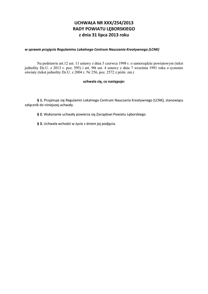 UCHWAŁA NR XXX/254/2013 RADY POWIATU LĘBORSKIEGO z dnia 31 lipca 2013 roku w sprawie przyjęcia Regulaminu Lokalnego Centrum Nauczania Kreatywnego (LCNK) Na podstawie art.12 ust. 11 ustawy z dnia 5 czerwca 1998 r. o samorządzie powiatowym (tekst jednolity Dz.U. z 2013 r. poz. 595) i art. 90t ust. 4 ustawy z dnia 7 września 1991 roku o systemie oświaty (tekst jednolity Dz.U. z 2004 r. Nr 256, poz. 2572 z późn. zm.) uchwala się, co następuje: § 1. Przyjmuje się Regulamin Lokalnego Centrum Nauczania Kreatywnego (LCNK), stanowiący załącznik do niniejszej uchwały. § 2. Wykonanie uchwały powierza się Zarządowi Powiatu Lęborskiego § 3. Uchwała wchodzi w życie z dniem jej podjęcia. Załącznik Nr 1 do uchwały Nr XXX/254/2013 Rady Powiatu Lęborskiego z dnia 31 lipca 2013 roku REGULAMIN Lokalnego Centrum Nauczania Kreatywnego (LCNK) Ilekroć w Regulaminie Lokalnego Centrum Nauczania Kreatywnego mówi się o: 1) Powiecie - należy przez to rozumieć Powiat Lęborski, 2) Programie – należy przez to rozumieć lokalny program wspierania edukacji uzdolnionych dzieci i młodzieży o szczególnych predyspozycjach w zakresie matematyki, fizyki i informatyki, pod nazwą: Zdolni z Powiatu Lęborskiego 3) Projekcie „Zdolni z Pomorza” – należy przez to rozumieć projekt „Pomorskie - dobry kurs na edukację. Wspieranie uczniów o szczególnych predyspozycjach w zakresie matematyki, fizyki i informatyki”, finansowanym ze Środków Europejskiego Funduszu Społecznego i budżetu państwa, w ramach Programu Operacyjnego Kapitał Ludzki 2007-2013, Priorytet IX Rozwój wykształcenia i kompetencji w regionach, 4) LCNK – należy przez to rozumieć Lokalne Centrum Nauczania Kreatywnego, które działa w Zespole Szkół Mechaniczno - Informatycznych w Lęborku, 5) RCNK – należy przez to rozumieć Regionalne Centrum Nauczania Kreatywnego, 6) PPP - należy przez to rozumieć Poradnię Psychologiczno-Pedagogiczną, 7) APN – autorski program nauczania, 8) ZSM-I w Lęborku – Zespół Szkół Mechaniczno – Informatycznych w Lęborku. § 1 Cele działania LCNK Głównym celem działania funkcjonującego przy ZSM-I w Lęborku LCNK jest tworzenie warunków do kreatywnego nauczania i uczenia się, do podnoszenia poziomu wiedzy i umiejętności ucznia uzdolnionego w zakresie matematyki, fizyki i informatyki, oraz wspieranie jego harmonijnego rozwoju, w szczególności poprzez: a) prowadzenie zajęć pozalekcyjnych w siedzibie LCNK i poza nią, według autorskich programów z zestawów zadań przygotowanych przez ekspertów z wyższych uczelni, b) objęcie ucznia, rodzica i nauczyciela pomocą i/lub opieką psychologiczno-pedagogiczną, c) zagwarantowanie uczniowi merytorycznego wsparcia nauczyciela, pracownika LCNK oraz uczelni wyższej, d) zajęcia na portalu edukacyjnym z platformą e-learningową i modułem InfoZadania, likwidującą bariery komunikacyjne w dostępie do wiedzy i informacji, z możliwością korzystania z ekonsultacji, e) organizowanie wycieczek dydaktycznych, odpowiadających indywidualnym zainteresowaniom ucznia uzdolnionego, f) umożliwienie korzystania z pracowni przedmiotowych i pomocy naukowych, wychodzących naprzeciw zainteresowaniom uczniów, g) budowanie indywidualnej ścieżki edukacyjno-zawodowej ucznia uzdolnionego w oparciu o współpracę z uczelniami i pracodawcami. § 2 Zadania LCNK: 1. zorganizowanie i przeprowadzenie rekrutacji uczniów uzdolnionych we współpracy z PPP, 2. prowadzenie powiatowej bazy uzdolnionych uczniów i nauczycieli przygotowanych do pracy z takimi uczniami, 3. dostosowanie regulaminu pracy LCNK do warunków instytucji, przy której działa (w tym organizacji zajęć i ich harmonogramu, zasad współpracy uczestników zajęć i nauczycieli, zasad udziału rodziców w pracach LCNK itp.), 4. współdziałanie z Regionalnym Centrum Nauczania Kreatywnego (RCNK) w takich obszarach, jak m.in. doskonalenie nauczycieli w zakresie pracy z uczniem uzdolnionym, korzystanie z portalu edukacyjnego i platformy e-learningowej, proces diagnozy uczniów, organizacja spotkań akademickich i obozów naukowych, 5. organizowanie atrakcyjnych form edukacyjnych poza siedzibą LCNK (konferencje i spotkania), 6. współpraca ze środowiskiem naukowym (wykłady, projekty), 7. poszerzanie bazy materiałów dydaktycznych zamieszczanych na portalu edukacyjnym, 8. wsparcie psychologiczno-pedagogiczne dla rodziców i uczniów uzdolnionych, 9. współpraca ze szkołami i innymi LCNK oraz placówkami edukacyjnymi, 10. organizowanie wycieczek edukacyjnych do miejsc i zakładów pracy, wdrażających nowoczesne rozwiązania techniczno-technologiczne, 11. współpraca z samorządami lokalnymi i podmiotami społecznymi – partnerami Programu, 12. promowanie działalności LCNK wśród jst, rodziców i uczniów wszystkich typów szkół z terenu powiatu lęborskiego. § 3 Organizacja LCNK 1. W LCNK zatrudniony jest koordynator, który kieruje jego pracą. 2. Organizacja zajęć 1) praca w LCNK przebiega wg ustalonego przez koordynatora, w porozumieniu z dyrektorem szkoły, planu zajęć, w grupach, liczących nie mniej niż 5 uczestników, 2) organizacja przewiduje 3 możliwe koła (matematyczne, fizyczne i informatyczne), na poziomie gimnazjum i 3 koła (matematyczne, fizyczne i informatyczne), na poziomie szkoły ponadgimnazjalnej, 3) zajęcia z informatyki odbywają się w wymiarze 60 godzin, 4) zajęcia z matematyki i fizyki odbywają się w łącznym wymiarze 43 godzin z matematyki i 43 godzin z fizyki, 5) w roku szkolnym uczniowie uczestniczą w spotkaniach akademickich, 6) LCNK umożliwia korzystanie z nieobowiązkowych dla uczniów zajęć na portalu prowadzonym przez RCNK takich jak: Liga Zadaniowa, e-seminaria, e-konsultacje, kursy e-learningowe. 2. LCNK może realizować swoje zadania poza siedzibą. 3. Udział uczestników w zajęciach jest dobrowolny. 4. Nauczyciel prowadzący zajęcia dokumentuje ich przebieg oraz obecność uczestników w opa
