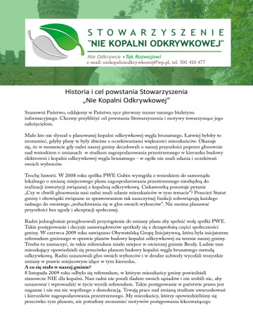 e-mail: [email protected], tel. 501 410 477 Historia i cel powstania Stowarzyszenia „Nie Kopalni Odkrywkowej” Szanowni Państwo, oddajemy w Państwa ręce pierwszy numer naszego biuletynu informacyjnego. Chcemy przybliżyć cel powstania Stowarzyszenia i motywy towarzyszące jego założycielom. Mało kto nie słyszał o planowanej kopalni odkrywkowej węgla brunatnego. Łatwiej byłoby to zrozumieć, gdyby plany te były zbieżne z oczekiwaniami większości mieszkańców. Okazuje się, że w momencie gdy radni naszej gminy decydowali o naszej przyszłości poprzez głosownie nad wnioskiem o zmianach w studium zagospodarowania przestrzennego w kierunku budowy elektrowni i kopalni odkrywkowej węgla brunatnego - w ogóle nie znali zdania i oczekiwań swoich wyborców. Trochę historii. W 2008 roku spółka PWE Gubin wystąpiła z wnioskiem do samorządu lokalnego o zmianę miejscowego planu zagospodarowania przestrzennego niezbędną do realizacji inwestycji związanej z kopalnią odkrywkową. Ciekawostką pozostaje pytanie „Czy w chwili głosowania nasi radni znali zdanie mieszkańców w tym temacie”? Przecież Statut gminy i obowiązki związane ze sprawowaniem tak zaszczytnej funkcji zobowiązują każdego radnego do swoistego „wsłuchiwania się w głos swoich wyborców”. Nie można planować przyszłości bez zgody i akceptacji społecznej. Radni jednogłośnie przegłosowali przystąpienie do zmiany planu aby spełnić wolę spółki PWE. Takie postępowanie i decyzje samorządowców spotkały się z dezaprobatą części społeczności gminy. W czerwcu 2009 roku zawiązano Obywatelską Grupę Inicjatywną, która była inicjatorem referendum gminnego w sprawie planów budowy kopalni odkrywkowej na terenie naszej gminy. Trzeba tu zaznaczyć, że takie referendum miało miejsce w ościennej gminie Brody. Ludzie tam mieszkający opowiedzieli się przeciwko planom budowy kopalni węgla brunatnego metodą odkrywkową. Radni uszanowali głos swoich wyborców i w drodze uchwały wycofali wszystkie zmiany w prawie miejscowym idące w tym kierunku. A co się stało w naszej gminie? 8 listopada 2009 roku odbyło się referendum, w którym mieszkańcy gminy powiedzieli stanowcze NIE dla kopalni. Nasi radni nie poszli śladem swoich sąsiadów i nie zrobili nic, aby uszanować i wprowadzić w życie wynik referendum. Takie postępowanie w państwie prawa jest naganne i nie ma nic wspólnego z demokracją. Trwają prace nad zmianą studium uwarunkowań i kierunków zagospodarowania przestrzennego. My mieszkańcy, którzy opowiedzieliśmy się przeciwko tym planom, nie potrafimy zrozumieć motywów postępowania lekceważącego wolę zdecydowanej większości mieszkańców. Pozostaje nam tylko sfera domysłów. W momencie, kiedy wszystkie próby wprowadzenia w życie wyników referendum nie przyniosły rezultatu, postanowiliśmy zawiązać Stowarzyszenie „Nie Kopalni Odkrywkowej”. Słowo „Nie” w nazwie Stowarzyszenia należy rozumieć szerzej, niż tylko w odniesieniu do tej inwestycji „Nie” oznacza w naszym przypadku, brak akceptacji dla metod sprawowania władzy w naszej gminie, narzucania odgórnych decyzji wbrew woli większości mieszkańców. „Nie” dlatego, że istnieją inne nowocześniejsze metody uzyskiwania energii. „Nie” ponieważ, długoterminowe wizje na rozwój gminy w oparciu o budowę kopalni odkrywkowej są utopijne i krótkowzroczne. 30-40 lat wydobycia o potem po zakończeniu eksploatacji swoista „bomba ekologiczno-społeczna”. Popatrzmy na nasz Górny Śląsk. Nikt nie ma pomysłu jaka ma być przyszłość tego regionu, czy nas czeka to samo? „Nie”kłamstwom i mitom o dobrobycie czekającym nas w przypadku realizacji inwestycji. „Nie” to także lepsza inwestycja w przyszłość. Paradoksalne, ale realne, chcemy wskazywać inne możliwei przyjazne dla ludzi i środowiska możliwości rozwoju. Przez ostatnie dziesięciolecia przespano niejedną szansę, spójrzmy na powiat żarski całkiem niedaleko, a zarazem jak daleko. „Nie” to zielone światło dla wszystkich działań i decyzji akceptowalnych przez społeczeństwo, a zarazem stanowczy sprzeciw przeciwko łamaniu tej zasady. Dorota Prugar-Wasielewska Nasze cele statutowe Chcąc mieć realny wpływ na kształtowanie naszej przyszłości wyznaczyliśmy sobie bardzo ambitne cele do jakich chcemy dążyć. Myślimy, że przy Państwa pomocy uda nam się wspólnie je zrealizować. Główne nasze zamierzenia to: 1. Z ablokowanie budowy odkrywki kopalni węgla brunatnego na Złożu Gubińskim jako niosącej za sobą niepoliczalne szkody społeczne, środowiskowe i finansowe. 2. Ochrona praw i interesów mieszkańców gminy wiejskich Gubin w przypadku realizacji inwestycji, w szczególności w sprawach odszkodowań i wysiedleń. 3. G romadzenie i przekazywanie mieszkańcom rzetelnych informacji na temat wszystkich prac dotyczących kopalni odkrywkowej i wszystkich zagrożeń jej towarzyszących. 4. W spółpraca z organami rządowymi, samorządowymi i innymi celem wypracowania alternatywnych wizji rozwoju, biorących pod uwagę czynnik społeczny, środowisko naturalne i położenie geopolityczne naszej gminy. 5. Propagowanie proekologicznych zachowań, rozwiązań i technologii. 6. Inspirowanie i wspieranie aktywności obywatelskiej w dziedzinie ochrony środowiska. 7. D ziałania na rzecz zrównoważonego rozwoju obszarów wiejskich, w tym w szczególności zapobieganie bezrobociu poprzez promocję i wspieranie działalności gospodarczej prowadzonej z uwzględnieniem wymogów ochrony środowiska. 8. D ziałania na rzecz rozwoju lokalnych produktów bazujących na walorach środowiska i lokalnej tradycji. 9. D ziałania na rzecz wspierania i wdrażania rolnictwa ekologicznego, programów rolnośrodowiskowych oraz agroturystyki. 10. Zapobieganie marnotrawstwu surowców oraz niewłaściwemu zagospodarowaniu i utylizacji. 11. Działania na rzecz budowy społeczeństwa obywatelskiego 