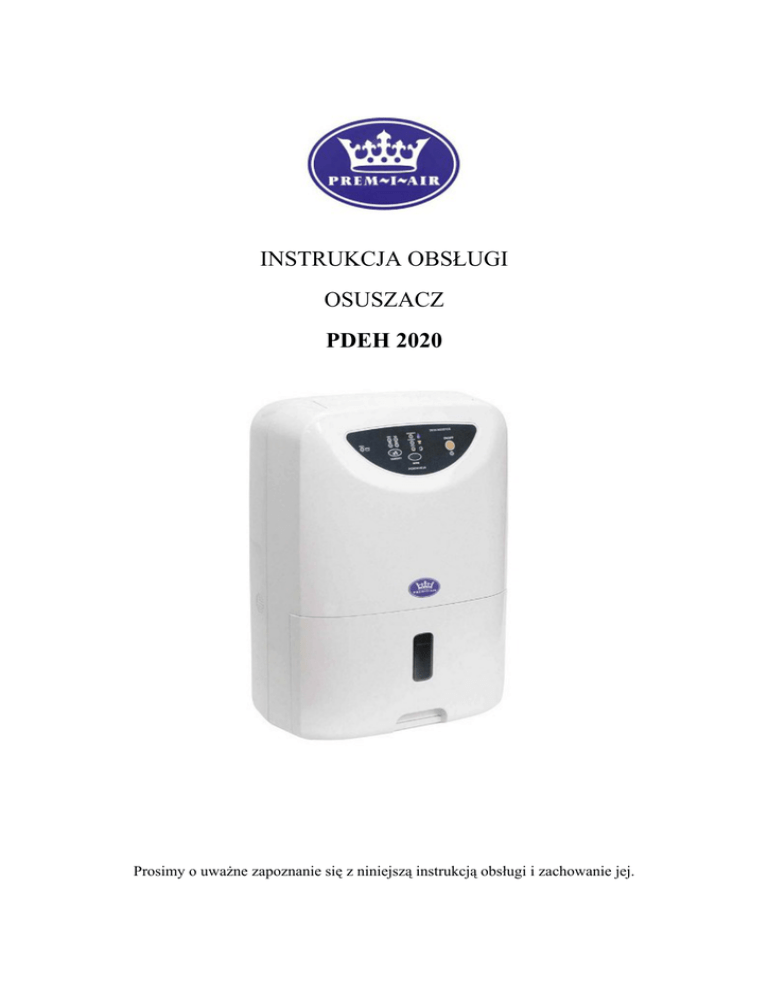 INSTRUKCJA OBSŁUGI OSUSZACZ PDEH 2020 Prosimy o uważne zapoznanie się z niniejszą instrukcją obsługi i zachowanie jej. PAMIĘTAJ! Urządzenie przechodzi automatycznie w tryb „PRANIE” jeśli temperatura jest niższa lub równa 12°C. W tych warunkach urządzenie jest w stanie odszraniania. Nie jest możliwa zmiana trybu pracy dopóki temperatura w pomieszczeniu nie wzrośnie powyżej 12°C. Zasady bezpieczeństwa Poniższe zasady bezpieczeństwa powinny być przeczytane i zachowane przed użyciem urządzenia. Podczas używania urządzeń elektrycznych, powinny być zawsze zachowane następujące środki ostrożności: 1. Transport i przechowywanie powinno się odbywać w pozycji pionowej. Przed pierwszym uruchomieniem lub po transporcie, urządzenie powinno stać w normalnej pozycji przez ok. 3 godz. 2. Zawsze ustawiaj urządzenie na poziomej powierzchni. 3. Urządzenie pracuje w pomieszczeniach o temperaturze od 2°C do 39°C. 4. Upewnij się, że wlot i wylot powietrza nie są zakryte lub zablokowane. Nie ustawiaj urządzenia blisko zasłon lub innych obiektów. Zaleca się odstęp minimum 0,5 m. 5. Podczas suszenia pranie powinno być rozwieszone w bezpiecznej odległości aby skapująca woda nie spadała na urządzenie. 6. Podczas pracy urządzenia nie kładź niczego na jego wierzchu, niczym go nie przykrywaj. 7. Urządzenie jest przeznaczone do użytku domowego i biurowego. Urządzenie nie ma zastosowania przemysłowego, nie powinno być również używane na zewnątrz pomieszczeń. 8. W celu zapobieżenia wstrząsowi elektrycznemu nie należy zanurzać urządzenia, wtyczki lub przewodu w wodzie, lub rozpylać płynów na urządzenie. 9. NIE WOLNO używać urządzenia z uszkodzoną wtyczką lub kablem przyłączeniowym gdyż grozi to porażeniem przez prąd elektryczny. Wymianę ich należy zlecić uprawnionym osobom. 10. NIE używaj wtyczki do włączania lub wyłączania urządzenia. Zawsze używaj do tego celu panelu sterującego. 11. Należy upewnić się, że urządzenie jest opróżnione z wody przed wyłączeniem go na dłuższy czas i przechowywaniem. 12. ZAWSZE wyłącz urządzenie i odłącz je od prądu przed czyszczeniem, zmianą miejsca, podnoszeniem itp. 13. Uważnie nadzoruj dzieci i zwierzęta domowe jeśli w pobliżu nich pracuje urządzenie. 14. Przewód zasilający urządzenia nie powinien być przykrywany dywanami lub chodnikami. Należy tak ułożyć przewód aby uniknąć potknięcia. 15. Urządzenie nie powinno pracować lub być przechowywane w bezpośrednim nasłonecznieniu. 16. Urządzenie powinno być naprawiane w autoryzowanym serwisie. Wykonywanie napraw przez nieuprawnione osoby może spowodować uszkodzenie urządzenia, zniszczenie mienia, zranienie osoby i utratę gwarancji. 17. . W przypadku konieczności użycia przedłużaczy elektrycznych lub adapterów wtyczek zawsze sprawdź czy są one odpowiednie dla urządzenia. 2 18. Urządzenie musi być użytkowane tylko z zamontowanymi filtrami. Przed ich czyszczeniem urządzenie należy wyłączyć i wyciągnąć wtyczkę z gniazda elektrycznego. 19. Upewnij się, że urządzenie jest podłączane do gniazda elektrycznego o właściwym napięciu prądu, zgodnie z wartością na tabliczce znamionowej urządzenia. WYMIANA KABLA PRZYŁĄCZENIOWEGO I WTYCZKI W przypadku konieczności wymiany kabla przyłączeniowego lub wtyczki należy ściśle przestrzegać lokalnych przepisów a najlepiej czynność tę zlecić uprawnionej osobie. CZĘŚCI SKŁADOWE PANEL PRZEDNI Uchwyt Wylot powietrza Panel sterujący Czujnik ( nie blokować) Pływak Wizjer Zbiornik 3 PANEL TYLNY Wlot powietrza ( nie blokować) Uchwyt na kabel elektryczny Wiązanie Otwór ciągłego odprowadzania wody Wtyczka Kółka jezdne PANEL KONTROLNY Diody panelu kontrolnego Dioda „FULL”: Pełny zbiornik na wodę Zaświecenie się tej diody sygnalizuje napełnienie zbiornika na wodę lub nieprawidłowe włożenie zbiornika. Jeśli zbiornik jest pełny, należy go wyjąć i opróżnić z wody. W przypadku nieprawidłowego włożenia, zbiornik należy wyjąć i włożyć prawidłowo. Dioda „ON/OFF”: Sygnalizator włączenia/wyłączenia Dioda zaświeci się przy włączeniu urządzenia. Diody trybu pracy: Zaświecenie się poszczególnych diod sygnalizuje poszczególne tryby pracy: Osuszanie „DEHUMIFY”, Pranie „LAUDRY” lub Cichą Pracę „QUIET”. (Zasadniczo poszczególne tryby oznaczją prędkość pracy wentylatora). 4 Diody wskaźnika wilgotności: Zaświecenie się diod „50%”, „60%”, „70%” następuje po wybraniu żądanego poziomu wilgotności przyciskiem „HUMIDITY”. Dioda ciągłego osuszania: Zaświecenie się diody „CONT” następuje po wybraniu ciągłego osuszania przy ciskiem „HUMIDITY”. Wskaźnik wilgotności Poziom wilgotności 50% Mniej niż 60% 60% 60% i więcej ale mniej niż 70% 70% Powyżej 70% Przyciski panelu kontrolnego Przycisk „ON/OFF”: Wciśnięcie przycisku „ON/OFF” w trybie czuwania powoduje włączenie urządzenia. Ponowne przyciśnięcie tego przycisku wyłącza urządzenie. Przycisk „MODE”: Wciśnięcie przycisku „MODE” pozwala na wybranie odpowiedniego trybu pracy. Ustawienia są możliwe w cyklu Osuszanie „DEHUMIFY”, Pranie „LAUDRY” lub Cicha Praca „QUIET”. Po wybraniu zadanego trybu zaświeci się odpowiednia dioda. Przycisk „HUMIDITY”: Przycisk pozwala na wybranie osuszania automatycznego przy osiągnięciu odpowiedniego poziomu wilgotności w pomieszczeniu. Do wyboru są cztery możliwości: „50%”, „60%”, „70%” oraz „CONT”. Po wybraniu żądanego poziomu wilgotności zaświeci się odpowiednia dioda. Po włączeniu urządzenia, osuszacz pracuje automatycznie w trybie osuszania ciągłego „CONT”. Podczas pracy w tym trybie osuszacz wyłączy się automatycznie po napełnieniu zbiornika wodą lub w wyniku braku prądu. Jeśli został wybrany któryś z trybów: „50%”, „60%”, „70%” urządzenie zatrzyma się 