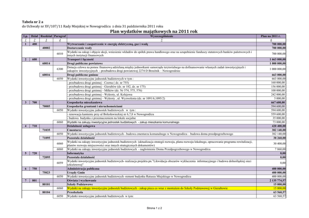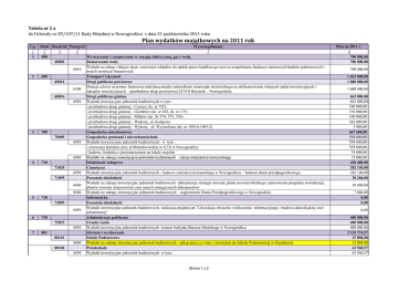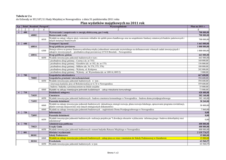 Tabela nr 2 a do Uchwały nr XV/107/11 Rady Miejskiej w Nowogrodźcu z dnia 31 października 2011 roku Plan wydatków majątkowych na 2011 rok Lp. 1 1 2 3 4 5 6 7 Dział Rozdział Paragraf Wyszczególnienie 2 3 4 5 400 Wytwarzanie i zaopatrzenie w energię elektryczną, gaz i wodę 40002 Dostarczanie wody Wydatki na zakup i objęcie akcji, wniesienie wkładów do spółek prawa handlowego oraz na uzupełnienie funduszy statutowych banków państwowych i 6010 innych instytucji finansowych 600 Transport i łączność 60014 Drogi publiczne powiatowe Dotacja celowa na pomoc finansową udzielaną między jednostkami samorządu terytorialnego na dofinansowanie własnych zadań inwestycyjnych i 6300 zakupów inwestycyjnych - przebudowa drogi powiatowej 2274 D Brzeźnik – Nowogrodziec 60016 Drogi publiczne gminne 6050 Wydatki inwestycyjne jednostek budżetowych w tym : - przebudowa drogi gminnej - Czerna ( dz. nr 755) - przebudowa drogi gminnej - Gierałtów (dz. nr 182, dz. nr 175) - przebudowa drogi gminnej - Milków (dz. Nr 574, 575, 576) - przebudowa drogi gminnej - Wykroty, ul. Kolejowa - przebudowa drogi gminnej - Wykroty , ul. Wyzwolenia (dz. nr 1091/6,1095/2) 700 Gospodarka mieszkaniowa 70005 Gospodarka gruntami i nieruchomościami 6050 Wydatki inwestycyjne jednostek budżetowych w tym : - renowacja kamienic przy ul Bolesławieckiej nr 6,7,8 w Nowogrodźcu - budowa budynku z przeznaczeniem na lokale socjalne 6060 Wydatki na zakupy inwestycyjne jednostek budżetowych - zakup mieszkania komunalnego 710 Działalność usługowa 71035 Cmentarze 6050 Wydatki inwestycyjne jednostek budżetowych - budowa cmentarza komunalnego w Nowogrodźcu – budowa domu przedpogrzebowego 71095 Pozostała działalność Wydatki na zakupy inwestycyjne jednostek budżetowych (aktualizacja strategii rozwoju, planu rozwoju lokalnego, opracowanie programu rewitalizacji, 6060 planów rozwoju miejscowości oraz innych strategicznych dokumentów) 6060 Wydatki na zakupy inwestycyjne jednostek budżetowych - nagłośnienie Domu Przedpogrzebowego w Nowogrodźcu 720 Informatyka 72095 Pozostała działalność Wydatki inwestycyjne jednostek budżetowych- realizacja projektu pn.”Likwidacja obszarów wykluczenia informacyjnego i budowa dolnośląskiej sieci 6059 szkieletowej" 750 Administracja publiczna 75023 Urzędy Gmin 6050 Wydatki inwestycyjne jednostek budżetowych -remont budynku Ratusza Miejskiego w Nowogrodźcu 801 Oświata i wychowanie 80101 Szkoły Podstawowe 6060 Wydatki na zakupy inwestycyjne jednostek budżetowych - zakup pieca co wraz z montażem do Szkoły Podstawowej w Gierałtowie 80104 Przedszkola 6050 Wydatki inwestycyjne jednostek budżetowych w tym: Strona 1 z 2 Plan na 2011 r. 6 700 000,00 700 000,00 700 000,00 1 663 000,00 1 000 000,00 1 000 000,00 663 000,00 663 000,00 160 000,00 156 000,00 100 000,00 242 000,00 5 000,00 667 600,00 594 600,00 594 600,00 559 600,00 35 000,00 73 000,00 420 400,00 382 140,00 382 140,00 38 260,00 30 400,00 7 860,00 0,00 0,00 0,00 400 000,00 400 000,00 400 000,00 2 135 774,57 15 000,00 15 000,00 63 560,57 63 560,57 6057 6059 8 851 85154 6050 9 900 90002 6050 6057 6059 90004 6050 90015 6050 90095 10 – przebudowa budynku przedszkola publicznego w Nowogrodźcu w ramach projektu pn.”Współpraca gmin Nowogrodziec i Konigswartha w zakresie inwestycji i edukacji dla rozwoju dzieci" – przebudowa budynku przedszkola publicznego w Nowogrodźcu - budowa ogrodzenia - zakup kuchni elektrycznej, zmywarki i szafy przelotowej Wydatki inwestycyjne jednostek budżetowych – przebudowa budynku przedszkola publicznego w Nowogrodźcu w ramach projektu pn.”Współpraca gmin Nowogrodziec i Konigswartha w zakresie inwestycji i edukacji dla rozwoju dzieci" Wydatki inwestycyjne jednostek budżetowych – przebudowa budynku przedszkola publicznego w Nowogrodźcu w ramach projektu pn.”Współpraca gmin Nowogrodziec i Konigswartha w zakresie inwestycji i edukacji dla rozwoju dzieci" Ochrona zdrowia Przeciwdziałanie alkoholizmowi Wydatki inwestycyjne jednostek budżetowych – budowa placu zabaw dla dzieci w Gościszowie - budowa ogrodzenia dla placu zabaw w Czernej Gospodarka komunalna i ochrona środowiska Gospodarka odpadami Wydatki inwestycyjne jednostek budżetowych - rekultywacja składowiska odpadów innych niż niebezpieczne w Nowogrodźcu ul. Mickiewicza Wydatki inwestycyjne jednostek budżetowych - rekultywacja składowiska odpadów innych niż niebezpieczne w Nowogrodźcu ul. Mickiewicza Wydatki inwestycyjne jednostek budżetowych - rekultywacja składowiska odpadów innych niż niebezpieczne w Nowogrodźcu ul. Mickiewicza Utrzymanie zieleni w miastach i gminach Wydatki inwestycyjne jednostek budżetowych - rewitalizacja założenia parkowego w miejscowości Gierałtów - rewitalizacja założenia parkowego w miejscowości Wykroty Oświetlenie ulic placów i dróg Wydatki inwestycyjne jednostek budżetowych - kompleksowa wymiana oświetlenia w gminie Nowogrodziec - kontynuacja budowy oświetlenia drogowego w miejscowościach Wykroty, Zebrzydowa, Parzyce - przebudowa linii energetycznej wraz z oświetleniem ulicznym ul. Chrobrego Nowogrodziec Pozostała działalność 6050 Wydatki inwestycyjne jednostek budżetowych - budowa fontanny pod nazwą "Garniec" na Placu im. R. Wróblewskiego w Nowogrodźcu 921 92109 6050 Kultura i ochrona dziedzictwa narodowego Domy i ośrodki kultury, świetlice i kluby Wydatki inwestycyjne jednostek budżetowych -Przebudowa świetlicy wiejskiej w miejscowości Zebrzydowa - modernizacja kotłowni i zasilania w c.o. budynku GCKiS przy ul. Lubańskiej i Sali gimnastycznej 6057 6059 11 926 92601 6050 - Przebudowa domu Kultury "Promyk" Wydatki inwestycyjne jednostek budżetowych -Przebudowa świetlicy wiejskiej w miejscowości Zebrzydowa - Przebudowa domu Kultury "Promyk" Wydatki inwestycyjne jednostek budżetowych - Przebudowa świetlicy wiejskiej w miejscowości Zebrzydowa - Przebudowa domu Kultury "Promyk" Kultura fizyczna i sport Obiekty sportowe