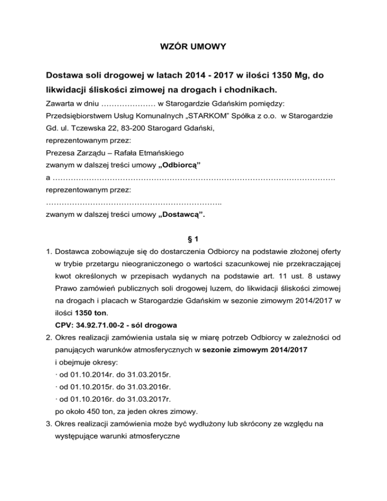 WZÓR UMOWY Dostawa soli drogowej w latach 2014 - 2017 w ilości 1350 Mg, do likwidacji śliskości zimowej na drogach i chodnikach. Zawarta w dniu ………………… w Starogardzie Gdańskim pomiędzy: Przedsiębiorstwem Usług Komunalnych „STARKOM” Spółka z o.o. w Starogardzie Gd. ul. Tczewska 22, 83-200 Starogard Gdański, reprezentowanym przez: Prezesa Zarządu – Rafała Etmańskiego zwanym w dalszej treści umowy „Odbiorcą” a ………………………………………………………………………………………………. reprezentowanym przez: ………………………………………………………….. zwanym w dalszej treści umowy „Dostawcą”. §1 1. Dostawca zobowiązuje się do dostarczenia Odbiorcy na podstawie złożonej oferty w trybie przetargu nieograniczonego o wartości szacunkowej nie przekraczającej kwot określonych w przepisach wydanych na podstawie art. 11 ust. 8 ustawy Prawo zamówień publicznych soli drogowej luzem, do likwidacji śliskości zimowej na drogach i placach w Starogardzie Gdańskim w sezonie zimowym 2014/2017 w ilości 1350 ton. CPV: 34.92.71.00-2 - sól drogowa 2. Okres realizacji zamówienia ustala się w miarę potrzeb Odbiorcy w zależności od panujących warunków atmosferycznych w sezonie zimowym 2014/2017 i obejmuje okresy: · od 01.10.2014r. do 31.03.2015r. · od 01.10.2015r. do 31.03.2016r. · od 01.10.2016r. do 31.03.2017r. po około 450 ton, za jeden okres zimowy. 3. Okres realizacji zamówienia może być wydłużony lub skrócony ze względu na występujące warunki atmosferyczne 4. Odbiorca zastrzega sobie prawo określenia każdorazowo terminów i wielkości dostaw na podstawie oddzielnych zamówień: faksowych, e-mailem lub telefonicznie 5. Produkt dostarczany będzie Odbiorcy na koszt i ryzyko Dostawcy. 6. Dostawca zobowiązany jest do dostarczenia Odbiorcy atestu o jakości soli. 7. Dostawa soli nastąpi najpóźniej do 2 dni roboczych od daty złożenia zamówienia. 8. W przypadku, gdy rzeczywisty zakres zamówień będzie mniejszy niż określony w § 1 pkt. 1, Dostawca nie będzie wnosił z tego tytułu roszczeń. §2 1. Wynagrodzenie za wykonanie przedmiotu umowy określonego w § 1 strony ustalają zgodnie z ofertą Dostawcy na kwotę: netto: ................................. zł (słownie złotych: ...........................................................) plus podatek VAT .......%: .................. zł (słownie złotych: ............................................................) co łącznie stanowi kwotę brutto: ...................................... zł (słownie złotych: .................................................................................................. ) 2. W przypadku ustawowej zmiany procentowej stawki podatku VAT, kwota brutto wynagrodzenia zostanie odpowiednio dostosowana aneksem do niniejszej umowy. 3. Dostawy rozliczane będą fakturami częściowymi, z których każda będzie wystawiona po zrealizowaniu odpowiedniej części zamówienia i dokonaniu jej odbioru przez Zamawiającego. 4. Za podstawę wystawienia faktury obejmującej wynagrodzenie za wykonanie przedmiotu zamówienia uważać się będzie dokumenty WZ wystawione w miejscu załadunku materiału przez Dostawcę. Dostawca przestawi elektroniczny wydruk kwitu wagowego środka transportu brutto i netto zważonego na legalizowanych wagach. 5. Należność będzie płatna przelewem na konto Dostawcy w terminie 30 dni licząc od dnia złożenia faktury. 6. Ustalone ceny obowiązują strony na czas trwania 1-go okresu zimowego, tj. od 01.10.2014r do 31.03.2015r. 7. Za następne dwa okresy zimowe ceny będą rewaloryzowane o stopień inflacji na wniosek Dostawcy.. §3 Umowę niniejszą strony zawarły na czas określony do 31.03.2017 r. §4 1. Dostawca zobowiązuje się zapłacić Odbiorcy kary umowne: · za opóźnienie realizacji zamówienia Dostawca zapłaci Odbiorcy 30 % wynagrodzenia netto zamówionej dostawy, · z tytułu odstąpienia od umowy z przyczyn leżących po stronie Dostawcy – w wysokości 70 % wynagrodzenia, o którym mowa w § 2 ust. 1 umowy. 2. Odbiorca zapłaci Dostawcy kary umowne z tytułu: · odstąpienia od umowy z przyczyn leżących po stronie Odbiorcy – w wysokości 20 % wynagrodzenia, o którym mowa w § 2 ust. 1 umowy. §5 1. Przedstawicielem Odbiorcy czuwającym nad realizacją umowy będzie Pani Teresa Makiła Główny specjalista ds. zieleni, nr telefonu (58) 56 230 67 lub 601 168 491 w razie nieobecności Pan Piotr Wesołowski – Mistrz ds. zieleni 2. Przedstawicielem Dostawcy czuwającym nad realizacją umowy będzie Pani/Pan ............................................, nr telefonu .......................................................... . §6 1. Strony zastrzegają sobie prawo dochodzenia na zasadach ogólnych odszkodowania przewyższającego wysokość otrzymanych kar umownych do wysokości rzeczywiście poniesionej szkody. 2. Przeniesienie wierzytelności wynikających z niniejszej umowy lub powstałych przy jej realizacji wymaga pisemnej zgody Odbiorcy. §7 Wszelkie zmiany niniejszej umowy pod rygorem nieważności dokonywane muszą być w formie pisemnej. §8 W sprawach nieuregulowanych niniejszą umową zastosowanie mają przepisy kodeksu cywilnego oraz Ustawy Prawo Zamówień Publicznych. §9 Umowę sporządzono w 2 egz. z tego 1 egz. dla Dostawcy i 1 egz. dla Odbiorcy. Załączniki : · SIWZ · Oferta · Formularz cenowy · Opis przedmiotu zamówienia ............................................ Dostawca ........................................ Odbiorca