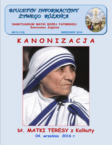 BIULETYN INFORMACYJNY ŻYWEGO RÓŻAŃCA SANKTUARIUM MATKI BOŻEJ FATIMSKIEJ Sosnowiec Zagórze NR 9 (116) WRZESIEŃ’ 2016 K A N O N I Z A C J A bł. MATKI TERESY z Kalkuty 04. września 2016 r. W niedzielę 4. września, w 19. rocznicę śmierci, bł. Matka Teresa z Kalkuty zostanie ogłoszona świętą. Założycielka Zgromadzenia Misjonarek Miłości urodziła się 26. sierpnia 1910 r. w rodzinie albańskiej w Skopje, ale większą część swego życia spędziła w Indiach. Wcześniej, mając 18 lat, wstąpiła do irlandzkiego zgromadzenia sióstr loretanek, które wysłało ją niebawem do Indii i tam, w Kalkucie, w 1946 r., założyła zgromadzenie misjonarek miłości, zatwierdzone przez Stolicę Apostolską w roku 1950 i obecne dzisiaj na całym świecie. Zawsze troszczyła się o najuboższych, opuszczonych i najbardziej potrzebujących, za co w 1979 r. otrzymała Pokojową Nagrodę Nobla. Była też wielką obrończynią życia ludzkiego od poczęcia do naturalnej śmierci. Zmarła w opinii świętości 5. września 1997 r. w domu macierzystym swego zgromadzenia w Kalkucie. Wobec szerokiego zasięgu jej dzieła i powszechnego przekonania o jej świętości Jan Paweł II zezwolił na rozpoczęcie jej procesu beatyfikacyjnego już w dwa lata po jej śmierci, a więc przed upływem wymaganych 5 lat. A 19. października 2003 r. osobiście ogłosił ją błogosławioną na Placu św. Piotra w Rzymie. Jestem krwi albańskiej, obywatelką Indii, z wiary jestem siostrą katolicką, a z racji swego powołania należę do świata. Ale gdy chodzi o serce, należę całkowicie do Serca Jezusowego — wyznała kiedyś bł. Matka Teresa. Przez całe swoje życie głosiła miłość, której Jezus pragnął dla całej ludzkości, a zwłaszcza wobec najuboższych z biednych. Rzymskie świętowanie kanonizacji bł. Matki Teresy z Kalkuty potrwa osiem dni. Już 1. września na uniwersytecie LUMSA zostanie otwarta wystawa przedstawiająca „życie, duchowość i przesłanie” Matki Teresy. Po południu w Audytorium św. Cecylii odbędzie się rodzinny festyn „z ubogimi i dla ubogich”. 2. września w bazylice św. Anastazji na Palatynie będą odprawiane Msze św. w różnych językach (angielskim, hiszpańskim i włoskim), a po liturgiach można będzie uczcić relikwie Matki Teresy. Wieczorem w bazylice św. Jana na Lateranie papieski wikariusz dla diecezji rzymskiej kard. Agostino Vallini poprowadzi czuwanie modlitewne, połączone z adoracją eucharystyczną. W sobotę 3. września o godz. 10.00 na placu św. Piotra papież Franciszek wygłosi katechezę do uczestników Jubileuszu Pracowników i Wolontariuszy Dzieł Miłosierdzia, zaś po południu w bazylice San Andrea della Valle w centrum Rzymu można będzie wysłuchać muzycznego oratorium Marcello Bronzettiego ku czci nowej świętej, uczcić jej relikwie i wziąć udział we Mszy św. .00 O 10 Centralnym dniem obchodów będzie niedziela 4. września. na placu św. Piotra papież Franciszek dokona kanonizacji Matki Teresy. W tym samym miejscu i o tej samej godzinie w poniedziałek 5. września sekretarz stanu Stolicy Apostolskiej kard. Pietro Parolin odprawi dziękczynną Mszę św. za kanonizację. Tego dnia przypadnie po raz pierwszy liturgiczne wspomnienie św. Matki Teresy. Po południu można będzie uczcić jej relikwie w bazylice św. Jana na Lateranie, podobnie jak przez cały dzień 6. września. Natomiast 7. i 8. września relikwie będą wystawione w kościele św. Grzegorza Wielkiego na wzgórzu Celio. Można będzie wtedy również odwiedzać pokój Matki Teresy w tamtejszym klasztorze św. Grzegorza. P PA AP PIIE ES SK KIIE E IIN NT TE EN NC CJ JE E A APPO OS ST TO OLLS ST TW WA A M MO OD DLLIIT TW WY Y OGÓLNA Aby każdy wnosił wkład we wspólne dobro i w budowę społeczeństwa, które stawia w centrum osobę ludzką. Ważne jest dobro społeczne, dobro wspólne, ale najważniejszy jest człowiek jako osoba. Św. Jan Paweł II jako profesor KUL, biskup i papież nauczał, że człowiek stanowi najdoskonalsze dzieło stworzone przez Boga z miłości, obdarzone nieśmiertelną duszą, rozumem, wolną wolą i eschatologicznym powołaniem. Dlatego tak istotne jest, aby każdy z nas wnosił jak najwięcej dobra i miłości w to wspólne dobro, jakim jest rodzina, małżeństwo, środowisko, w którym żyjemy, Kościół, Ojczyzna. ks. Szymon Mucha - „Różaniec” nr 9/2016 MISYJNA Aby chrześcijanie, przystępując do sakramentów i rozważając Pismo Święte, stawali się coraz bardziej świadomi swojej misji ewangelizacyjnej. Katechetę – kapłana, siostrę zakonną czy osobę świecką – uczeń ocenia nie po tym, jaką wiedzę posiada, ale czy naprawdę żyje tym, co głosi. Lekcję o religii czy zasadach moralnych może przeprowadzić nawet ateista, ale poprowadzić do Boga może tylko ktoś, kto jest jednocześnie nauczycielem i świadkiem wiary. Dziękujmy za wspaniałych, pełnych oddania i wiary katechetów, których Pan Bóg postawił na naszej drodze życia, i prośmy, aby byli odważnymi świadkami wiary. ks. Szymon Mucha - „Różaniec” nr 9/2016 IIN NT TE EN NC CJ JA A K KR RU UC CJ JA AT TY Y R RÓ ÓŻ ŻA AŃ ŃC CO OW WE EJ J zzaa O OJ JC CZ ZY YZ ZN NĘ Ę Z Maryją Królową Polski módlmy się o Polskę wierną Bogu, Krzyżowi i Ewangelii, o wypełnienie Jasnogórskich Ślubów Narodu. IIN NT TE EN NCCJ JE E PPA AR RA AFFIIA ALLN NE E Módlmy się: o Boże wspomożenie, zdrowie i siły dla Ojca Świętego Franciszka na czas trudu kierowania Kościołem; za naszą Ojczyznę, zwłaszcza o mądrość, roztropność i odpowiedzialność dla rządzących Polską; za prześladowanych chrześcijan; o zdrowie, potrzebne łaski i Dary Ducha Świętego dla Biskupa Grzegorza Kaszaka z racji Imienin; o zdrowie, potrzebne łaski i dary Ducha Świętego dla kapłanów posługujących w naszym Sanktuarium i dla kapłanów pochodzących z naszej Parafii; o Światło Ducha Świętego i potrzebne łaski