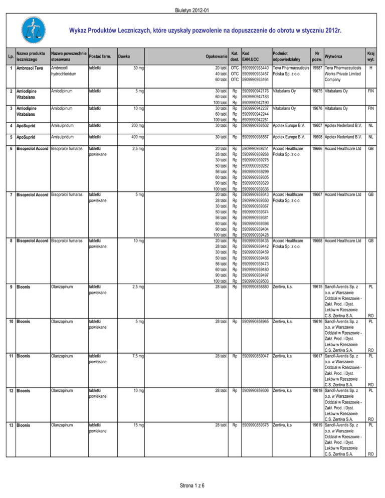 Biuletyn 2012-01 I PRODUKT CH ÓW NY BI CZ PRODUKTÓW CJI LE RA C ST YROBÓ W CH W ME ZY IC DY ZN Wykaz Produktów Leczniczych, które uzyskały pozwolenie na dopuszczenie do obrotu w styczniu 2012r. CZ ÓJ OB YCH URZĄ DR EJ E Lp. Nazwa produktu leczniczego Nazwa powszechnie Postać farm. stosowana 1 Ambrosol Teva Ambroxoli hydrochloridum tabletki 30 mg 2 Amlodipine Vitabalans Amlodipinum tabletki 5 mg 3 Amlodipine Vitabalans Amlodipinum tabletki 10 mg 4 ApoSuprid Amisulpridum tabletki 5 ApoSuprid Amisulpridum 6 Dawka Opakowanie Kat. Kod dost. EAN.UCC 20 tabl. OTC 5909990933440 40 tabl. OTC 5909990933457 60 tabl. OTC 5909990933464 Podmiot odpowiedzialny Nr Wytwórca pozw. Teva Pharmaceuticals 19587 Teva Pharmaceuticals Polska Sp. z o.o. Works Private Limited Company Kraj wyt. H Rp Rp Rp Rp Rp Rp Rp 5909990942176 5909990942183 5909990942190 5909990942237 5909990942244 5909990942251 5909990936502 Vitabalans Oy 19675 Vitabalans Oy FIN Vitabalans Oy 19676 Vitabalans Oy FIN 200 mg 30 tabl. 60 tabl. 100 tabl. 30 tabl. 60 tabl. 100 tabl. 30 tabl. Apotex Europe B.V. 19607 Apotex Nederland B.V. NL tabletki 400 mg 30 tabl. Rp 5909990936557 Apotex Europe B.V. 19608 Apotex Nederland B.V. NL Bisoprolol Accord Bisoprololi fumaras tabletki powlekane 2,5 mg GB tabletki powlekane 5 mg Accord Healthcare Polska Sp. z o.o. 19667 Accord Healthcare Ltd GB 8 Bisoprolol Accord Bisoprololi fumaras tabletki powlekane 10 mg Accord Healthcare Polska Sp. z o.o. 19668 Accord Healthcare Ltd GB 9 Bloonis Olanzapinum tabletki powlekane 2,5 mg 5909990939251 5909990939268 5909990939275 5909990939282 5909990939299 5909990939305 5909990939329 5909990939336 5909990939343 5909990939350 5909990939367 5909990939374 5909990939381 5909990939398 5909990939404 5909990939428 5909990939435 5909990939442 5909990939459 5909990939466 5909990939473 5909990939480 5909990939497 5909990939503 5909990858880 19666 Accord Healthcare Ltd Bisoprolol Accord Bisoprololi fumaras Rp Rp Rp Rp Rp Rp Rp Rp Rp Rp Rp Rp Rp Rp Rp Rp Rp Rp Rp Rp Rp Rp Rp Rp Rp Accord Healthcare Polska Sp. z o.o. 7 20 tabl. 28 tabl. 30 tabl. 50 tabl. 56 tabl. 60 tabl. 90 tabl. 100 tabl. 20 tabl. 28 tabl. 30 tabl. 50 tabl. 56 tabl. 60 tabl. 90 tabl. 100 tabl. 20 tabl. 28 tabl. 30 tabl. 50 tabl. 56 tabl. 60 tabl. 90 tabl. 100 tabl. 28 tabl. Zentiva, k.s. PL 10 Bloonis Olanzapinum tabletki powlekane 5 mg 28 tabl. Rp 5909990858965 Zentiva, k.s. 11 Bloonis Olanzapinum tabletki powlekane 7,5 mg 28 tabl. Rp 5909990859047 Zentiva, k.s 12 Bloonis Olanzapinum tabletki powlekane 10 mg 28 tabl. Rp 5909990859306 Zentiva, k.s 13 Bloonis Olanzapinum tabletki powlekane 15 mg 28 tabl. Rp 5909990859375 Zentiva, k.s 19615 Sanofi-Aventis Sp. z o.o. w Warszawie Oddział w Rzeszowie Zakł. Prod. i Dyst. Leków w Rzeszowie C.S. Zentiva S.A. 19616 Sanofi-Aventis Sp. z o.o. w Warszawie Oddział w Rzeszowie Zakł. Prod. i Dyst. Leków w Rzeszowie C.S. Zentiva S.A. 19617 Sanofi-Aventis Sp. z o.o. w Warszawie Oddział w Rzeszowie Zakł. Prod. i Dyst. Leków w Rzeszowie C.S. Zentiva S.A. 19618 Sanofi-Aventis Sp. z o.o. w Warszawie Oddział w Rzeszowie Zakł. Prod. i Dyst. Leków w Rzeszowie C.S. Zentiva S.A. 19619 Sanofi-Aventis Sp. z o.o. w Warszawie Oddział w Rzeszowie Zakł. Prod. i Dyst. Leków w Rzeszowie C.S. Zentiva S.A. Strona 1 z 6 RO PL RO PL RO PL RO PL RO Biuletyn 2012-01 Lp. Nazwa produktu leczniczego Nazwa powszechnie Postać farm. stosowana 14 Bloonis Olanzapinum tabletki powlekane 15 Bloonis Olanzapinum 16 Bloonis Dawka Opakowanie Kat. Kod dost. EAN.UCC Podmiot odpowiedzialny Nr Wytwórca pozw. 19620 Sanofi-Aventis Sp. z o.o. w Warszawie Oddział w Rzeszowie Zakł. Prod. i Dyst. Leków w Rzeszowie C.S. Zentiva S.A. 19621 Sanofi-Aventis Sp. z o.o. w Warszawie Oddział w Rzeszowie Zakł. Prod. i Dyst. Leków w Rzeszowie C.S. Zentiva S.A. 19622 Sanofi-Aventis Sp. z o.o. w Warszawie Oddział w Rzeszowie Zakł. Prod. i Dyst. Leków w Rzeszowie C.S. Zentiva S.A. 19623 Sanofi-Aventis Sp. z o.o. w Warszawie Oddział w Rzeszowie Zakł. Prod. i Dyst. Leków w Rzeszowie C.S. Zentiva S.A. 19624 Sanofi-Aventis Sp. z o.o. w Warszawie Oddział w Rzeszowie Zakł. Prod. i Dyst. Leków w Rzeszowie C.S. Zentiva S.A. 19591 Allergan Pharmaceuticals Ireland 20 mg 28 tabl. Rp 5909990859382 Zentiva, k.s tabletki ulegające rozpadowi w jamie ustnej 5 mg 28 tabl. Rp 5909990859399 Zentiva, k.s Olanzapinum tabletki ulegające rozpadowi w jamie ustnej 10 mg 28 tabl. Rp 5909990859467 Zentiva, k.s 17 Bloonis Olanzapinum tabletki ulegające rozpadowi w jamie ustnej 15 mg 28 tabl. Rp 5909990859504 Zentiva, k.s 18 Bloonis Olanzapinum tabletki ulegające rozpadowi w jamie ustnej 20 mg 28 tabl. Rp 5909990859566 Zentiva, k.s 19 Botox Toxinum botulinicum typum A proszek do sporządzania roztworu do wstrzykiwań 1 fiol. proszku 2 fiol. proszku 3 fiol. proszku 6 fiol. proszku Rp Rp Rp Rp 5909990935307 5909990935321 5909990935338 5909990935345 Allergan Pharmaceuticals Ireland 20 Carzap Candesartanum cilexetilum tabletki 200 j. Allergan kompleksu neurotoksyny Clostridium botulinum typu A 4 mg 7 tabl. 14 tabl. 28 tabl. 30 tabl. 56 tabl. 70 tabl. 90 tabl. 98 tabl. 7 tabl. 14 tabl. 28 tabl. 30 tabl. 56 tabl. 70 tabl. 90 tabl. 98 tabl. 7 tabl. 14 tabl. 28 tabl. 30 tabl. 56 tabl. 70 tabl. 90 tabl. 98 tabl. 7 tabl. 14 tabl. 28 tabl. 30 tabl. 56 tabl. 70 tabl. 90 tabl. 98 tabl. 20 tabl. 50 tabl. Rp Rp Rp Rp Rp Rp Rp Rp Rp Rp Rp Rp Rp Rp Rp Rp Rp Rp Rp Rp Rp Rp Rp Rp Rp Rp Rp Rp Rp Rp Rp Rp Rp Rp 5909990936922 5909990936939 5909990936946 5909990936953 5909990936960 5909990936977 5909990936984 5909990936991 5909990937004 5909990937073 5909990937080 5909990937097 5909990937103 5909990937127 5909990937134 5909990937141 5909990937158 5909990937165 5909990937172 5909990937189 5909990937196 5909990937202 5909990937226 5909990937233 5909990937240 5909990937257 5909990937264 5909990937271 5909990937288 5909990937295 5909990937301 5909990937332 5909990935840 5909990935857 Zentiva, k.s. 21 Carzap 22 Carzap 23 Carzap Candesartanum cilexetilum C