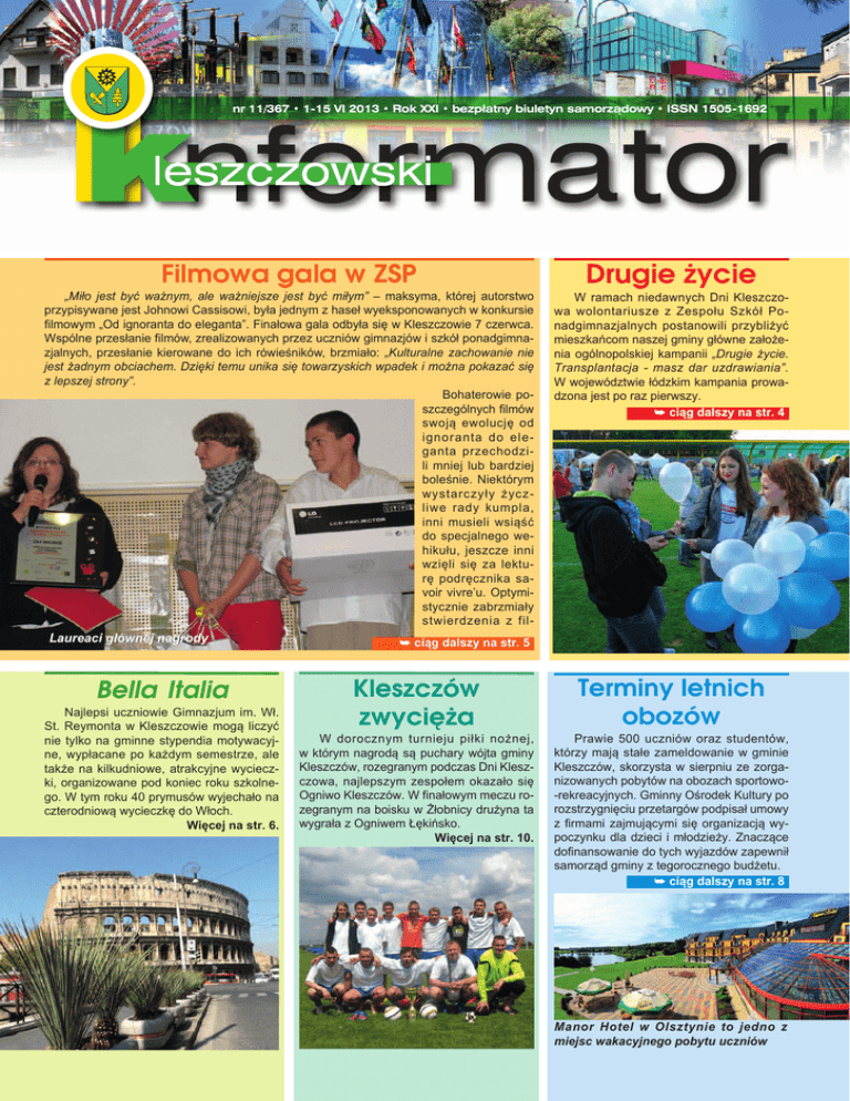 nr 11/367 • 1-15 VI 2013 • Rok XXI • bezpłatny biuletyn samorządowy • ISSN 1505-1692 Filmowa gala w ZSP „Miło jest być ważnym, ale ważniejsze jest być miłym” – maksyma, której autorstwo przypisywane jest Johnowi Cassisowi, była jednym z haseł wyeksponowanych w konkursie filmowym „Od ignoranta do eleganta”. Finałowa gala odbyła się w Kleszczowie 7 czerwca. Wspólne przesłanie filmów, zrealizowanych przez uczniów gimnazjów i szkół ponadgimnazjalnych, przesłanie kierowane do ich rówieśników, brzmiało: „Kulturalne zachowanie nie jest żadnym obciachem. Dzięki temu unika się towarzyskich wpadek i można pokazać się z lepszej strony”. Bohaterowie poszczególnych filmów swoją ewolucję od ignoranta do eleganta przechodzili mniej lub bardziej boleśnie. Niektórym wystarczyły życzliwe rady kumpla, inni musieli wsiąść do specjalnego wehikułu, jeszcze inni wzięli się za lekturę podręcznika savoir vivre’u. Optymistycznie zabrzmiały stwierdzenia z fil- Laureaci głównej nagrody Bella Italia Najlepsi uczniowie Gimnazjum im. Wł. St. Reymonta w Kleszczowie mogą liczyć nie tylko na gminne stypendia motywacyjne, wypłacane po każdym semestrze, ale także na kilkudniowe, atrakcyjne wycieczki, organizowane pod koniec roku szkolnego. W tym roku 40 prymusów wyjechało na czterodniową wycieczkę do Włoch. Więcej na str. 6. Drugie życie W ramach niedawnych Dni Kleszczowa wolontariusze z Zespołu Szkół Ponadgimnazjalnych postanowili przybliżyć mieszkańcom naszej gminy główne założenia ogólnopolskiej kampanii „Drugie życie. Transplantacja - masz dar uzdrawiania”. W województwie łódzkim kampania prowadzona jest po raz pierwszy. å ciąg dalszy na str. 4 å ciąg dalszy na str. 5 Kleszczów zwycięża W dorocznym turnieju piłki nożnej, w którym nagrodą są puchary wójta gminy Kleszczów, rozegranym podczas Dni Kleszczowa, najlepszym zespołem okazało się Ogniwo Kleszczów. W finałowym meczu rozegranym na boisku w Żłobnicy drużyna ta wygrała z Ogniwem Łękińsko. Więcej na str. 10. Terminy letnich obozów Prawie 500 uczniów oraz studentów, którzy mają stałe zameldowanie w gminie Kleszczów, skorzysta w sierpniu ze zorganizowanych pobytów na obozach sportowo-rekreacyjnych. Gminny Ośrodek Kultury po rozstrzygnięciu przetargów podpisał umowy z firmami zajmującymi się organizacją wypoczynku dla dzieci i młodzieży. Znaczące dofinansowanie do tych wyjazdów zapewnił samorząd gminy z tegorocznego budżetu. å ciąg dalszy na str. 8 Manor Hotel w Olsztynie to jedno z miejsc wakacyjnego pobytu uczniów 2 Informator KLESZCZOWSKI Przedterminowe wybory wójta gminy Kleszczów O godz. 24.00 w dniu 14 czerwca minął termin zgłaszania Gminnej Komisji Wyborczej kandydatów na wójta. Oto kolejne ważne terminy i czynności, przewidziane w kalendarzu wyborczym: • do 19 czerwca - zgłaszanie kandydatów do składu obwodowych komisji wyborczych, - podanie do publicznej wiadomości, w formie obwieszczenia, informacji o: a) numerach i granicach obwodów głosowania, b) wyznaczonych siedzibach obwodowych komisji wyborczych • do 24 czerwca - podanie do publicznej wiadomości, w drodze rozplakatowania, obwieszczenia gminnej komisji wyborczej o zarejestrowanych kandydatach na wójta, na którym umieszczone będą, w kolejności alfabetycznej nazwisk: nazwiska, imiona, wiek, wykształcenie, miejsce zamieszkania, nazwa komitetu zgłaszającego kandydata oraz nazwa partii politycznej, do której należy kandydat i treść oświadczeń lustracyjnych stwierdzających fakt pracy lub służby w organach bezpieczeństwa państwa lub współpracy z nimi, - sporządzenie spisu wyborców, - powołanie obwodowych komisji wyborczych • od 24 czerwca - nieodpłatne rozpowszechnianie audycji wyborczych w programach telewizji publicznej i publicznego radia, • do 27 czerwca - składanie wniosków o sporządzenie aktu pełnomocnictwa do głosowania • do 2 lipca - składanie wniosków przez wyborców niepełnosprawnych o dopisanie ich do spisu w wybranym obwodzie głosowania na obszarze gminy • 5 lipca o godz. 24.00 - zakończenie kampanii wyborczej • 6 lipca - przekazanie przewodniczącym obwodowych komisji wyborczych spisów wyborców • 7 lipca 2013 r. godz. 8.00–22.00 - przeprowadzenie głosowania. Gminna Komisja Wyborcza w Kleszczowie Gminna Komisja Wyborcza (GKW) w Kleszczowie na posiedzeniu w dniu 10 czerwca 2013 roku ukonstytuowała się w sposób następujący: 1. Elżbieta Frankowska - Przewodniczący GKW 2. Beata Bujacz - Zastępca Przewodniczącego GKW 3. Barbara Gwoździk - członek GKW 4. Kamil Jarząbek - członek GKW 5. Bożena Szczepanik - członek GKW 6. Małgorzata Tatara - członek GKW 7. Jolanta Zagaj - członek GKW Siedziba Komisji mieści się w budynku Urzędu Gminy w Kleszczowie, ul. Główna 47, pokój nr 1, tel. 44/ 731-31-10. NR 11/367 Ukwiecone rabaty Krótko Do 24 czerwca na kilkudziesięciu rabatach w miejscowościach naszej gminy oraz w kilkudziesięciu donicach na terenie Kleszczowa zostanie posadzonych łącznie ponad 11 tysięcy sztuk kwitnących sadzonek - głównie pelargonii i begonii wiecznie kwitnących. Ogłoszony przez Urząd Gminy przetarg na dostawę, sadzenie i pielęgnację rabat kwiatowych wygrała firma Green Park sp. z o.o. z Radomska. Jej obowiązkiem będzie także pielęgnacja rabat do końca października br. Wynagrodzenie brutto za realizację zamówionych przez gminę prac ma wynieść 79,92 tys. zł. Na gali konkursu „Markowy samorząd” 28 maja Jacek Rożnowski, pełniący funkcję wójta gminy Kleszczów, wziął udział w panelu dyskusyjnym „Rozwój zrównoważony a budowa marki miejsca”, zorganizowanym w Warszawie w trakcie gali zorganizowanej w związku z podsumowaniem konkursu „Markowy samorząd”. Dyskusja, której przysłuchiwali się zaproszeni samorządowcy poświęcona była m.in. wpływowi gmin na tempo rozwoju poszczególnych powiatów, a 