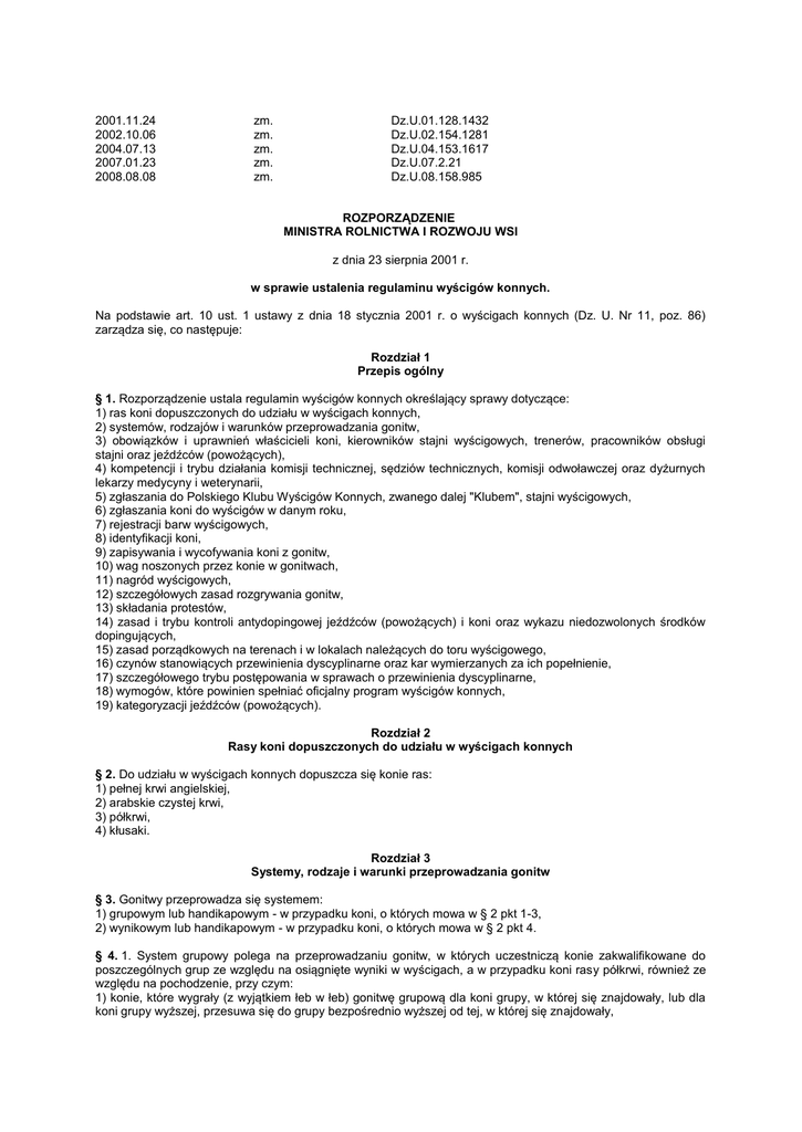 2001.11.24 2002.10.06 2004.07.13 2007.01.23 2008.08.08 zm. zm. zm. zm. zm. Dz.U.01.128.1432 Dz.U.02.154.1281 Dz.U.04.153.1617 Dz.U.07.2.21 Dz.U.08.158.985 ROZPORZĄDZENIE MINISTRA ROLNICTWA I ROZWOJU WSI z dnia 23 sierpnia 2001 r. w sprawie ustalenia regulaminu wyścigów konnych. Na podstawie art. 10 ust. 1 ustawy z dnia 18 stycznia 2001 r. o wyścigach konnych (Dz. U. Nr 11, poz. 86) zarządza się, co następuje: Rozdział 1 Przepis ogólny § 1. Rozporządzenie ustala regulamin wyścigów konnych określający sprawy dotyczące: 1) ras koni dopuszczonych do udziału w wyścigach konnych, 2) systemów, rodzajów i warunków przeprowadzania gonitw, 3) obowiązków i uprawnień właścicieli koni, kierowników stajni wyścigowych, trenerów, pracowników obsługi stajni oraz jeźdźców (powożących), 4) kompetencji i trybu działania komisji technicznej, sędziów technicznych, komisji odwoławczej oraz dyżurnych lekarzy medycyny i weterynarii, 5) zgłaszania do Polskiego Klubu Wyścigów Konnych, zwanego dalej "Klubem", stajni wyścigowych, 6) zgłaszania koni do wyścigów w danym roku, 7) rejestracji barw wyścigowych, 8) identyfikacji koni, 9) zapisywania i wycofywania koni z gonitw, 10) wag noszonych przez konie w gonitwach, 11) nagród wyścigowych, 12) szczegółowych zasad rozgrywania gonitw, 13) składania protestów, 14) zasad i trybu kontroli antydopingowej jeźdźców (powożących) i koni oraz wykazu niedozwolonych środków dopingujących, 15) zasad porządkowych na terenach i w lokalach należących do toru wyścigowego, 16) czynów stanowiących przewinienia dyscyplinarne oraz kar wymierzanych za ich popełnienie, 17) szczegółowego trybu postępowania w sprawach o przewinienia dyscyplinarne, 18) wymogów, które powinien spełniać oficjalny program wyścigów konnych, 19) kategoryzacji jeźdźców (powożących). Rozdział 2 Rasy koni dopuszczonych do udziału w wyścigach konnych § 2. Do udziału w wyścigach konnych dopuszcza się konie ras: 1) pełnej krwi angielskiej, 2) arabskie czystej krwi, 3) półkrwi, 4) kłusaki. Rozdział 3 Systemy, rodzaje i warunki przeprowadzania gonitw § 3. Gonitwy przeprowadza się systemem: 1) grupowym lub handikapowym - w przypadku koni, o których mowa w § 2 pkt 1-3, 2) wynikowym lub handikapowym - w przypadku koni, o których mowa w § 2 pkt 4. § 4. 1. System grupowy polega na przeprowadzaniu gonitw, w których uczestniczą konie zakwalifikowane do poszczególnych grup ze względu na osiągnięte wyniki w wyścigach, a w przypadku koni rasy półkrwi, również ze względu na pochodzenie, przy czym: 1) konie, które wygrały (z wyjątkiem łeb w łeb) gonitwę grupową dla koni grupy, w której się znajdowały, lub dla koni grupy wyższej, przesuwa się do grupy bezpośrednio wyższej od tej, w której się znajdowały, 2) konie, które wygrały gonitwę pozagrupową kategorii A (także łeb w łeb), przesuwa się do kategorii A, bez względu na to, w której grupie się znajdowały, 3) konie, które znajdowały się w grupie, po wygraniu gonitwy pozagrupowej kategorii B (także łeb w łeb) przesuwa się do kategorii B, z wyjątkiem 2-letnich koni pełnej krwi i 3-letnich koni arabskich czystej krwi, które po wygraniu gonitwy pozagrupowej kategorii B (także łeb w łeb) przesuwa się do kategorii A. 2. System handikapowy polega na przeprowadzaniu gonitw, w których szanse koni są wyrównywane przez: 1) zwiększenie albo zmniejszenie wagi noszonej przez konia - w przypadku koni, o których mowa w § 2 pkt 1-3, 2) zwiększenie dystansu, jaki konie mają do pokonania, nie więcej jednak niż o 80 metrów - w przypadku koni, o których mowa w § 2 pkt 4, 3. Wielkość zwiększenia albo zmniejszenia, o którym mowa w ust. 2 (handikap), ustala Prezes Polskiego Klubu Wyścigów Konnych, zwany dalej "Prezesem", na podstawie wyników uzyskanych przez konia w dotychczasowych gonitwach. 4. (skreślony), 5. System wynikowy polega na przeprowadzaniu gonitw, w których uczestniczą konie spełniające warunki określone przez organizatora wyścigów konnych dotyczące wyników koni. § 5. 1. W gonitwach przeprowadzanych systemem handikapowym nie mogą brać udziału 2-letnie konie pełnej krwi angielskiej, 3-letnie konie arabskie czystej krwi i 3-letnie konie ras półkrwi. 2. Szczegółowy sposób ustalania grup i handikapów koni, o których mowa w § 2 pkt 1-3, określa załącznik nr 1 do rozporządzenia. § 6.1. Wyróżnia się następujące rodzaje gonitw: 1) ze względu na warunki techniczne: a) płaskie, b) z płotami, c) z przeszkodami, 2) ze względu na płeć konia: a) ogierów, b) klaczy, c) ogierów i klaczy, d) ogierów i wałachów, e) ogierów, klaczy i wałachów (koni), 3) ze względu na wiek konia: a) koni jednego wieku, b) koni różnego wieku, 4) ze względu na wagę noszoną przez konia: a) z wagą ustaloną według skali wag, o której mowa w § 50, b) z nadwagą lub ulgą wagi w stosunku do wagi określonej według skali wag, o której mowa w § 50, c) z wagą ustaloną w systemie handikapowym, 5) ze względu na miejsce trenowania koni: a) gonitwy międzynarodowe dla koni z wszystkich państw, b) gonitwy międzynarodowe z udziałem koni z innych państw dopuszczonych do udziału w gonitwie na zasadzie wzajemności, c) gonitwy międzynarodowe z udziałem koni z innych państw dopuszczonych do udziału w gonitwie na zasadach określanych przez organizacje międzynarodowe wyścigów konnych, których Rzeczpospolita Polska jest członkiem, d) gonitwy krajowe dla koni trenowanych w kraju, zgłoszonych do wyścigów w danym roku i trenowanych w kraju w okresie co najmniej miesiąca przed terminem zapisu konia do gonitwy, e) gonitwy krajowe dla koni trenowanych w kraju, wpisanych do polskich ksiąg hodowlanych i urodzonych przez klacze, które w chwili urodzenia źrebięcia były własnością podmiotów mających miejsce zamieszkania lub siedzibę w kraju, a ponadto - w przypadku koni arabskich czystej krwi - klacz