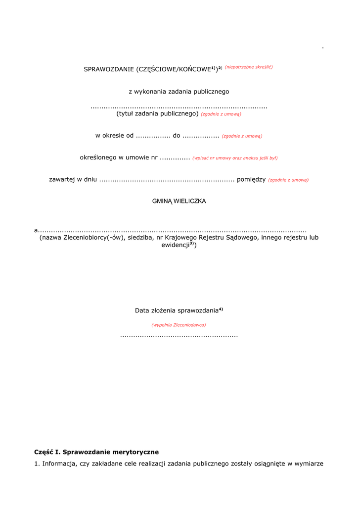 . SPRAWOZDANIE (CZĘŚCIOWE/KOŃCOWE1))2) (niepotrzebne skreślić) z wykonania zadania publicznego ................................................................................. (tytuł zadania publicznego) (zgodnie z umową) w okresie od ................ do ................. określonego w umowie nr .............. (zgodnie z umową) (wpisać nr umowy oraz aneksu jeśli był) zawartej w dniu .............................................................. pomiędzy (zgodnie z umową) GMINĄ WIELICZKA a........................................................................................................................... (nazwa Zleceniobiorcy(-ów), siedziba, nr Krajowego Rejestru Sądowego, innego rejestru lub ewidencji3)) Data złożenia sprawozdania4) (wypełnia Zleceniodawca) ...................................................... Część I. Sprawozdanie merytoryczne 1. Informacja, czy zakładane cele realizacji zadania publicznego zostały osiągnięte w wymiarze określonym w części III pkt 6 oferty. Jeśli nie, wskazać dlaczego. N Należy szczegółowo opisać założone cele określone w części III pkt 6 oferty oraz opisać w jaki sposób zostały one osiągnięte. Jeśli nie udało się zrealizować któregoś z celów należy wyjaśnić dlaczego. 2. Opis wykonania zadania z wyszczególnieniem organizacji pozarządowych, podmiotów, o których mowa w art. 3 ust. 3 ustawy z dnia 24 kwietnia 2003 r. o działalności pożytku publicznego i o wolontariacie, lub innych podmiotów wykonujących poszczególne działania określone w części III pkt 9 oferty5) Poszczególne działania w zakresie realizowanego zadania publicznego wraz z krótkim opisem wykonania zadania Terminy realizacji poszczególnych działań Należy podać Zleceniobiorca(-y) lub inny podmiot, który wykonywał działanie w zakresie realizowanego zadania publicznego Zgodnie z realizacją zadania. konkretne daty Należy wpisać zrealizowane działania zgodnie z harmonogramem i ewentualnymi zmianami. realizacji poszczególnych działań. 3. Opis, w jaki sposób dofinansowanie z dotacji inwestycji związanych z realizacją zadania wpłynęło na jego wykonanie Wypełnić tylko w przypadku ubiegania się o dofinansowanie inwestycji. W przeciwnym przypadku należy wpisać „ nie dotyczy” 4. Opis osiągniętych rezultatów Należy podać osiągnięte rezultaty zadania, np.: -rezultaty ilościowe ( ilość uczestników zadania, liczbę przeszkolonych zawodników, określić ilość i rodzaj wydatków poniesionych na realizacje zadania), -rezultaty jakościowe ( wzrost zainteresowania sportem, podniesienie umiejętności sportowych zawodników itp.) Podane rezultaty powinny odpowiadać opisanym w punkcie 10 cz. III oferty. Ewentualne rozbieżności należy uzasadnić. 5. Liczbowe określenie skali działań zrealizowanych w ramach zadania 6) Należy, stosownie do zapisów złożonej wcześniej oferty oraz jej aktualizacji, podać mierzalne, policzalne rezultaty zadania. Należy użyć miar , stosownie do zapisów złożonej wcześniej oferty pkt 9 cz. III oraz jej aktualizacji ( określić np. liczbę adresatów zadania (zawodników, widzów, kibiców), liczbę i rodzaj działań (świadczeń) służących realizacji zadania itp). Część II. Sprawozdanie z wykonania wydatków 1. Rozliczenie ze względu na rodzaj kosztów (w zł) I Koszty merytoryczne (z uwzględnieniem kosztów jednostkowych) poniesione przez …..(nazwa Zleceniobiorcy)8) 1)……… 2)……… Wypełnić zgodnie z kosztorysem do umowy oraz ewentualnymi aneksami. z tego pokryty z wkładu osoboweg o, w tym pracy społeczne j członków i świadcze ń wolontari uszy Wypełnić jedynie w przypadku składania sprawozdania częściowego. z tego pokryty z dotacji z tego z finansowych środków własnych, środków z innych źródeł, w tym wpłat i opłat adresatów zadania publicznego Bieżący okres sprawozdawczy- za okr realizacji zadania publicznego (w zł koszt całkowity Z tego pokryty z wkładu osobowego, w tym pracy społecznej członków i świadczeń wolontariuszy z tego pokryty z dotacji z tego pokryty z finansowych środków własnych, środków z innych źródeł, w tym wpłat i opłat adresatów zadania publicznego Poprzedni okres sprawozdawczy (w zł )7) koszt całkowity Całość zadania zgodnie z umową ( w zł) z tego pokryty z dotacji Rodzaj kosztów koszt całkowity Lp. z tego z finansowych środków własnych, środków z innych źródeł, w tym wpłat i opłat adresatów zadania publicznego z tego pokry wkładu osobowego, tym pracy społecznej członków i świadczeń wolontariusz Należy określić faktycznie poniesione wydatki związane z realizacją zadania. II III IV Koszty obsługi zadania publicznego, w tym koszty Wypełnić zgodnie z kosztorysem do administracyjne (z umowy oraz ewentualnymi uwzględnieniem aneksami. kosztów jednostkowych) poniesione przez (nazwa Zleceniobiorcy)8) 1)……… 2)……… Inne koszty, w tym koszty wyposażenia i promocji ( z uwzględnieniem Wypełnić zgodnie z kosztorysem do kosztów umowy oraz ewentualnymi jednostkowych) poniesione przez… aneksami. (nazwa Zleceniobiorcy)8) 1)……… 2)……… Wypełnić jedynie w przypadku składania sprawozdania częściowego. Należy określić faktycznie poniesione wydatki związane z realizacją zadania. Wypełnić jedynie w przypadku składania sprawozdania częściowego. Należy określić faktycznie poniesione wydatki związane z realizacją zadania. Ogółem 2. Rozliczenie ze względu na źródło finansowania Należy określić, z jakiego źródła i w jakiej wysokości był finansowany koszt realizacji zadania. Tabela musi być odzwierciedleniem tabeli „ Przewidywanie źródła finansowania zadania” znajdującej się w kosztorysie do umowy oraz w ewentualnych aneksach. Źródło finansowania Całość zadania (zgodnie z umową) Wypełnić zgodnie z kosztorysem do umowy oraz ewentualnymi aneksami. zł Koszty pokryte z dotacji: Z teg