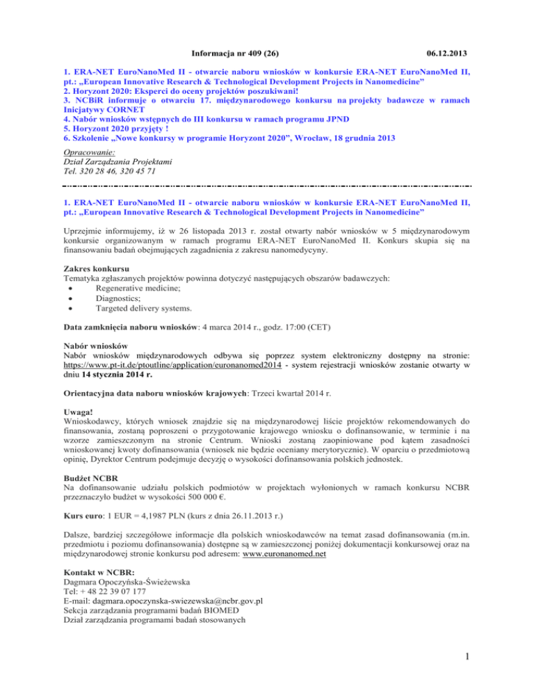 Informacja nr 409 (26) 06.12.2013 1. ERA-NET EuroNanoMed II - otwarcie naboru wniosków w konkursie ERA-NET EuroNanoMed II, pt.: „European Innovative Research & Technological Development Projects in Nanomedicine” 2. Horyzont 2020: Eksperci do oceny projektów poszukiwani! 3. NCBiR informuje o otwarciu 17. międzynarodowego konkursu na projekty badawcze w ramach Inicjatywy CORNET 4. Nabór wniosków wstępnych do III konkursu w ramach programu JPND 5. Horyzont 2020 przyjęty ! 6. Szkolenie „Nowe konkursy w programie Horyzont 2020”, Wrocław, 18 grudnia 2013 Opracowanie: Dział Zarządzania Projektami Tel. 320 28 46, 320 45 71 1. ERA-NET EuroNanoMed II - otwarcie naboru wniosków w konkursie ERA-NET EuroNanoMed II, pt.: „European Innovative Research & Technological Development Projects in Nanomedicine” Uprzejmie informujemy, iż w 26 listopada 2013 r. został otwarty nabór wniosków w 5 międzynarodowym konkursie organizowanym w ramach programu ERA-NET EuroNanoMed II. Konkurs skupia się na finansowaniu badań obejmujących zagadnienia z zakresu nanomedycyny. Zakres konkursu Tematyka zgłaszanych projektów powinna dotyczyć następujących obszarów badawczych: Regenerative medicine; Diagnostics; Targeted delivery systems. Data zamknięcia naboru wniosków: 4 marca 2014 r., godz. 17:00 (CET) Nabór wniosków Nabór wniosków międzynarodowych odbywa się poprzez system elektroniczny dostępny na stronie: https://www.pt-it.de/ptoutline/application/euronanomed2014 - system rejestracji wniosków zostanie otwarty w dniu 14 stycznia 2014 r. Orientacyjna data naboru wniosków krajowych: Trzeci kwartał 2014 r. Uwaga! Wnioskodawcy, których wniosek znajdzie się na międzynarodowej liście projektów rekomendowanych do finansowania, zostaną poproszeni o przygotowanie krajowego wniosku o dofinansowanie, w terminie i na wzorze zamieszczonym na stronie Centrum. Wnioski zostaną zaopiniowane pod kątem zasadności wnioskowanej kwoty dofinansowania (wniosek nie będzie oceniany merytorycznie). W oparciu o przedmiotową opinię, Dyrektor Centrum podejmuje decyzję o wysokości dofinansowania polskich jednostek. Budżet NCBR Na dofinansowanie udziału polskich podmiotów w projektach wyłonionych w ramach konkursu NCBR przeznaczyło budżet w wysokości 500 000 €. Kurs euro: 1 EUR = 4,1987 PLN (kurs z dnia 26.11.2013 r.) Dalsze, bardziej szczegółowe informacje dla polskich wnioskodawców na temat zasad dofinansowania (m.in. przedmiotu i poziomu dofinansowania) dostępne są w zamieszczonej poniżej dokumentacji konkursowej oraz na międzynarodowej stronie konkursu pod adresem: www.euronanomed.net Kontakt w NCBR: Dagmara Opoczyńska-Świeżewska Tel: + 48 22 39 07 177 E-mail: [email protected] Sekcja zarządzania programami badań BIOMED Dział zarządzania programami badań stosowanych 1 Kontakt w sprawach finansowych: Wojciech Gruszczyński Tel: +48 22 39 07 215 E-mail: [email protected] Sekcja finansowania projektów B+R Więcej informacji: http://www.ncbir.pl/programy-miedzynarodowe/era-net/euronanomedii/aktualnosci/art,2412,era-net-euronanomed-ii-otwarcie-naboru-wnioskow-w-konkursie-era-net-euronanomedii-pt-european-innovative-research-technological.html Link do dokumentów konkursowych: http://www.euronanomed.net/joint-calls/5th-joint-call-2014-pre-announcement/ Strona internetowa programu www.euronanomed.net 2. Horyzont 2020: Eksperci do oceny projektów poszukiwani! Komisja Europejska (KE) uruchomiła rejestrację ekspertów, którzy będą wspierać KE oraz jej agencje wykonawcze w realizacji nowego Programu Ramowego w zakresie badań naukowych i innowacji – Horyzont 2020. KE potrzebuje niezależnych ekspertów, którzy będą nie tylko oceniać wnioski w nowym programie, ale także oceniać sam program, jak również politykę badawczo-rozwojową i proinnowacyjną UE. Więcej informacji: http://www.kpk.gov.pl/aktualnosci/shownews.html?id=10697 oraz http://ec.europa.eu/research/index.cfm?pg=newsalert&year=2013&na=na-221113 Uwaga! Dane osób wpisanych do bazy ekspertów FP7 NIE zostaną automatycznie przeniesione do nowej bazy ekspertów H2020. Należy więc ponownie zarejestrować się w bazie ekspertów. Wszelkie informacje dostępne są na stronie Participant Portal: http://ec.europa.eu/research/participants/portal/desktop/en/experts/index.html 3. NCBiR informuje o otwarciu 17. międzynarodowego konkursu na projekty badawcze w ramach Inicjatywy CORNET NCBR zaplanowało budżet w wysokości 500 000 euro na dofinansowanie udziału polskich podmiotów w projektach wyłonionych w konkursie. Wnioskodawcy przesyłają wspólny wniosek w języku angielskim na adres internetowy sekretariatu Inicjatywy CORNET [email protected]. Wniosek ten składany jest przez lidera konsorcjum w imieniu międzynarodowego konsorcjum badawczego. Wnioski w wersji elektronicznej można składać w terminie do 28 marca 2014 r. do godziny 12:00. Wzór wniosku międzynarodowego, wraz ze wszystkimi załącznikami, dostępny jest pod adresem http://www.cornet-era.net/ . Równolegle do wniosku międzynarodowego, polski Wnioskodawca (zrzeszenie będące partnerem międzynarodowego konsorcjum badawczego) przedkłada do NCBR wniosek krajowy o dofinansowanie projektu. Termin składania wniosków krajowych w wersji elektronicznej upływa 28 marca 2014 r., oraz w wersji papierowej 11 kwietnia 2014 r. Za datę złożenia wniosku w wersji papierowej przyjmuje się datę stempla pocztowego bądź w przypadku osobistego doręczenia, datę zarejestrowania wpływu wniosku w kancelarii Centrum. Wersję elektroniczną wniosku krajowego o dofinansowanie projektu (skan w formacie PDF wypełnionego i podpisanego wniosku, tożsamego z wersją papierową) należy wysłać na adres: [email protected] Wersję papierową wniosku krajowego o dofinansowanie projektu należy kierować na adres: Narodowe Centrum Badań i Rozwoju Sekcja Komercjalizacji Wyników Badań 2 ul. Nowogrodzka 47a 00-695 Warszawa z dopiskiem na kopercie: „
