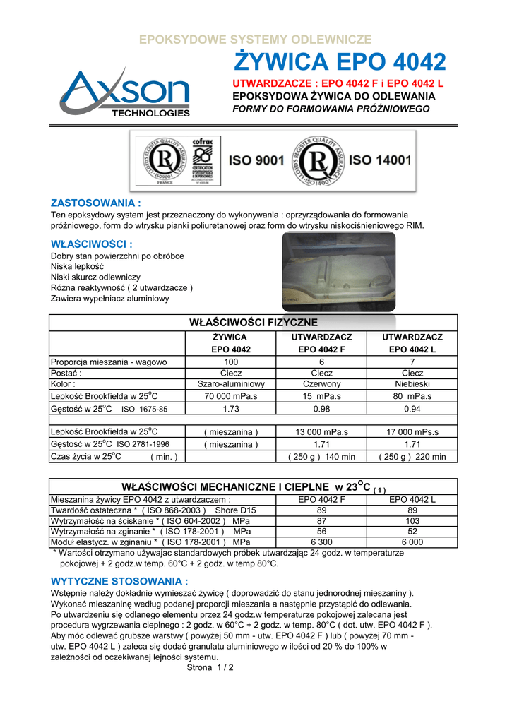 EPOKSYDOWE SYSTEMY ODLEWNICZE ŻYWICA EPO 4042 UTWARDZACZE : EPO 4042 F i EPO 4042 L EPOKSYDOWA ŻYWICA DO ODLEWANIA FORMY DO FORMOWANIA PRÓŻNIOWEGO ZASTOSOWANIA : Ten epoksydowy system jest przeznaczony do wykonywania : oprzyrządowania do formowania próżniowego, form do wtrysku pianki poliuretanowej oraz form do wtrysku niskociśnieniowego RIM. WŁAŚCIWOŚCI : Dobry stan powierzchni po obróbce Niska lepkość Niski skurcz odlewniczy Różna reaktywność ( 2 utwardzacze ) Zawiera wypełniacz aluminiowy WŁAŚCIWOŚCI FIZYCZNE Proporcja mieszania - wagowo Postać : Kolor : Lepkość Brookfielda w 25oC Gęstość w 25oC ISO 1675-85 Lepkość Brookfielda w 25oC Gęstość w 25oC ISO 2781-1996 Czas życia w 25oC ( min. ) ŻYWICA EPO 4042 100 Ciecz Szaro-aluminiowy 70 000 mPa.s 1.73 UTWARDZACZ EPO 4042 F 6 Ciecz Czerwony 15 mPa.s 0.98 UTWARDZACZ EPO 4042 L 7 Ciecz Niebieski 80 mPa.s 0.94 ( mieszanina ) ( mieszanina ) 13 000 mPa.s 1.71 ( 250 g ) 140 min 17 000 mPs.s 1.71 ( 250 g ) 220 min WŁAŚCIWOŚCI MECHANICZNE I CIEPLNE w 23OC ( 1 ) Mieszanina żywicy EPO 4042 z utwardzaczem : EPO 4042 F EPO 4042 L Twardość ostateczna * ( ISO 868-2003 ) Shore D15 89 89 Wytrzymałość na ściskanie * ( ISO 604-2002 ) MPa 87 103 Wytrzymałość na zginanie * ( ISO 178-2001 ) MPa 56 52 Moduł elastycz. w zginaniu * ( ISO 178-2001 ) MPa 6 300 6 000 * Wartości otrzymano używajac standardowych próbek utwardzając 24 godz. w temperaturze pokojowej + 2 godz.w temp. 60°C + 2 godz. w temp 80°C. WYTYCZNE STOSOWANIA : Wstępnie należy dokładnie wymieszać żywicę ( doprowadzić do stanu jednorodnej mieszaniny ). Wykonać mieszaninę według podanej proporcji mieszania a następnie przystąpić do odlewania. Po utwardzeniu się odlanego elementu przez 24 godz.w temperaturze pokojowej zalecana jest procedura wygrzewania cieplnego : 2 godz. w 60°C + 2 godz. w temp. 80°C ( dot. utw. EPO 4042 F ). Aby móc odlewać grubsze warstwy ( powyżej 50 mm - utw. EPO 4042 F ) lub ( powyżej 70 mm utw. EPO 4042 L ) zaleca się dodać granulatu aluminiowego w ilości od 20 % do 100% w zależności od oczekiwanej lejności systemu. Strona 1 / 2 EPOKSYDOWE SYSTEMY ODLEWNICZE ŻYWICA EPO 4042 UTWARDZACZE : EPO 4042 F i EPO 4042 L EPOKSYDOWA ŻYWICA DO ODLEWANIA FORMY DO FORMOWANIA PRÓŻNIOWEGO W przypadku używania utwardzacza EPO 4042 L kompozycja nadaje się do rozformowania po 24 h ale w cienkich przekrojach nie osiąga końcowej wytrzymałości. W takich przypadkach doradzamy pozostawienie odlewu w negatywie na następne 24 h i wygrzewanie wg cyklu: 2 h w 60°C + 2 h w 80°C Gdy decydujemy się na rozformowanie po 24 h cykl wygrzewania powinien być następujący: 2 h w 40°C + 2 h w 60°C + 2 h w 80°C. WŁAŚCIWOŚCI MECHANICZNE I CIEPLNE w 23OC ( 1 ) Mieszanina żywicy EPO 4042 z utwardzaczem : EPO 4042 F o C Temperatura zeszklenia T.M.A - Mettler Po 3 dniach w temp. 23°C 42 Po 2 godz. w temp. 60°C 50 Po 2 godz. w 60° + 2 godz. w 80°C 75 o Po 16 godz. w 80 C 80 -6 -1 10 K Współczynnik Rozszerzalności Cieplnej (CTE) 47 Skurcz liniowy ( 250 x 50 x 50 mm ) mm/m 1,1 Zalecana maksymalna grubość odlewu mm 50 Czas rozformowania w temp. pokojowej h. 16 - 24 * właściwości otrzymano na standartowych próbkach po cyklu utwardzania: 24 gh w temperaturze pokojowej + 2 h w 60°C + 2 h w 80°C. EPO 4042 L 42 48 74 80 43 0,5 70 36 - 48 BEZPIECZEŃSTWO I HIGIENA PRACY : Zwykłe środki bezpieczeństwa powinny być zachowane podczas pracy z tym produktem : - zapewnić dobrą wentylację - używanie rękawic, okularów i ubrania ochronnego Dokładniejsze informacje zawarte są w kartach charakterystyki obu składników kompozycji. PRZECHOWYWANIE : Okres składowania wynosi 12 miesięcy w oryginalnych nie otwieranych pojemnikach przechowywanych w temperaturze pomiędzy 15 i 25oC . OPAKOWANIA : ŻYWICA EPO 4042 2 x 5,00 kg 1 x 10,00 kg UTWARDZACZ EPO 4042 F 2 x 0,30 kg 1 x 0.60 kg UTWARDZACZ EPO 4042 L 2 x 0,35 kg 1 x 0.70 kg GWARANCJA : Wszystkie informacje zawarte powyżej są rezultatem badań i testów przeprowadzonych w naszym laboratorium w ściśle określonych warunkach. Użytkownik ponosi pełną odpowiedzialność za określenie przydatności ( w swoich warunkach ) produktu AXSON ( przed dokonaniem zakupu ) do proponowanego zastosowania. AXSON gwarantuje zgodność swojego produktu z jego specyfikacją lecz nie może zagwarantować jego kompatybilności z jakimkolwiek szczególnym zastosowaniem. AXSON odrzuca jakąkolwiek odpowiedzialność za zniszczenia lub wypadki, które spowodowane zostały użyciem jego produktów. Odpowiedzialność AXSON jest ściśle ograniczona do zwrotu pieniędzy lub wymiany produktu nie zgodnego z jego specyfikacją. AMOD - Andrzej Modrzewski Przedstawiciel w Polsce : 01-793 Warszawa ul. Rydygiera 8 tel. / fax. ( 0-22 ) 633-85-06 tel. ( 0-22 ) 669-39-76 tel. komórkowy ( 0-602 ) 26-11-15 INTERNET: www.amod.pl oraz www.amod.com.pl e-mail:[email protected] Strona 2 / 2