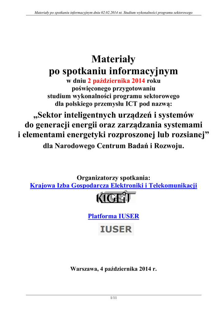 Materiały po spotkaniu informacyjnym dniu 02.02.2014 nt. Studium wykonalności programu sektorowego Materiały po spotkaniu informacyjnym w dniu 2 października 2014 roku poświęconego przygotowaniu studium wykonalności programu sektorowego dla polskiego przemysłu ICT pod nazwą: „Sektor inteligentnych urządzeń i systemów do generacji energii oraz zarządzania systemami i elementami energetyki rozproszonej lub rozsianej” dla Narodowego Centrum Badań i Rozwoju. Organizatorzy spotkania: Krajowa Izba Gospodarcza Elektroniki i Telekomunikacji Platforma IUSER Warszawa, 4 października 2014 r. 1/11 Materiały po spotkaniu informacyjnym dniu 02.02.2014 nt. Studium wykonalności programu sektorowego Spis treści: I. WSPÓŁPRACA Z BRANŻĄ ENERGETYCZNĄ W OBSZARZE INNOWACYJNOŚCI .. 3 II. UCZESTNICTWO W PRACACH PLATFORMY IUSER .................................................... 4 III. UCZESTNICTWO W PRACACH WARSZTATÓW RYNKU ENERGII ............................ 8 IV. ORGANIZACJA WSPÓŁPRACY Z ZESPOŁEM PRZYGOTOWUJĄCYM STUDIUM WYKONALNOŚCI PROGRAMU SEKTOROWEGO .......................................................... 9 V. WYCIĄG Z OFERTY NA OPRACOWANIE STUDIUM WYKONALNOŚCI ................. 10 2/11 Materiały po spotkaniu informacyjnym dniu 02.02.2014 nt. Studium wykonalności programu sektorowego I. Współpraca z branżą energetyczną w obszarze innowacyjności Krajowa Izba Gospodarcza Elektroniki i Telekomunikacji (KIGEiT) ponad 3 lata temu przystąpiła do ustanowienia platformy współpracy z energetyką. Celem głównym tej inicjatywy jest wykorzystanie potencjału krajowego przemysłu ICT w modernizacji i wzmocnieniu innowacyjności tej branży. Włączyliśmy się w prace Warsztatów Rynku Energii (WRE) oraz byliśmy jednym z inicjatorów utworzenia platformy współpracy technologicznej nauki z przemysłem IUSER (Inteligentne Urządzenia i Systemy Energetyki Rozproszonej). Przygotowując się do współpracy z rynkiem sieci elektroenergetycznych, Zarząd KIGEiT przeprowadził proces konsultacji ze wszystkimi zainteresowanymi przedsiębiorstwami zrzeszonymi w Izbie. Proces ten obejmował cykl spotkań wewnętrznych, udział w debacie publicznej na temat energetyki oraz prezentacje dorobku w trakcie czterech konferencji programowych poświęconych: nowej technice i technologiom powstającym w sektorze ICT, obejmującym: - mikrogenerację, - magazynowanie energii elektrycznej i cieplnej, - motoryzację elektryczną, - przesył energii, - dystrybucję energii, - monitorowanie sieci infrastruktury krytycznej, - usługi sieci klasy Smart-X (Smart City, Smart Grids, ESCO itd.) - zarządzanie sieciami i jej elementami; znaczeniu i perspektywom rozwoju i implementacji OZE; roli warstwy teleinformatycznej w sieciach inteligentnych; nowym technologiom z obszaru ICT, znajdującym powszechne zastosowanie w sieciach infrastruktury krytycznej. Uczestniczymy w debacie na temat zmian w prawie regulującym sposób funkcjonowania sieci energetycznych. Przygotowaliśmy i przesłaliśmy nasze uwagi i oczekiwania dot. ustawy o OZE. Opracowaliśmy własną strategię energetyczną, której istotą jest specjalizacja przemysłu ICT w zakresie nowych technologii energetycznych . Przygotowaliśmy szereg wystąpień programowych poświęconych innowacyjności, Internetowi Rzeczy oraz cyfryzacji/modernizacji energetyki i sieci infrastruktury krytycznej. W ramach WRE podjęliśmy współpracę w kilku zespołach tematycznych analizujących i programujących rozwój inteligentnych sieci elektroenergetycznych. Szczególnie dużo uwagi poświęciliśmy pracom nad wspólną specyfikacją techniczną dla systemów AMI (Advanced Measurement Infrastructure). Dotychczasowe wyniki tych prac krótko podsumowano w dalszej części notatki. Aktywność w ramach platformy IUSER jest praktycznym wyrazem działania na rzecz podnoszenia innowacyjności polskiego przemysłu ICT oraz modernizacji/cyfryzacji sieci infrastruktury krytycznej. 3/11 Materiały po spotkaniu informacyjnym dniu 02.02.2014 nt. Studium wykonalności programu sektorowego II. Uczestnictwo w pracach platformy IUSER Inicjatywa utworzenia platformy IUSER była wynikiem konieczności przejścia do bardziej innowacyjnego etapu rozwoju krajowego przemysłu ICT. Założyliśmy, że uzyskanie istotnych efektów komercyjnych możliwe jest tylko poprzez koncentrację sił i środków na wybranych obszarach, które cechuje wysoki popyt na rynku UE oraz duży potencjał wzrostu. Stoimy też na stanowisku, że najszybsze efekty możemy uzyskać poprzez konwergencję już istniejących produktów i technologii. W związku z tym opracowaliśmy strategię wzrostu innowacyjności naszej branży w oparciu o potrzeby modernizacyjne energetyki i nieuchronną konwergencję technologii energetycznych i ICT. Aktualna sytuacja rynkowa wskazuje na: przyspieszoną transformację techniczną branży elektroenergetycznej polegającą na budowie ISE (Inteligentnych Sieci Energetycznych - Smart Grids), rosnący rynek zbytu na produkty przemysłu ICT na większości rynków UE, zainteresowanie krajowego przemysłu ICT produkcją urządzeń, systemów i oprogramowania dla energetyki obywatelskiej, rozwój sieci następnej generacji zdolnych do świadczenia usług M2M (Internetu Rzeczy). Opisana powyżej sytuacja rynkowa generuje następujące potrzeby branży w zakresie B+R: przetworzenie programu budowy specjalizacji przemysłowej na konkretny program rozwoju kluczowych produktów i technologii dla energetyki obywatelskiej, wsparcie dla rozwoju produktów i usług M2M/Internetu Rzeczy, wzmocnienie zainteresowania sektora nauki potrzebami B+R przemysłu ICT. Przystępując do platformy IUSER zadeklarowaliśmy zainteresowanie rozwojem równoległym warstw sprzętowych i oprogramowania w zakresie: produktów i oprogramowania BMS dla magazynów energii elektrycznej i cieplnej, Odnawialnych Źródeł Energii dla mikroinstalacji i małych instalacji, urządzeń elektroniki energ