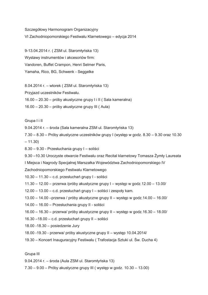 Szczegółowy Harmonogram Organizacyjny VI Zachodniopomorskiego Festiwalu Klarnetowego – edycja 2014 9-13.04.2014 r. ( ZSM ul. Staromłyńska 13) Wystawy instrumentów i akcesoriów firm: Vandoren, Buffet Crampon, Henri Selmer Paris, Yamaha, Rico, BG, Schwenk - Seggelke 8.04.2014 r. – wtorek ( ZSM ul. Staromłyńska 13) Przyjazd uczestników Festiwalu. 16.00 – 20.30 – próby akustyczne grupy I i II ( Sala kameralna) 16.00 – 20.30 – próby akustyczne grupy III ( Aula) Grupa I i II 9.04.2014 r. – środa (Sala kameralna ZSM ul. Staromłyńska 13) 7.30 – 8.30 – Próby akustyczne uczestników grupy I (występ w godz. 8.30 – 9.30 oraz 10.30 – 11.30) 8.30 – 9.30 - Przesłuchania grupy I – soliści 9.30 –10.30 Uroczyste otwarcie Festiwalu oraz Recital klarnetowy Tomasza Żymły Laureata I Miejsca i Nagrody Specjalnej Marszałka Województwa Zachodniopomorskiego IV Zachodniopomorskiego Festiwalu Klarnetowego 10.30 – 11.30 – c.d. przesłuchań grupy I - soliści 11.30 – 12.00 – przerwa /próby akustyczne grupy I – występ w godz.12.00 – 13.00/ 12.00 – 13.00 – c.d. przesłuchań grupy I – soliści i zespoły kam. 13.00 – 14.00 –przerwa / próby akustyczne grupy II – występ w godz.14.00 – 16.00/ 14.00 – 16.00 – Przesłuchania grupy II - soliści 16.00 – 16.30 – przerwa/ próby akustyczne grupy II – występ w godz.16.30 – 18.00/ 16.30 –18.00 – c.d. przesłuchań grupy II – soliści 18.00 -18.30 – posiedzenie Jury 18.00 -19.30 - przerwa/ próby akustyczne grupy II – występ 10.04.2014/ 19.30 – Koncert Inauguracyjny Festiwalu ( Trafostacja Sztuki ul. Św. Ducha 4) Grupa III 9.04.2014 r. – środa (Aula ZSM ul. Staromłyńska 13) 7.30 – 9.00 – Próby akustyczne grupy III ( występ w godz. 10.30 – 13.00) 9.00 – 9.30 - Posiedzenie Jury 9.30 –10.30 Uroczyste otwarcie Festiwalu oraz Recital klarnetowy Tomasza Żymły Laureata I Miejsca i Nagrody Specjalnej Marszałka Województwa Zachodniopomorskiego IV Zachodniopomorskiego Festiwalu Klarnetowego 10.30 – 13.00 – Przesłuchania grupy III – soliści 13.00 – 14.00 - przerwa / próby akustyczne grupy III ( występ w godz. 14.00 – 16.00) 14.00 – 16.00 – c.d. przesłuchań grupy III – soliści 16.00 – 16.30 – przerwa / próby akustyczne – występ w godz. 16.30 – 18.00) 16.30 – 18.00 - c.d. przesłuchań grupy III – soliści 18.00 – 18.30 – posiedzenie Jury 18.30 – 19.30 – przerwa/ próby akustyczne grupy III ( występ -10 kwietnia) 19.30 – Koncert Inauguracyjny Festiwalu ( Trafostacja Sztuki ul. Św. Ducha 4) Grupa II 10.04.2014 r. - czwartek (Sala kameralna ZSM ul. Staromłyńska 13) 7.30 – 8.30 – Próby akustyczne grupy II – występ w godz. 8.30 – 10.30 8.30 – 10.30 – c.d. przesłuchań grupy II – soliści i zespoły kameralne 10.30 – 11.30 – posiedzenie Jury 10.30 – 11.30 – Prezentacja - wykład nt. Pochodzenie i początki klarnetu Prowadzenie: Dariusz Egielman – Sopot ( Sala rytmiczno - kameralna ) 12.00 - ogłoszenie wyników grupy I i II - Koncert Laureatów ( AULA) Grupa III 10.04.2014 r. - czwartek (Aula ZSM ul. Staromłyńska 13) 7.30 – 8.45 – Próby akustyczne grupy III – soliści ( występ w godz. 9.00 – 11.30) 9.00 – 11.30 – c.d. przesłuchań grupy III – soliści 12.00 – 13.00 - ogłoszenie wyników grupy I i II - Koncert Laureatów ( AULA) 13.00 – 14.00 – przerwa / próby akustyczne grupy III –soliści i zespoły kameralne (występ w godz. 14.00 – 16.00) 14.00 – 16.00 – c.d. przesłuchań grupy III –soliści i zespoły kameralne 16.00 – 17.00 – Posiedzenie Jury grupy III 16.00- 17.00 - Wykład „Stroik i jego tajemnice” - prowadzenie dr hab. Jan Jakub Bokun – Akademia Muzyczna we Wrocławiu ( Sala Kameralna) 17.00 – 18.30 – Master Class – prof. Guy Dangain (Sala Kameralna) 19.30 – 20.30 – Koncert Gwiazdy Festiwalu ( 13 Muz, Plac Żołnierza Polskiego 2) Ok. godz. 21.00 – Ogłoszenie wyników grupy III i Koncert Laureatów ( Aula ZSM) Grupa IV 11.04.2014 r. - piątek ( Aula ZSM ul. Staromłyńska 13) 7.30. – 9.00 – Próby akustyczne grupy IV- soliści ( występ w godz. 9.00 – 11.30) 8.30 – 9.00 – Posiedzenie Jury grupy IV 9.00 – 11.30 – Przesłuchania grupy IV – soliści 9.30 – 11.00 – Warsztaty klarnetowe dla uczniów i nauczycieli - lekcje otwarte Prowadzenie prof. Mieczysław Stachura – AM Wrocław ( Sala Kameralna ) 11.00 – 12.00 – Pokaz multimedialny – RICO ( Sala Kameralna) 11.30 – 12.00 - Próby akustyczne grupy IV- soliści ( występ w godz. 12.00 – 13.00) 12.00 – 13.00 – c.d. przesłuchań grupy IV – soliści 13.00 – 14.00 – Przerwa / próby akustyczne grupy IV – soliści ( występ w godz. 14.00 – 17.00) 14.00 – 17.00 – c.d. przesłuchań grupy IV- soliści 16.00 – 17.30 - Master Class Prowadzenie – Ricardo Crocilla – Włochy ( Sala Kameralna ZSM) 19.00 – 21.30 – Koncert Symfoniczny ( Filharmonia Szczecińska) Grupa IV 12.04.2014 r. sobota (Aula ZSM ul. Staromłyńska 13) 7.30 – 8.45 – Próby akustyczne grupy IV – soliści ( występ w godz. 9.00 – 12.00) 8.30 – 9.00 – Posiedzenie Jury grupy IV 9.00 – 12.00 – Przesłuchania grupy IV – soliści 12.00 – 13.00 – Koncert południowy - Karel Dohnal – klarnet solo (Aula ZSM) 13.00 – 14.00 – Przerwa / próby akustyczne grupy IV – soliści ( występ w godz. 14.0017.00) 14.00 - 17.00– c. d. przesłuchań grupy IV – soliści 17.00 – 18.00 – Posiedzenie Jury grupy IV 19.30 – Koncert przy świecach – 13 Muz Ok. 21.00 – Ogłoszenie wyników grupy IV (soliści) i Koncert Laureatów Grupa IV 13.04.2014 r. niedziela ( Aula ZSM ul. Staromłyńska 13) 8.00 – 9.00 – Próby akustyczne grupy IV – zespoły kameralne 9.00- 13.00 – Przesłuchania grupy IV – zespoły kameralne 13.00 – 14.00 – Posiedzenie Jury grupy IV 14.00 –15.00 – Przerwa 15.00 - 16.00 Ogłoszenie wyników grupy IV- zespoły kame