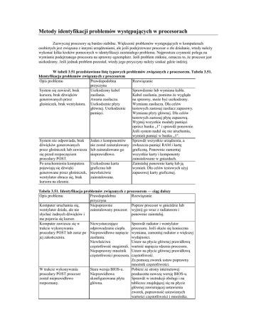 Metody identyfikacji problemów występujących w procesorach Zazwyczaj procesory są bardzo stabilne. Większość problemów występujących w komputerach osobistych jest związana z innymi urządzeniami, ale jeśli podejrzewasz procesor o złe działanie, wtedy naleŜy wykonać kilka kroków pomocnych w identyfikacji zaistniałego problemu. Najprostsza czynność polega na wymianie podejrzanego procesora na sprawny egzemplarz. Jeśli problem zniknie, oznacza to, Ŝe procesor jest uszkodzony. Jeśli jednak problem pozostał, wtedy jego przyczyny naleŜy szukać gdzie indziej. W tabeli 3.51 przedstawiono listę typowych problemów związanych z procesorem. Tabela 3.51. Identyfikacja problemów związanych z procesorem Opis problemu Prawdopodobna Rozwiązanie przyczyna System się zawiesił, brak Uszkodzony kabel Sprawdzenie lub wymiana kabla. kursora, brak dźwięków zasilania. Kabel zasilania, pomimo Ŝe wygląda generowanych przez Awaria zasilacza. na sprawny, moŜe być uszkodzony. głośniczek, brak wentylatora. Uszkodzenie płyty Wymiana zasilacza. Dla celów głównej. Uszkodzenie testowych zastosuj zasilacz zapasowy. pamięci. Wymiana płyty głównej. Dla celów testowych zastosuj płytę zapasową. Wyjmij wszystkie moduły pamięci oprócz banku „1" i sprawdź ponownie. Jeśli system nadal się nie uruchamia, wymień pamięć w banku „1". System nie odpowiada, brak Jeden z komponentów Sprawdź wszystkie urządzenia, a dźwięków generowanych nie został zainstalowany zwłaszcza pamięć RAM i kartę przez głośniczek lub zawiesza lub zainstalowano go graficzną. Ponownie zamontuj nieprawidłowo. się przed rozpoczęciem wszystkie karty i komponenty procedury POST. zainstalowane w gniazdach. Po uruchomieniu komputera Uszkodzona karta Zainstaluj ponownie kartę lub ją pojawiają się dźwięki graficzna lub wymień. Dla celów testowych uŜyj generowane przez głośniczek, niewłaściwie zapasowej karty graficznej. wentylator obraca się, brak zainstalowana. kursora na ekranie. Tabela 3.51. Identyfikacja problemów związanych z procesorem — ciąg dalszy Opis problemu Prawdopodobna Rozwiązanie przyczyna Komputer uruchamia się, Niepoprawnie Popraw procesor w gnieździe lub wentylator działa, ale nie zainstalowany procesor. wyjmij go wraz z radiatorem i słychać Ŝadnych dźwięków i ponownie zainstaluj. me pojawia się kursor. Komputer zawiesza się w Niewystarczające Sprawdź radiator i wentylator trakcie wykonywania odprowadzanie ciepła. procesora. Jeśli okaŜe się konieczna procedury POST lub zaraz po Nieprawidłowe napięcie wymiana, zamontuj radiator o większej jej zakończeniu. zasilania. wydajności. Niewłaściwa Ustaw na płycie głównej prawidłową częstotliwość magistrali. wartość napięcia rdzenia procesora. Niepoprawny mnoŜnik Ustaw na płycie głównej prawidłową częstotliwości procesora. częstotliwość. Za pomocą zworek ustaw poprawny mnoŜnik częstotliwości. W trakcie wykonywania Stara wersja BIOS-u. Pobierz ze strony internetowej procedury POST procesor Nieprawidłowa producenta nowszą wersję BIOS-u. został nieprawidłowo skonfigurowana płyta Sprawdź w instrukcji obsługi i na rozpoznany. główna. tabliczce znajdującej się na płycie głównej zawierającej ustawienia zworek, poprawność ustawionych wartości częstotliwości i mnoŜnika. Po zainstalowaniu nowego procesora nie jest moŜliwe uruchomienie komputera. System operacyjny nie uruchamia się. System działa, ale na ekranie nic nie widać. Niepoprawnie zamontowany procesor. BIOS nie obsługuje nowego procesora. Płyta główna nie współpracuje z nowym procesorem. Niewystarczające odprowadzanie ciepła. Nieprawidłowe napięcie zasilania. Niewłaściwa częstotliwość magistrali. Niepoprawny mnoŜnik częstotliwości procesora. Nie zainstalowano lub nie uruchomiono wymaganych aplikacji. Uszkodzony lub wyłączony monitor. Popraw procesor w gnieździe lub wyjmij go wraz z radiatorem i ponownie zainstaluj. Pobierz od producenta komputera lub płyty głównej aktualizację BIOS-u. Sprawdź zakres obsługi oferowanej przez płytę główną. Sprawdź radiator i wentylator procesora. Jeśli okaŜe się konieczna wymiana, zamontuj radiator o większej wydajności. MoŜe teŜ być niezbędne umieszczenie radiatora (wentylatora) na mostku północnym. Za pomocą zworek ustaw na płycie głównej prawidłową wartość napięcia rdzenia procesora. Za pomocą zworek ustaw na płycie głównej prawidłową częstotliwość. Za pomocą zworek ustaw na płycie głównej poprawny mnoŜnik częstotliwości. Jeśli zastosowano nieodpowiednie sterowniki urządzeń lub niekompatybilne urządzenia, naleŜy dokonać aktualizacji sterowników i sprawdzić informacje dotyczące problemów wynikających z niekompatybilności. Sprawdź monitor i jego zasilanie. Dla celów testowych uŜyj innego monitora. Jeśli w trakcie wykonywania procedury POST procesor nie został poprawnie rozpoznany, wtedy moŜe to oznaczać, Ŝe płyta główna nie została poprawnie skonfigurowana lub Ŝe BIOS moŜe wymagać aktualizacji. Upewnij się, Ŝe zworki znajdujące się na płycie głównej są ustawione zgodnie z wymaganiami zainstalowanego procesora oraz Ŝe płyta posiada najnowszą wersję BIOS-u. Jeśli po uruchomieniu komputera system generuje błędy, wtedy naleŜy spróbować obniŜyć wartość napięcia zasilania. Jeśli problem zniknie, moŜe to oznaczać, Ŝe procesor jest uszkodzony lub przetaktowany. Wiele problemów pozornie związanych ze sprzętem, tak naprawdę okazuje się być zamaskowanymi błędami oprogramowania. Upewnij się, Ŝe płyta główna jest wyposaŜona w najnowszą wersję BIOS-u oraz urządzenia współpracują z najnowszymi sterownikami. Dodatkowo warto zainstalować najnowszą wersję uŜywanego systemu operacyjnego, która zazwyczaj wywołuje mniejszą liczbę problemów.