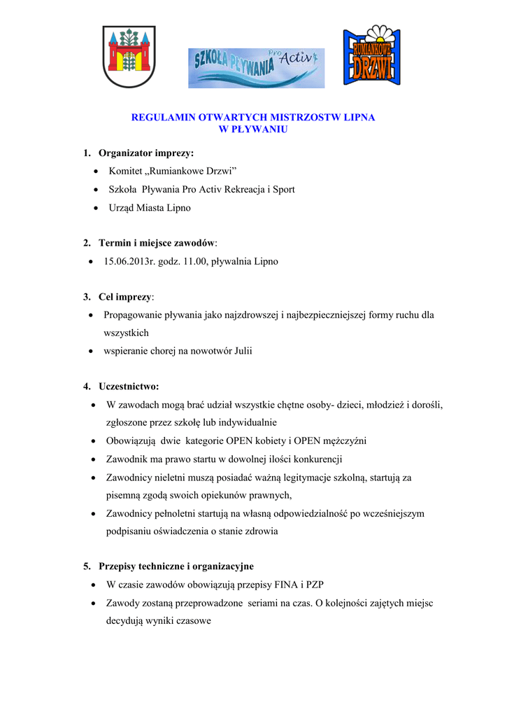 REGULAMIN OTWARTYCH MISTRZOSTW LIPNA W PŁYWANIU 1. Organizator imprezy: Komitet „Rumiankowe Drzwi” Szkoła Pływania Pro Activ Rekreacja i Sport Urząd Miasta Lipno 2. Termin i miejsce zawodów: 15.06.2013r. godz. 11.00, pływalnia Lipno 3. Cel imprezy: Propagowanie pływania jako najzdrowszej i najbezpieczniejszej formy ruchu dla wszystkich wspieranie chorej na nowotwór Julii 4. Uczestnictwo: W zawodach mogą brać udział wszystkie chętne osoby- dzieci, młodzież i dorośli, zgłoszone przez szkołę lub indywidualnie Obowiązują dwie kategorie OPEN kobiety i OPEN mężczyźni Zawodnik ma prawo startu w dowolnej ilości konkurencji Zawodnicy nieletni muszą posiadać ważną legitymacje szkolną, startują za pisemną zgodą swoich opiekunów prawnych, Zawodnicy pełnoletni startują na własną odpowiedzialność po wcześniejszym podpisaniu oświadczenia o stanie zdrowia 5. Przepisy techniczne i organizacyjne W czasie zawodów obowiązują przepisy FINA i PZP Zawody zostaną przeprowadzone seriami na czas. O kolejności zajętych miejsc decydują wyniki czasowe Rozstawienie zawodników w poszczególnych seriach nastąpi na zasadach ogólnych W sprawach nie ujętych w regulaminie decyduje Sędzia Główny zawodów Ostateczne interpretacja niniejszego regulaminu należy do organizatora Zgłoszenie się do zawodów jest równoznaczne z akceptacja regulaminu 6. Nagrody: Trzy pierwsze zawodniczki i trzech pierwszych zawodników w każdej kategorii otrzyma dyplomy oraz nagrody rzeczowe 7. Zasady finansowania: Koszty organizacyjne pokrywa organizator Koszty uczestnictwa-opłata startowa w kwocie 10 zł płatna bezpośrednio przed zawodami 8. Zgłoszenia: Zgłoszenia do zawodów należy dokonać w nieprzekraczalnym terminie do dnia 13.06.2013r. Zgłoszenia można dokonać osobiście w kasie pływalni (wypełnienie zgłoszenia i pozostawienie go), przesyłając na adres - [email protected], telefonicznie lub sms na nr 501472983