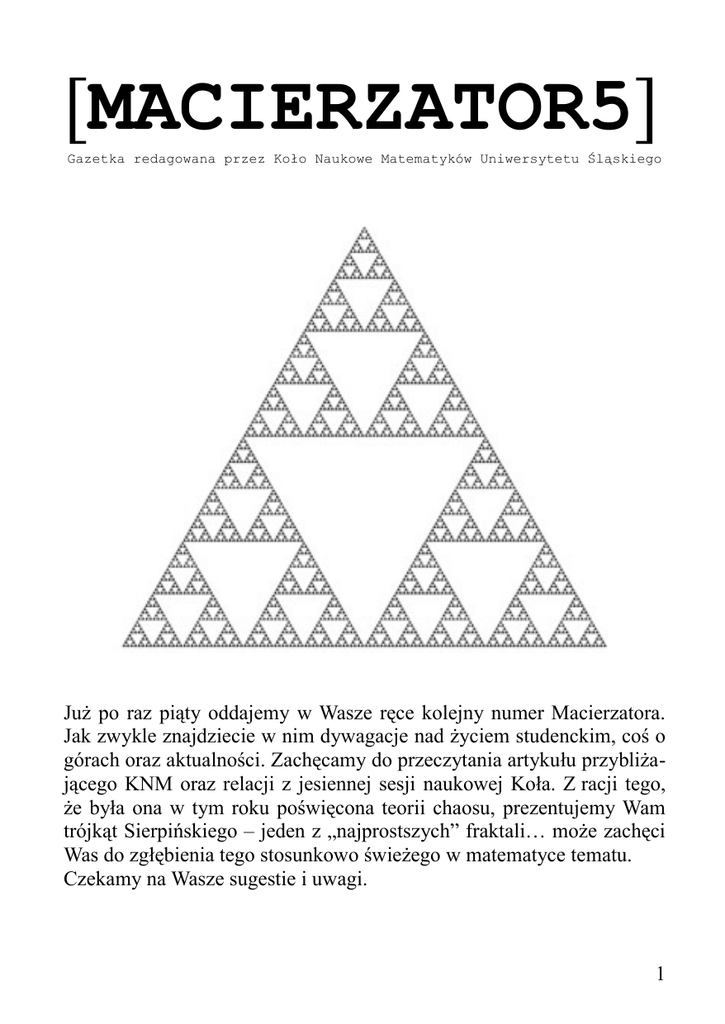 [MACIERZATOR5] Gazetka redagowana przez Koło Naukowe Matematyków Uniwersytetu Śląskiego Już po raz piąty oddajemy w Wasze ręce kolejny numer Macierzatora. Jak zwykle znajdziecie w nim dywagacje nad życiem studenckim, coś o górach oraz aktualności. Zachęcamy do przeczytania artykułu przybliżającego KNM oraz relacji z jesiennej sesji naukowej Koła. Z racji tego, że była ona w tym roku poświęcona teorii chaosu, prezentujemy Wam trójkąt Sierpińskiego – jeden z „najprostszych” fraktali… może zachęci Was do zgłębienia tego stosunkowo świeżego w matematyce tematu. Czekamy na Wasze sugestie i uwagi. 1 [Dywagacje nad życiem studenckim] Jest pewna sfera życia studenckiego, której chyba nigdy nie będę w stanie ogarnąć: studencka miłość. Do tej pory udawało mi się uniknąć zbędnych komplikacji na tym tle dzięki przemyślanej taktyce, a mianowicie przez wystarczająco wysokie postawienie poprzeczki. Moje zachowanie możecie sobie wytłumaczyć zwykłym lenistwem i pewnie będziecie mieli odrobinę racji. Gdy patrzę na te cudowne przykłady studenckiej miłości, na jakie raz po raz natykam się na Ukochanej Uczelni, uświadamiam sobie, jak wiele zabiegów i kosztów to wymaga. Jeśli delikwenci są z jednej grupy, sprawa jest cokolwiek ułatwiona. Nie trzeba uczyć się planu tej drugiej osoby, a potem pomykać na drugi koniec korytarza tylko po to, by cmoknąć, przytulić, wyżalić się, pocieszyć, nakarmić, zganić za niedostateczne wyrozumienie itd. Jednakże „współgrupowość” też ma swoje wady. Może przyczynić się do znacznego odizolowania od reszty grupy. Na przykład który normalny (tj. posiadający instynkt samozachowawczy) facet pozwoli sobie na czerpanie radości z męskiego towarzystwa kolegów, gdy nieopodal jego sympatia czeka by cmoknąć, przytulić, wyżalić się, pocieszyć, nakarmić… Dodatkowo pozbawia się tej kuszącej możliwości niewinnego flirtu z ponętnymi koleżankami, co u niektórych jest stawiane wyżej niż męskie rozmowy. Miłość studencka niesie ze sobą także poważne zagrożenia. Jednym z nich jest narażenie się na zawiść mniej szczęśliwych pod tym względem kolegów i koleżanek. Dowiedziono, że szczególnie na wiosnę częste są pobicia w okolicznościach p.t. „Spójrz tylko na mojego Misiaczka. Czyż on nie jest cudowny?”. Zresztą niebezpieczeństwo niefortunnego wypadku obejmuje również kolegów zakochanej pary. Już kilkakrotnie zdarzało mi się ratować jakiegoś nieszczęśnika przed zakrztuszeniem się na śmierć; sami przyznajcie, czasami nie sposób się powstrzymać, gdy widzicie dwie rozanielone postaci dzielące się każdym kąskiem, łyczkiem herbaty, wzdychające do siebie „moja całeczko”, „mój pierwiasteczku”, „mój epsilonku”… Nieuniknione po pewnym czasie są też pytania typu „jesteście jeszcze parą?”. Gdy odpowiedź jest negatywna, pociąga zazwyczaj za sobą konieczność wyjaśniania okoliczności zerwania (lepiej od razu to spisać, skserować pięćdziesiąt razy i rozdać całej grupie). Jeśli natomiast jeszcze jesteście parą, nawet najbardziej wyrozumiałemu/wyrozumiałej sam fakt zaistnienia takiego pytania nasuwa wątpliwości (szczególnie kobiety są mistrzyniami w wyolbrzymianiu) „czy może wydarzyło się coś o czym nie wiem?”. A skoro już przy tym jesteśmy, to co w razie zerwania? W najlepszym wypadku konieczność ignorowania swojego towarzystwa przez długie, pozostałe do skończenia studiów lata. Przeciwna alternatywa, czyli trwałość związku prowadząca do ślubu 2 nie jest o wiele lepsza; wystarczy pomyśleć z odrobiną empatii o dzieciach z małżeństw matematycznych. Cóż, jakkolwiek by na to nie spojrzeć, studencka miłość niewątpliwie dodaje kolorytu uczelnianej codzienności. Dostarcza tematu do plotek i powodów do śmiechu (a przynajmniej do ironicznego chichotu). Zatem wszystko jest w porządku, dopóki samemu nie wpadnie się w jej sidła i nie zacznie spoglądać na całą sprawę z całkiem innej strony. Jeśli mnie to kiedyś spotka, obiecuję, napiszę o tym nowy felieton. O tym, jak to biegnę przez korytarz aby cmoknąć, przytulić, wyżalić się, pocieszyć, nakarmić… Kufak [Marta] Minęła połowa listopada, co oznacza, że już od półtora miesiąca z uśmiechem na twarzy krzątamy się po uczelnianych korytarzach. Nasze humory na próbę poddała „złota polska zima”, która niespodziewanie zawitała w pierwszych dniach miesiąca. Dzięki temu już na początku listopada mogliśmy dokonać naszego pierwszego śniegowego wejścia na Skrzyczne i Szyndzielnię i poczuć się jak Krzysztof Wielicki, kiedy po raz pierwszy zdobywał Mont Everest zimą. Mnie niestety nie było jeszcze dane tej zimo-jesieni wspinanie się po górach, a do tego moje najbliższe plany wyjazdowe dotyczą raczej turystyki nizinnej, która na szczęście także przedstawia ogromne walory poznawcze. Brakuje w niej tylko ciągłego łażenia w górę i w dół i w górę i w dół… czyli tego co w górach kochamy najbardziej. W ostatni weekend przed pierwszym nadejściem długo oczekiwanych opadów śniegu (czyli dawno temu) postanowiłem pokazać polskie góry koleżance z Hiszpanii. Ona, zakochana w bezkresnym wędrowaniu mieszkanka górskiej miejscowości, z wielką ochotą przyjęła propozycję. Podczas podejścia na Stożek, który był naszym pierwszym celem, postanowiliśmy odpocząć na chwilę w celu uzupełnienia napojów i spotkaliśmy trójkę „prawdziwych” turystów. Ubrani w nowe kurtki z Gore-Tex’u, buty Meindla i najdroższe plecaki zatrzymali się także na posiłek. Wyciągnęli termos z herbatą, kanapki, banany, a niestety wszelkie resztki poleciały w las i przez najbliższych kilka tysięcy lat będą rozkładały się w ziemi. A czy tak trudno byłoby włożyć je do nowego plecaka i wyrzucić do kosza na śmieci w schronisku na Stożku, do którego poszli? Niestet
