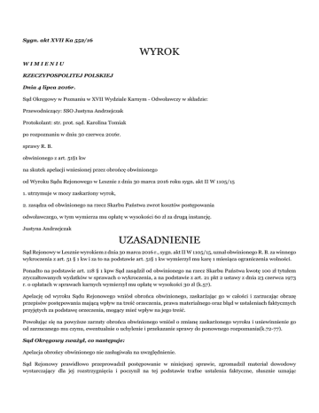 Sygn. akt XVII Ka 552/16 WYROK WIMIENIU RZECZYPOSPOLITEJ POLSKIEJ Dnia 4 lipca 2016r. Sąd Okręgowy w Poznaniu w XVII Wydziale Karnym - Odwoławczy w składzie: Przewodniczący: SSO Justyna Andrzejczak Protokolant: str. prot. sąd. Karolina Tomiak po rozpoznaniu w dniu 30 czerwca 2016r. sprawy R. B. obwinionego z art. 51§1 kw na skutek apelacji wniesionej przez obrońcę obwinionego od Wyroku Sądu Rejonowego w Lesznie z dnia 30 marca 2016 roku sygn. akt II W 1105/15 1. utrzymuje w mocy zaskarżony wyrok, 2. zasądza od obwinionego na rzecz Skarbu Państwa zwrot kosztów postępowania odwoławczego, w tym wymierza mu opłatę w wysokości 60 zł za drugą instancję. Justyna Andrzejczak UZASADNIENIE Sąd Rejonowy w Lesznie wyrokiem z dnia 30 marca 2016 r., sygn. akt II W 1105/15, uznał obwinionego R. B. za winnego wykroczenia z art. 51 § 1 kw i za to na podstawie art. 51§ 1 kw wymierzył mu karę 1 miesiąca ograniczenia wolności. Ponadto na podstawie art. 118 § 1 kpw Sąd zasądził od obwinionego na rzecz Skarbu Państwa kwotę 100 zł tytułem zryczałtowanych wydatków w sprawach o wykroczenia, a na podstawie z art. 21 pkt 2 ustawy z dnia 23 czerwca 1973 r. o opłatach w sprawach karnych wymierzył mu opłatę w wysokości 30 zł (k.57). Apelację od wyroku Sądu Rejonowego wniósł obrońca obwinionego, zaskarżając go w całości i zarzucając obrazę przepisów postępowania mającą wpływ na treść orzeczenia, prawa materialnego oraz błąd w ustaleniach faktycznych przyjętych za podstawę orzeczenia, mogący mieć wpływ na jego treść. Powołując się na powyższe zarzuty obrońca obwinionego wniósł o zmianę zaskarżonego wyroku i uniewinnienie go od zarzucanego mu czynu, ewentualnie o uchylenie i przekazanie sprawy do ponownego rozpoznania(k.72-77). Sąd Okręgowy zważył, co następuje: Apelacja obrońcy obwinionego nie zasługiwała na uwzględnienie. Sąd Rejonowy prawidłowo przeprowadził postępowanie w niniejszej sprawie, zgromadził materiał dowodowy wystarczający dla jej rozstrzygnięcia i poczynił na tej podstawie trafne ustalenia faktyczne, słusznie uznając obwinionego za winnego zarzucanego mu wykroczenia. Ocena dowodów dokonana przez Sąd I instancji spełnia przy tym wymagania wynikające z art. 7 kpk w zw. z art. 8 kpw, a w szczególności nie jest dotknięta dowolnością. Również uzasadnienie zaskarżonego zawiera wszystkie elementy określone w art. 424 kpk w zw. z art. 82 § 1 kpw, co umożliwia jego kontrolę instancyjną. W żadnym razie też Sąd Rejonowy nie naruszył zasady rozstrzygania wątpliwości na korzyść obwinionego, bowiem przy ocenie dowodów i ustaleniach Sądu Rejonowego, w niniejszej sprawie brak było takowych. Wbrew twierdzeniu apelującego, Sąd Rejonowy miał pełne podstawy, by kierując się wskazaniami określonymi w art. 7 kpk w zw. z art. 8 kpw oprzeć ustalenia faktyczne na zeznaniach świadków M. i M. D. oraz Z. A. i zgromadzonych dokumentach, a odmówić uznania za wiarygodne wyjaśnień obwinionego, który zaprzeczył, jakoby swym zachowaniem dopuścił się zakłócania w dniu zdarzenia, spokoju sąsiadom. Oceniając zeznania wspomnianych świadków-pokrzywdzonych Sąd Rejonowy słusznie wziął pod uwagę, że wyłaniająca się z nich wersja zdarzenia korespondowała z zeznaniami obecnego na miejscu funkcjonariusza Policji Z. A., a także notatką urzędowa, nadesłaną z K. w L., z której wynikała ilość i tryb przeprowadzonych u obwinionego(k.44). Podkreślić należy, że po dotarciu na miejsce zdarzenia funkcjonariusz Policji udał się do domu pokrzywdzonych i wskazał kategorycznie:”…mówiła, że przyczyną właśnie jest ta dokuczliwa muzyka. Było słychać ją wyraźnie. Można było nawet rozpoznać, jaki utwór jest w danym momencie odtwarzany. Było słychać silne basy…”(k.49). Zatem osoba obiektywna, zupełnie nie związana z którąś ze stron postepowania, w sposób niezależny potwierdziła wyjątkową uciążliwość słyszalnej wyraźnie u pokrzywdzonych muzyki. Apelujący podniósł, iż nie widomo czy dźwięki pochodziły z posesji obwinionego. Trzeba w tym miejscu zaznaczyć, że sami pokrzywdzeni konsekwentnie wskazywali w toku postępowania, że w sposób uciążliwy muzykę odtwarza jedynie obwiniony, tak w dniu zdarzenia, jak wcześniej. Powyższe potwierdzają notatki z interwencji(k.44). Mało sam - R. B. w żadnym momencie w toku postępowania nie podnosił, by w dniu zdarzenia ktokolwiek z jego sąsiadów zamieszkujących w bliskości, od jego posesji, słuchał muzyki głośno, tak, że można było pomylić, gdzie znajduje się źródło hałasu. Zatem podnoszenie w apelacji, że muzyka, którą słyszeli pokrzywdzeni i funkcjonariusz Policji w dniu zdarzenia mogła pochodzić z innej działki, jest zupełnie bezpodstawne, niewątpliwie czynione wyłącznie na potrzeby postępowania odwoławczego. Jako takie, nie mogło być przedmiotem założenia i analizy Sądu I instancji , bowiem nie posiadało żadnego oparcia w materiale dowodowym. Wskazać też w tym miejscu trzeba, że ustalenie , jakiego sprzętu używał obwiniony w dniu zdarzenia, było rzeczą dla jego odpowiedzialności zupełnie nieistotną. Wystarczy, że była ona na tyle głośna, iż w domu pokrzywdzonych było ją słychać bardzo wyraźnie, a policjant nie miał wątpliwości :„ na pewno dochodziła z jakiegoś mocnego urządzenia, mały odtwarzacz nie ma takiej mocy.”(k.49) Niebyło też do kwestionowania oceny dowodu z zeznań świadka Ł. A., dokonanej przez Sąd I instancji. Sąd ten dał wiarę zeznaniom świadka, słusznie wskazał jedynie, że odmienne usytuowanie jej nieruchomości, co zrozumiałe, może spowodować inny też odbiór natężenia dźwięku. Jeszcze raz należy podkreślić ,iż w niniejszej sprawie Sąd Rejonowy oparł swe ustalenia nie tylko na subiektywny odczuciu państwa D., ale i na relacji policjanta przeprowadzającego interwencje, i to nie na pose