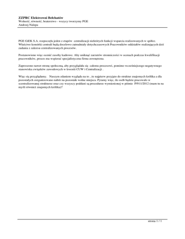 ZZPRC Elektrowni Bełchatów Wolność, równość, braterstwo - wszycy tworzymy PGE Andrzej Nalepa PGE GiEK S.A. rozpoczęła jeden z etapów centralizacji niektórych funkcji wsparcia realizowanych w spółce. Właściwe komórki centrali będą docelowo zatrudniały dotychczasowych Pracowników oddziałów realizujących dziś zadania z zakresu centralizowanych procesów. Postanowiono więc ocenić zasoby kadrowe. Aby uniknąć zarzutów stronniczości w ocenach podczas kwalifikacji pracowników, proces ma wspierać specjalistyczna firma zewnętrzna. Zaproszono nawet stronę społeczną, aby przyglądała się całemu procesowi, pomimo wcześniejszego negatywnego stanowiska związków zawodowych w kwestii CUW i Centralizacji . Więc się przyglądamy. Naszym zdaniem wygląda na to , że najpierw przyjęto do struktur znajomych królika a dla pozostałych zorganizowano nabór na pozostałe wolne miejsca. Pytamy więc, ile osób będzie pracowało w scentralizowanej strukturze oraz czy wszyscy poddani są procedurze wymienionej w piśmie P/911/2012 (mam tu na myśli również znajomych królika)? strona 1 / 1