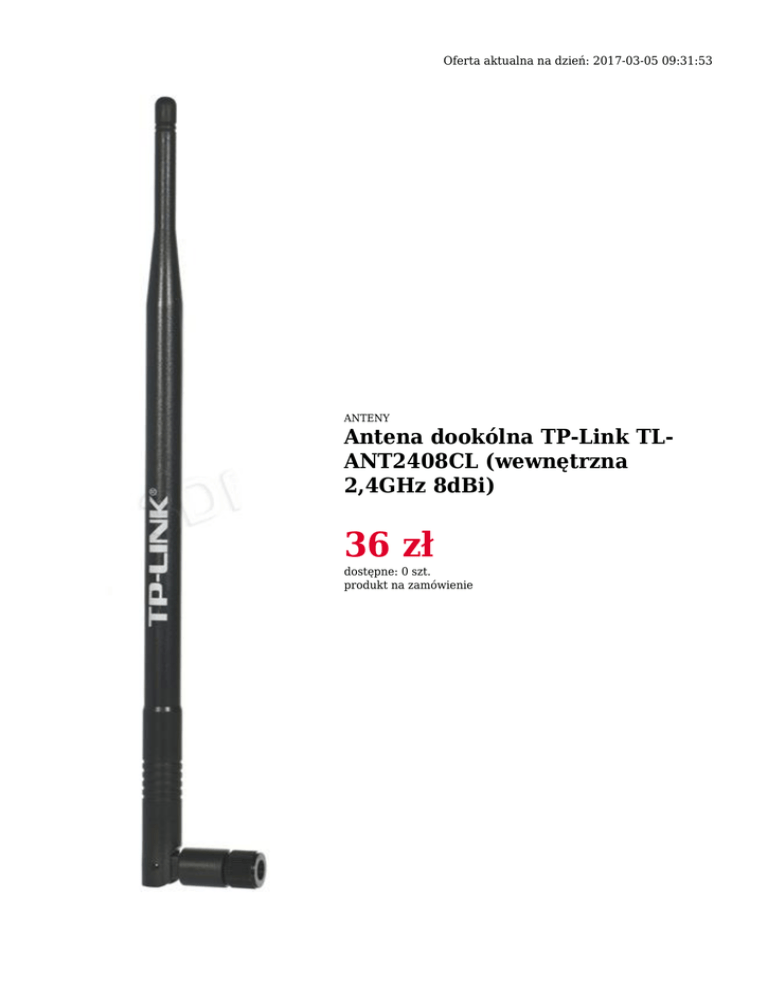 Oferta aktualna na dzień: 2017-03-05 09:31:53 ANTENY Antena dookólna TP-Link TLANT2408CL (wewnętrzna 2,4GHz 8dBi) 36 zł dostępne: 0 szt. produkt na zamówienie DANE TECHNICZNE ID produktu: SIETPLBAN0005 Dostępne 0 szt. (produkt na zamówienie) Producent TP-LINK Gwarancja F024M Produkt Antena dookólna Typ pasywna Rodzaj wewnętrzna Częstotliwość pracy ( podstawowa) 2,4 GHz Zysk energetyczny anteny 8 dBi Współczynnik dopasowania (VSWR) 1,92:1 Kąt promieniowania w poziomie 360 ° Kąt promieniowania w pionie 15 ° Obciążenie wiatrem (przy 200km/h) Nie dotyczy Złącze żeńskie RP-SMA Kolor czarny Miejsce montażu wewnątrz budynku Strona www produktu http://www.tp-link.com.pl/products/details/cat-5691_TL-ANT2408CL.html#specifications Podane ceny są cenami brutto. ** Mimo dołożenia wszelkich starań nie gwarantujemy, że publikowane dane techniczne nie zawierają uchybień lub błędów. Ewentualne błędne opisy nie mogą być podstawą do roszczeń, dlatego w przypadku jakichkolwiek wątpliwości prosimy przed podjęciem decyzji o zakupie o kontakt z handlowcem. * GALERIA