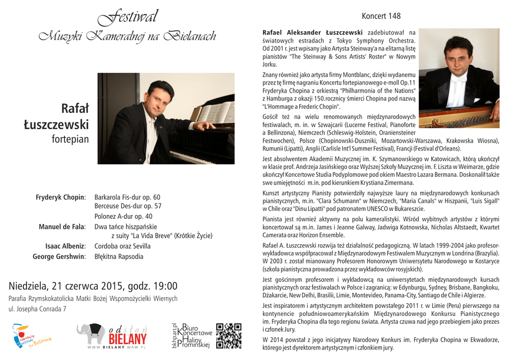 Festiwal Koncert 148 Muzyki Kameralnej na Bielanach Rafael Aleksander Łuszczewski zadebiutował na światowych estradach z Tokyo Symphony Orchestra. Od 2001 r. jest wpisany jako Artysta Steinway'a na elitarną listę pianistów "The Steinway & Sons Artists' Roster" w Nowym Jorku. Znany również jako artysta firmy Montblanc, dzięki wydanemu przez tę firmę nagraniu Koncertu fortepianowego e-moll Op.11 Fryderyka Chopina z orkiestrą "Philharmonia of the Nations" z Hamburga z okazji 150.rocznicy śmierci Chopina pod nazwą "L'Hommage a Frederic Chopin". Rafał Łuszczewski Gościł też na wielu renomowanych międzynarodowych festiwalach, m. in. w Szwajcarii (Lucerne Festival, Pianoforte a Bellinzona), Niemczech (Schleswig-Holstein, Oraniensteiner Festwochen), Polsce (Chopinowski-Duszniki, Mozartowski-Warszawa, Krakowska Wiosna), Rumunii (Lipatti), Anglii (Carlisle Int'l Summer Festival), Francji (Festival d'Orleans). fortepian Jest absolwentem Akademii Muzycznej im. K. Szymanowskiego w Katowicach, którą ukończył w klasie prof. Andrzeja Jasińskiego oraz Wyższej Szkoły Muzycznej im. F. Liszta w Weimarze, gdzie ukończył Koncertowe Studia Podyplomowe pod okiem Maestro Lazara Bermana. Doskonalił także swe umiejętności m.in. pod kierunkiem Krystiana Zimermana. Fryderyk Chopin: Manuel de Fala: Isaac Albeniz: George Gershwin: Barkarola Fis-dur op. 60 Berceuse Des-dur op. 57 Polonez A-dur op. 40 Dwa tańce hiszpańskie z suity "La Vida Breve" (Krótkie Życie) Cordoba oraz Sevilla Błękitna Rapsodia Niedziela, 21 czerwca 2015, godz. 19:00 bkhp.art.pl Parafia Rzymskokatolicka Matki Bożej Wspomożycielki Wiernych ul. Josepha Conrada 7 Kunszt artystyczny Pianisty potwierdziły najwyższe laury na międzynarodowych konkursach pianistycznych, m.in. "Clara Schumann" w Niemczech, "Maria Canals" w Hiszpanii, "Luis Sigall" w Chile oraz "Dinu Lipatti" pod patronatem UNESCO w Bukareszcie. Pianista jest również aktywny na polu kameralistyki. Wśród wybitnych artystów z którymi koncertował są m.in. James i Jeanne Galway, Jadwiga Kotnowska, Nicholas Altstaedt, Kwartet Camerata oraz Horizon Ensemble. Rafael A. Łuszczewski rozwija też działalność pedagogiczną. W latach 1999-2004 jako profesorwykładowca współpracował z Międzynarodowym Festiwalem Muzycznym w Londrina (Brazylia). W 2003 r. został mianowany Profesorem Honorowym Uniwersytetu Narodowego w Kostaryce (szkoła pianistyczna prowadzona przez wykładowców rosyjskich). Jest gościnnym profesorem i wykładowcą na uniwersytetach międzynarodowych kursach pianistycznych oraz festiwalach w Polsce i zagranicą: w Edynburgu, Sydney, Brisbane, Bangkoku, Dżakarcie, New Delhi, Brasilii, Limie, Montevideo, Panama-City, Santiago de Chile i Algierze. Jest inspiratorem i artystycznym architektem powstałego 2011 r. w Limie (Peru) pierwszego na kontynencie południowoamerykańskim Międzynarodowego Konkursu Pianistycznego im. Fryderyka Chopina dla tego regionu świata. Artysta czuwa nad jego przebiegiem jako prezes i członek Jury. W 2014 powstał z jego inicjatywy Narodowy Konkurs im. Fryderyka Chopina w Ekwadorze, którego jest dyrektorem artystycznym i członkiem jury.