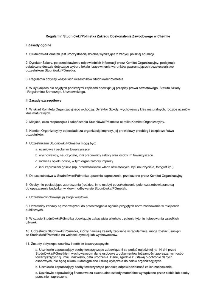 Regulamin Studniówki/Półmetka Zakładu Doskonalenia Zawodowego w Chełmie I. Zasady ogólne 1. Studniówka/Pómetek jest uroczystością szkolną wynikającą z tradycji polskiej edukacji. 2. Dyrektor Szkoły, po przedstawieniu odpowiednich informacji przez Komitet Organizacyjny, podejmuje ostateczne decyzje dotyczące wyboru lokalu i zapewnienia warunków gwarantujących bezpieczeństwo uczestnikom Studniówki/Półmetka. 3. Regulamin dotyczy wszystkich uczestników Studniówki/Półmetka. 4. W sytuacjach nie objętych poniższymi zapisami obowiązują przepisy prawa oświatowego, Statutu Szkoły i Regulaminu Samorządu Uczniowskiego. II. Zasady szczegółowe 1. W skład Komitetu Organizacyjnego wchodzą: Dyrektor Szkoły, wychowawcy klas maturalnych, rodzice uczniów klas maturalnych. 2. Miejsce, czas rozpoczęcia i zakończenia Studniówki/Półmetka określa Komitet Organizacyjny. 3. Komitet Organizacyjny odpowiada za organizację imprezy, jej prawidłowy przebieg i bezpieczeństwo uczestników. 4. Uczestnikami Studniówki/Półmetka mogą być: a. uczniowie i osoby im towarzyszące b. wychowawcy, nauczyciele, inni pracownicy szkoły oraz osoby im towarzyszące c. rodzice i opiekunowie, w tym organizatorzy imprezy d. inni zaproszeni goście (np. przedstawiciele władz oświatowych, byli nauczyciele, fotograf itp.) 5. Do uczestnictwa w Studniówce/Półmetku uprawnia zaproszenie, przekazane przez Komitet Organizacyjny. 6. Osoby nie posiadające zaproszenia (rodzice, inne osoby) po zakończeniu poloneza zobowiązane są do opuszczenia budynku, w którym odbywa się Studniówka/Półmetek. 7. Uczestników obowiązują stroje wizytowe. 8. Uczestnicy zabawy są zobowiązani do przestrzegania ogólnie przyjętych norm zachowania w miejscach publicznych. 9. W czasie Studniówki/Półmetka obowiązuje zakaz picia alkoholu , palenia tytoniu i stosowania wszelkich używek. 10. Uczestnicy Studniówki/Półmetka, którzy naruszą zasady zapisane w regulaminie, mogą zostać usunięci ze Studniówki/Półmetka na wniosek dyrekcji lub wychowawców. 11. Zasady dotyczące uczniów i osób im towarzyszących: a. Uczniowie zapraszający osoby towarzyszące zobowiązani są podać najpóźniej na 14 dni przed Studniówką/Półmetkiem wychowawcom dane osobowe z dokumentów tożsamości zapraszanych osób towarzyszących tj. imię i nazwisko, data urodzenia. Dane, zgodnie z ustawą o ochronie danych osobowych, nie będą nikomu udostępniane i służą wyłącznie do celów organizacyjnych. b. Uczniowie zapraszający osoby towarzyszące ponoszą odpowiedzialność za ich zachowanie. c. Uczniowie odpowiadają finansowo za ewentualne szkody materialne wyrządzone przez siebie lub osoby przez nie zaproszone. d. W trakcie trwania imprezy obowiązuje zakaz opuszczania budynku. Uczeń (lub osoba mu towarzysząca), wychodząc ze Studniówki przed zakończeniem zabawy, zobowiązany jest poinformować o tym swojego wychowawcę lub dyżurujących rodziców w celu wyrejestrowania z listy uczestników. Wyjście traktowane jest jako zakończenie udziału w uroczystości. Powrót do budynku nie jest możliwy z wyjątkiem szczególnych przypadków, w których wymagana jest zgoda wychowawcy. 12. Zasady dotyczące wychowawców i nauczycieli: a. Wychowawcy klas sprawują opiekę nad swoimi uczniami podczas Studniówki/Półmetka. b. Wychowawcy lub dyżurujący rodzice rejestrują wcześniejsze wyjścia uczniów. c. Wychowawcy mają przy sobie spis telefonów, umożliwiający kontakt z poszczególnymi rodzicami. d. W przypadku naruszenia przez ucznia regulaminu wychowawca jest zobowiązany zawiadomić o incydencie rodziców i spowodować, by uczeń zakończył udział w Studniówce/Półmetku. 13. Zasady dotyczące rodziców: a. Rodzice uczniów biorących udział w Studniówce/Półmetku powinni podać wychowawcom numery telefonów, umożliwiające natychmiastowy kontakt z nimi w czasie Studniówki/Półmetka. b. Rodzice zobowiązani są zapewnić swoim dzieciom bezpieczny powrót do domu. c. Rodzice organizują dyżury podczas Studniówki/Półmetka w celu sprawowania opieki nad uczniami. Przyjmuje się zasadę, że każda klasa typuje min. jednego rodzica na jeden dyżur. d. Rodzice dyżurujący podczas Studniówki/Półmetka powinni kontrolować przestrzeganie regulaminu przez uczestników zabawy. W razie stwierdzenia złamania regulaminu przez uczniów i osoby im towarzyszące fakt ten powinni zgłosić wychowawcy albo Dyrektorowi Szkoły. III Postanowienia końcowe 1. Regulamin został zaopiniowany przez Radę Pedagogiczną Dyrektora Szkoły, Radę Rodziców i Samorząd Uczniowski. 2. Regulamin obowiązuje od dnia zatwierdzenia. 3. Wychowawcy klas uczestniczących w Studniówce/Półmetku zobowiązani są do zapoznania uczniów z regulaminem, a uczniowie do potwierdzenia własnoręcznym podpisem przyjęcia go do wiadomości i zapoznania z nim osób towarzyszących. 4. Regulamin dostępny jest w sekretariacie , na stronie www szkoły oraz u organizatorów.
