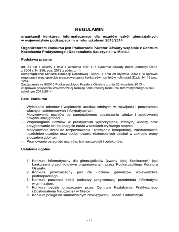 REGULAMIN organizacji konkursu informatycznego dla uczniów szkół gimnazjalnych w województwie podkarpackim w roku szkolnym 2013/2014 Organizatorem konkursu jest Podkarpacki Kurator Oświaty wspólnie z Centrum Kształcenia Praktycznego i Doskonalenia Nauczycieli w Mielcu. Podstawa prawna art. 31 pkt 7 ustawy z dnia 7 września 1991 r. o systemie oświaty (tekst jednolity: Dz.U. z 2004 r. Nr 256, poz. 2572 z późn. zm.), rozporządzenie Ministra Edukacji Narodowej i Sportu z dnia 29 stycznia 2002 r. w sprawie organizacji oraz sposobu przeprowadzania konkursów, turniejów i olimpiad (Dz.U. Nr 13 poz. 125), Zarządzenie nr 9/2013 Podkarpackiego Kuratora Oświaty z dnia 26 września 2013 r. w sprawie powołania Wojewódzkiej Komisji Konkursowej Konkursu Informatycznego w roku szkolnym 2013/2014. Cele konkursu Wyłanianie talentów i wspieranie uczniów zdolnych w rozwijaniu i poszerzaniu własnych zainteresowań informatycznych. Motywowanie uczniów do samodzielnego poszerzania wiedzy i zdobywania nowych umiejętności. Wspomaganie uczniów w praktycznym wykorzystaniu zdobytej wiedzy oraz przygotowanie ich do podjęcia nauki w szkołach wyższego stopnia. Motywowanie szkół do rozpoznawania i rozwijania kompetencji, zainteresowań i uzdolnień uczniów oraz podejmowania różnorodnych działań w zakresie pracy z uczniem zdolnym. Promowanie osiągnięć uczniów, ich nauczycieli i opiekunów. Ustalenia ogólne 1. Konkurs Informatyczny dla gimnazjalistów (zwany dalej Konkursem) jest konkursem przedmiotowym organizowanym przez Podkarpackiego Kuratora Oświaty. 2. Konkurs przeznaczony jest dla uczniów gimnazjów województwa podkarpackiego. 3. Konkurs poszerza treści podstawy programowej przedmiotu Informatyka w gimnazjum. 4. Konkurs będzie prowadzony przez Centrum Kształcenia Praktycznego i Doskonalenia Nauczycieli w Mielcu 5. Konkurs polega na samodzielnym rozwiązywaniu zadań z informatyki. -1- Organizacja Konkursu 1. Konkurs przeprowadza Wojewódzka Komisja Konkursowa Konkursu Informatycznego WKKKI (zwana dalej Komisją Konkursową) powołana przez Podkarpackiego Kuratora Oświaty. 2. Zakres wiedzy i umiejętności wymaganych w poszczególnych stopniach Konkursu oraz wykaz literatury dla uczestników zawarty jest w załączniku nr 2 do niniejszego Regulaminu. Przebieg Konkursu Konkurs jest trzyetapowy: I etap - szkolny, II etap - rejonowy, III etap - wojewódzki (finał). Harmonogram Konkursu zawarty jest w załączniku nr 1 do niniejszego Regulaminu. I etap – szkolny Za organizację i przeprowadzenie etapu szkolnego odpowiada dyrektor szkoły. Zadaniem dyrektora w zakresie organizacji etapu szkolnego będzie: zgłoszenie szkoły z liczbą uczestników, powołanie szkolnej komisji konkursowej, pobranie zadań i odpowiedzi I etapu ze strony Kuratorium (za pomocą ISOK) 1, zapewnienie prawidłowego przebiegu konkursu, przekazanie wyników, zapewnienie rzetelnego rozpatrzenia odwołań uczniów. Do II stopnia zostaną zakwalifikowani uczestnicy, którzy uzyskali najwyższe wyniki, ale nie więcej niż 200 uczniów. II etap - rejonowy on-line polega na samodzielnym rozwiązywaniu zadań konkursowych na platformie e-learningowej. Eliminacje odbędą się szkolnych pracowniach zakwalifikowanych uczniów i będą trwały 60 minut. Za sprawny przebieg II etapu Konkursu odpowiadają Szkolne Komisje Konkursowe powołane w tym celu przez Dyrektora szkoły. Uczestnicy II etapu wspólnie z nauczycielami- opiekunami, w terminie wskazanym w harmonogramie konkursu założą (lub przetestują) konta na platformie. Dwa tygodnie przed właściwym terminem konkursu zostanie przeprowadzona próba kont. Instrukcje na temat korzystania z kont oraz platformy e-learningowej zostaną umieszczone na stronach Kuratorium Oświaty http://www.ko.rzeszow.pl (w dziale: Konkursy przedmiotowe), na stronie głównej CKPiDN http://www.ckp.edu.pl/ oraz na stronie www Konkursu http://www.ckp.edu.pl/konkurs 1 Organizacja I etapu Konkursu przebiega identycznie jak organizacja innych konkursów przedmiotowych organizowanych przez Kuratorium Oświaty w Rzeszowie i omawia to § 4 Regulaminu organizacji konkursów przedmiotowych dla uczniów szkół podstawowych i gimnazjów w województwie podkarpackim w roku szkolnym 2013/2014 w dziale stopień – etap szkolny. -2- Login i hasło będzie stałym kluczem dostępu do platformy. Nieuprawnione wykorzystanie loginu i hasła przez osoby postronne nie podlega reklamacji. Zespół Zadaniowy powołany przez Komisję Konkursową oceni rozwiązania i przedstawi Komisji Konkursowej wyniki punktowe uczestników w postaci uporządkowanej listy wyników. Liczbę uczestników kwalifikowanych do zawodów III etapu (finału) ustala Komisja Konkursowa. Do III stopnia zostaną zakwalifikowani uczestnicy, którzy uzyskali najwyższe wyniki, ale nie więcej niż 60 uczniów. III etap - wojewódzki (finał) polega na samodzielnym rozwiązywaniu zadań w pracowni komputerowej Zawody odbędą się pracowniach komputerowych Centrum Kształcenia Praktycznego i Doskonalenia Nauczycieli w Mielcu i będą trwały 90 minut. Zespół Zadaniowy sprawdzi rozwiązania zawodników i przedstawi opracowane wyniki Komisji Konkursowej, która na tej podstawie wyłoni laureatów Konkursu. Wszystkie dane finalistów pozostaną zakodowane, aż do momentu sprawdzenia i oceny prac. Tytuł laureata konkursu organizowanego dla uczniów gimnazjów otrzymują uczestnicy etapu wojewódzkiego, którzy uzyskali najwyższe wyniki. Liczba laureatów nie może być większa niż 30. Liczba laureatów może być zwiększona, jeśli uczestnik etapu wojewódzkiego z pozycji 31 i następnych uzyskali taką samą liczbę punktów jak uczeń z pozycji 30. Decyzję o poszerzeniu listy laureatów podejmuje Przewodniczący Komisji Konkursowej. Tytuł finalisty konkursu, otrzymuje uczeń, który w eliminacjach wojewódzkich zdobył co najmniej 65% punktów możliwych do uzyskania i nie uzyskał tytułu laureata. Odwołania Od wyni