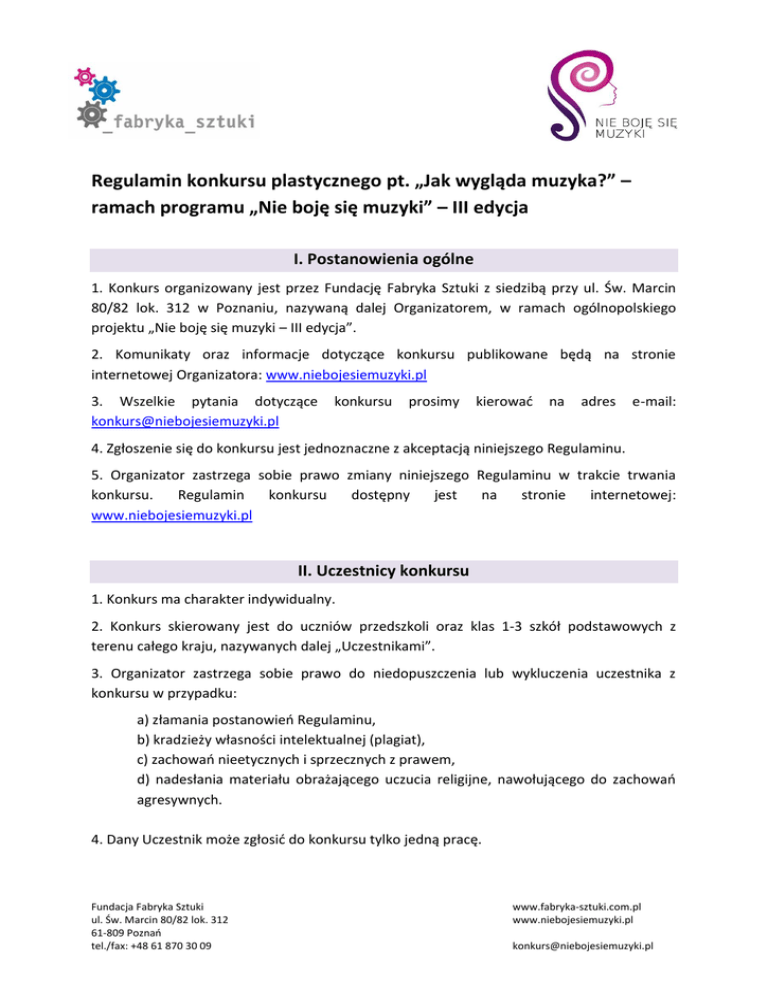 Regulamin konkursu plastycznego pt. „Jak wygląda muzyka?” – ramach programu „Nie boję się muzyki” – III edycja I. Postanowienia ogólne 1. Konkurs organizowany jest przez Fundację Fabryka Sztuki z siedzibą przy ul. Św. Marcin 80/82 lok. 312 w Poznaniu, nazywaną dalej Organizatorem, w ramach ogólnopolskiego projektu „Nie boję się muzyki – III edycja”. 2. Komunikaty oraz informacje dotyczące konkursu publikowane będą na stronie internetowej Organizatora: www.niebojesiemuzyki.pl 3. Wszelkie pytania dotyczące [email protected] konkursu prosimy kierować na adres e-mail: 4. Zgłoszenie się do konkursu jest jednoznaczne z akceptacją niniejszego Regulaminu. 5. Organizator zastrzega sobie prawo zmiany niniejszego Regulaminu w trakcie trwania konkursu. Regulamin konkursu dostępny jest na stronie internetowej: www.niebojesiemuzyki.pl II. Uczestnicy konkursu 1. Konkurs ma charakter indywidualny. 2. Konkurs skierowany jest do uczniów przedszkoli oraz klas 1-3 szkół podstawowych z terenu całego kraju, nazywanych dalej „Uczestnikami”. 3. Organizator zastrzega sobie prawo do niedopuszczenia lub wykluczenia uczestnika z konkursu w przypadku: a) złamania postanowień Regulaminu, b) kradzieży własności intelektualnej (plagiat), c) zachowań nieetycznych i sprzecznych z prawem, d) nadesłania materiału obrażającego uczucia religijne, nawołującego do zachowań agresywnych. 4. Dany Uczestnik może zgłosić do konkursu tylko jedną pracę. Fundacja Fabryka Sztuki ul. Św. Marcin 80/82 lok. 312 61-809 Poznań tel./fax: +48 61 870 30 09 www.fabryka-sztuki.com.pl www.niebojesiemuzyki.pl [email protected] , III. Zadanie konkursowe 1. Zadaniem Uczestnika konkursu jest stworzenie pracy plastycznej stanowiącej odpowiedź na pytanie „Jak wygląda muzyka?”. 2. Przez „pracę plastyczną” rozumie się pracę wykonaną przez Uczestnika na kartce papieru formatu minimum A4, maksimum A3, przy użyciu jednej lub kilku spośród następujących technik: kredki, pastele, flamastry, farby plakatowe, farby akwarelowe, wydzieranka, wyklejanka, kolaż. Do wyklejanki, wydzieranki oraz kolażu można użyć dowolnych materiałów. 3. Pracę plastyczną należy na odwrocie opatrzyć następującymi informacjami: Imię i nazwisko Uczestnika Wiek, klasa Nazwa szkoły oraz jej adres Imię i nazwisko Opiekuna (osoba pełnoletnia) Kontakt do Opiekuna: telefon oraz e-mail 4. Prace nadesłane na Konkurs muszą być pracami własnymi Uczestnika, dotychczas niepublikowanymi. IV. Czas trwania konkursu oraz warunki nadsyłania prac 1. Konkurs rozpoczyna się 1 kwietnia 2015 roku, a termin nadsyłania prac upływa w nieprzekraczalnym terminie 16 czerwca 2015 roku. 2. Prace należy przesyłać pocztą tradycyjną, na adres: Fundacja Fabryka Sztuki ul. Św. Marcin 80/82 lok. 312 61-809 Poznań z dopiskiem „konkurs plastyczny” 3. Prosimy o przysyłanie prac również w wersji elektronicznej (fotografia lub scan) na adres [email protected]. Prace prosimy zapisać pod nazwą imie_nazwisko_niebojesiemuzyki.jpg. Fundacja Fabryka Sztuki ul. Św. Marcin 80/82 lok. 312 61-809 Poznań tel./fax: +48 61 870 30 09 www.fabryka-sztuki.com.pl www.niebojesiemuzyki.pl [email protected] 4. Za termin dostarczenia uznaje się datę wpływu przesyłki (pocztą tradycyjną) do siedziby Fundacji Fabryka Sztuki. Prace wysłane „za pobraniem” nie podlegają przyjęciu. 5. Materiał konkursowy przesłany po wyznaczonym terminie nie będzie brany pod uwagę jako zgłoszenie do konkursu, a tym samym nie zostanie poddany ocenie. 6. Prace zgłoszone do Konkursu nie będą zwracane autorom. V. Publikacja, ocena prac i nagrody 1. Wszystkie nadesłane prace zostaną zamieszczone w internetowej galerii na stronie www.niebojesiemuzyki.pl 2. Wszystkie nadesłane prace podlegają ocenie jury. Jury wybierze 30 najlepszych prac, przyznając ich autorom nagrody oraz wyróżnienia. Nagrody przewiduje się dla laureatów miejsc I – III w dwóch kategoriach (przedszkola i szkoły podstawowe). Wszystkie 30 prac trafi na specjalną wystawę pokonkursową. Skład jury zostanie ogłoszony w maju w formie komunikatu na stronie internetowej www.niebojesiemuzyki.pl Ocena prac dokonywana przez jury nastąpi do dnia 19 czerwca 2015. Decyzja jury ma charakter ostateczny. 3. Po zakończeniu obrad jury i wyłonieniu 30 najlepszych prac, pojawi się możliwość głosowania na pozostałe prace konkursowe. Praca, która zdobędzie największą liczbę głosów otrzyma nagrodę publiczności i trafi na wystawę. 4. Głosowanie odbędzie się na stronie www.niebojesiemuzyki.pl (http://www.niebojesiemuzyki.pl) w dniach 22-25 czerwca. Głosowanie odbywa się poprzez dodanie przez użytkownika znacznika „LUBIĘ” przy wybranej pracy. Głosować można na dowolną ilość prac, przy czym na każdą pracę – można oddać tylko jeden głos. 5. Nagrody w konkursie będzie można odebrać osobiście w siedzibie Organizatora lub otrzymać drogą pocztową. VI. Postanowienia końcowe 1. Udział w Konkursie jest jednoznaczny z nieodpłatnym, nieograniczonym terytorialnie udzieleniem Organizatorowi praw autorskich na wykorzystanie nadesłanych prac w celach promocyjnych projektu „Nie boję się muzyki”, jak również we wszystkich czynnościach związanych z jego realizacją. 2. Biorąc udział w konkursie Uczestnik wyraża zgodę na przetwarzanie przez Organizatora jego danych osobowych. Fundacja Fabryka Sztuki ul. Św. Marcin 80/82 lok. 312 61-809 Poznań tel./fax: +48 61 870 30 09 www.fabryka-sztuki.com.pl www.niebojesiemuzyki.pl [email protected] 3. Dane osobowe Uczestników konkursu będą wykorzystywane wyłącznie do celów związanych z projektem, przy zachowaniu zasad określonych w ustawie o ochronie danych osobowych (Dz. U. z 1997 nr 133 poz. 883). Fundacja Fabryka Sztuki ul. Św. Marcin 80/82 lok. 312 61-809 Poznań tel./fax: +48 61 870 30 09 www.fabryka-sztuki.com.pl www.niebojesiemuzyki.pl [email protected]