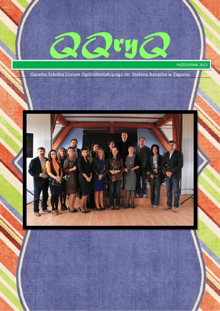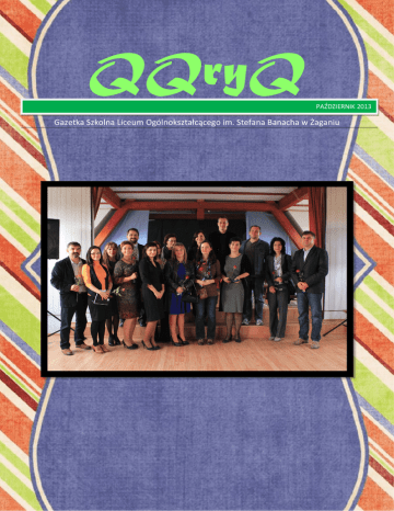 QQryQ PAŹDZIERNIK 2013 Gazetka Szkolna Liceum Ogólnokształcącego im. Stefana Banacha w Żaganiu Dzień Nauczyciela na wesoło W związku z rocznicą powołania Komisji Edukacji Narodowej, obchodzoną jako Dzień Nauczyciela, w piątek (11.10.) mogliśmy obejrzeć program artystyczny, przygotowany przez uczniów naszej szkoły. Na pochwałę zasługuje twórczość uczniów klas pierwszych, którzy przygotowali skecz przedstawiający lekcję w krzywym zwierciadle. Trzeba podkreślić też wartość artystyczną utworów wykonywanych przez „banachowskich muzyków”, którzy prezentują bardzo wysoki poziom. Nie sposób też nie wspomnieć o kabareciarzach z klasy IIId – o Mateuszu Zielińskim i Miłoszu Plocie, którzy sparodiowali znany wszystkim program kulinarny. Nie obyło się też bez tradycyjnych życzeń kierowanych pod adresem nauczycieli i pracowników szkoły. Myślę, że ten dzień był dobrą okazją do podziękowania naszym wychowawcom i nauczycielom za ich pracę oraz złożenia im najserdeczniejszych życzeń. Ola Dzień Języków Obcych, czyli jak się uczyć poprzez zabawę 26 września obchodziliśmy w naszej szkole Dzień Języków Obcych. Było to na pewno ciekawe i zabawne, ale również wymagające od uczniów pewnej wiedzy i przeżycia. Z każdej klasy wytypowano grupę uczniów, którzy musieli się zmierzyć z zadaniami przygotowanymi przez nauczycieli języków obcych. Na 6. lekcji zostali oni zwolnieni z zajęć i wzięli udział w konkursie, który polegał na porozumieniu się w miejscach publicznych w danym języku (angielski lub niemiecki). Oczywiście uczniowie nie chodzili „po mieście”, a „po klasach”, zaś osobami, z którymi musieli się dogadać, byli sami nauczyciele. W ten sposób odwiedzili szpital, policję, kwiaciarnię, sklepik z pamiątkami i wiele, wiele innych miejsc. Zabawa była świetna, a dodatkowo uczyła, jak postępować w normalnych sytuacjach, gdy jesteśmy za granicą. Na wcześniejszych lekcjach odbył się konkurs wiedzy o krajach niemieckiego obszaru językowego i anglojęzycznych. Kilka dni później wyłoniono zwycięzców obydwu zadań, a w ramach nagrody zostały im przydzielone tak zwane punkty „na górkę.” Na koniec chciałam wszystkim uczestnikom pogratulować i życzyć im dalszych sukcesów w nauce języków obcych. Oliwia Znajdź nas na facebooku: facebook.com/QQryQLO Trudno opisać te trzy lata. Już niedługo opuści mury naszej szkoły. Każdy „Banachowicz” wie, kim Ona jest i czym się zajmuje. Przewodnicząca Izby Kamratów i redaktor techniczna gazetki QQryQ - Marta Kałużna - odpowie na nasze pytania. Magda: Robisz bardzo dużo rzeczy dla szkoły, uczniów. Można zobaczyć twoje działania na każdym apelu, w radiowęźle. Jesteś przewodniczącą Izby Kamratów. To bardzo odpowiedzialne stanowisko, jak czujesz się w tej roli, czy zawsze jest łatwo i przyjemnie? Marta: Moja rola w Izbie wyróżnia się tym, że jako przewodnicząca pełnię funkcję reprezentacyjną i przemawiam na apelach. Jest to w jakiś sposób odpowiedzialna funkcja, ale dzięki temu, że mogę liczyć na wsparcie i pomoc innych członków Izby oraz naszej opiekunki Pani Agnieszki Dembowiak, nie jest to rola szczególnie trudna. Izba Kamratów to dla mnie przede wszystkim współpraca z bardzo wartościowymi ludźmi. Wszyscy jesteśmy równi i zdanie każdego z nas jest tak samo ważne. Wiadomo, że to ja jestem tą „szefową”, jak mawiają w żartach, ale nigdy nie czułam wyższości wobec innych członków Izby. Magda: Masz też ważne zadanie w gazetce szkolnej, może powiesz, co dokładnie należy do twoich obowiązków? Marta: Jestem redaktorką techniczną, czyli nadaję ostateczny kształt gazetce. Nie jest to tylko zwykłe „kopiuj i wklej”, ale moim zadaniem jest staranne dobranie czcionki, kolorów i obrazków do artykułu. Kiedy dziennikarze dostarczą swoje teksty Oli Zakrzewskiej, czyli redaktor naczelnej, trafiają one do mnie. Ja „składam” gazetkę i wędruje ona do Pani Anny Świebody, która poprawia błędy w artykułach. Następnie wnoszę ostateczne poprawki i wysyłam do nauczyciela, który publikuje gazetkę na stronie. Magda: W tym roku matura, egzamin dojrzałości. Przygotowujesz się już do tego, czy na razie zbierasz siły na naukę? Marta: Nie mam już czasu na relaks. „Hura, hura.. dzisiaj matura!” Już uświadomiłam sobie, że ten rok jest prawdopodobnie najważniejszym w moim dotychczasowym życiu. Każdy krok ma wpływ na wyniki matury, dlatego staram się, aby ten ostatni etap był owocny i dał efekt w postaci pięknie zdanej matury. Magda: Stresuje cię myśl, że już niedługo cię to czeka? Marta: Wbrew pozorom zostało nam już mało czasu, więc czeka nas walka z własnymi słabościami, aby jak najlepiej poradzić sobie na maturze. Jest październik, więc jeszcze nie odczuwam mocnego stresu, ale podejrzewam, że po feriach zimowych odczuję go bardzo dotkliwie. Magda: Jak czujesz się będąc już w klasie maturalnej? Czujesz dużą różnicę między tym, co jest teraz, a momentem, kiedy byłaś na samym początku licealnej drogi? Marta: Kolosalną! W pierwszej klasie byłam trochę zagubioną owieczką, bo chyba tak siebie określę. Na szczęście miałam wsparcie w postaci mojej przyjaciółki, która wtedy była już w klasie maturalnej. Wprowadziła mnie w świat Banacha. Można powiedzieć, że przekazała mi nawet kilka "sposobów na Alcybiadesa". A tak na poważnie, to przez ten czas dużo się zmieniło. Zaangażowałam się w życie szkoły, co daje mi ogromną satysfakcję. Poznałam wielu wspaniałych ludzi, dzięki którym czuję się w szkole bardzo dobrze. Idąc do pierwszej klasy obawiałam się tego, jak przyjmą nas starsi koledzy, ale uczniowie naszej szkoły to bardzo otwarci ludzie i dzięki temu łatwiej było się przestawić na tryb „licealista". W drugiej klasie doszły fakultety, więc w głowie zaświeciła myśl "Matko, n