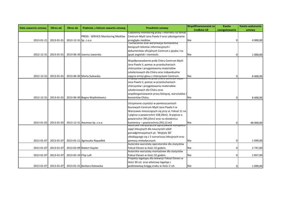 Centralny Rejestr Umów 2013 Rok - BIP Centrum Myśli Jana Pawła II