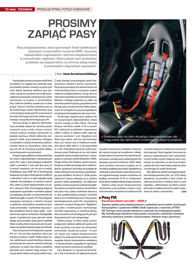 TECHNIKA PRZEGLĄD RYNKU: FOTELE KUBEŁKOWE PROSIMY ZAPIĄĆ PASY fot. AF 72 Pasy bezpieczeństwa, obok sportowych foteli kubełkowych opisanych w poprzednim numerze WRC, stanowią najważniejsze wyposażenie z zakresu bezpieczeństwa w samochodzie rajdowym. Dobra jakość tych produktów przekłada się bezpośrednio na ochronę załogi nawet w potencjalnie niegroźnych sytuacjach. Tekst: Damian Borowik/www.RallyShop.pl Pasy bezpieczeństwa to już ponad 60-letni wynalazek. Ich wygląd oraz materiały użyte do produkcji bardzo zmieniły się przez tych sześć dekad. Sportowe szelkowe pasy znacząco różnią się w budowie od modeli przeciąganych przez jedno ramię kierowcy, które montowane są seryjnie w samochodach. Pasy szelkowe dzielimy zasadniczo na dwie grupy, których budowa predestynuje je do konkretnego użytku. Rozróżniamy pasy o homologacji drogowej ECE przeznaczone do ruchu ulicznego oraz te do użytku wyczynowego z naszywką homologacyjną FIA. Pierwsza grupa to głównie aftermarketowe produkty służące do wymiany pasów seryjnych przez osoby chcące zmienić wystrój wnętrza swojego samochodu na bardziej sportowy. Wśród odbiorców drogowych szelek są też zawodnicy startujący w zawodach o randze amatorskiej i półamatorskiej, którzy za stosunkowo niską cenę (już od 250 zł) otrzymują produkt będący namiastką pasów wyczynowych. Drogowe pasy szelkowe, w przeciwieństwie do swoich odpowiedników zatwierdzonych przez FIA, mają w przeważającej większości szelki o szerokości 2 cali (czyli tyle samo, ile w pasach seryjnych), ale nie jest to regułą. Przykładowo pasy OMP 4M (z homologacją drogową) trzymają w fotelu górnymi szelkami o szerokości 3 cali, co w razie wypadku lepiej rozkłada siły działające na ramiona zawodnika, zatem są dużo bezpieczniejsze od szelek 2-calowych. Pasy z homologacją drogową wyposażone są ponadto w centralne zapięcie na tradycyjny zatrzask w przeciwieństwie do obrotowej gałki w pasach FIA. Pasy drogowe występują najczęściej w dwóch wersjach w zależności od punktów mocowań do podwozia samochodu – wyróżniamy więc pasy 3lub 4-punktowe. Pasy te mają 4 szelki – 2 biodrowe oraz 2 górne, ramieniowe. W przypadku pasów 3-punktowych para górnych szelek zbiega się po przejściu przez górne przelotki fotela w jedną, która mocowana jest do podwozia na wysokości tylnej kanapy samochodu. Pasy wyczynowe homologowane są przez FIA na 5 lat od daty produkcji, która jest naszyta na jednej z szelek. Maksymalny termin użytkowania został określony sztywno, ponieważ po tym okresie materiał, z którego wykonane są szelki oraz klamry, podobnie jak każdy inny materiał, ulega zużyciu i nie ma już takich właściwości jak produkt nowy. Z tego powodu przestrzegamy przed okazjonalnym zakupem pasów używanych. Pierwszym powodem jest właśnie termin od chwili produkcji, który w znacznym stopniu wpływa na bezpieczeństwo. Druga rzecz to natomiast niewiedza na temat historii pasów. Materiał, z którego wykonane są szelki, ma określony punkt krytyczny, po przekroczeniu którego pasy nie powinny być dalej użytkowane. W szczególności pasy powypadkowe nie będą już tak bezpieczne jak pasy nowe. Porównując drogowe pasy szelkowe do ich wyczynowych odpowiedników, należy zwrócić uwagę na kilka różnic. Pierwszą dotyczy szerokości szelek. O ile w pasach ECE większość produktów wyposażono szelki 2-calowe, to rajdowe szelki mają najczęściej szerokość 3 cali. Wyjątkiem jest dolna para szelek, czyli tzw. pas kroczowy, które są 2-calowe oraz w niektórych modelach górne szelki, które z 3 cali przechodzą w 2 cale. Przewężenie górnych szelek aprobowane przez Federację ma na celu lepsze zespolenie pasów bezpieczeństwa z wymaganym w wyższych seriach kołnierzem HANS. Drugą różnicą jest budowa samych pasów. Drogowe modele posiadają dwie szelki biodrowe, od których odchodzą równolegle do siebie szelki górne (ramieniowe), upodobniając pasy kształtem do litery H. Szelki pasów rajdowych zawsze zbiegają się w jednym punkcie (układ gwiaździsty) i są odłączane jednym ruchem za pomocą obrotowej gałki. Pozwala to na natychmiastowe samodzielne lub przez inną osobę uwolnienie kierowcy w razie „podbramkowej sytuacji”. Centralna klamra jest charakterystyczną cechą pasów homologowanych przez FIA, niespotykaną właściwie w pasach drogowych. Wyjątkiem jest jeden z modeli pasów niemieckiego Schrotha wyposażony w centralną klamrę, który ma zarówno homologację FIA, jak i jest dopuszczony do ruchu drogowego. Kolejną rzeczą, na którą należy zwrócić uwagę przy wyborze rajdowych pasów, jest liczba punktów mocowań do elementów samochodu. Zasada jest prosta – im jest ich więcej, tym większe bezpieczeństwo załogi. Przy większej licznie punktów w razie wypadku siła jest równomiernie rozkładana i w ekstremalnych przypadkach zapobiega nawet wyrwaniu mocowania z podłogi. Pasy drogowe to najczęściej konstrukcje 3- lub 4-punktowe. W rajdowych pasach Szelkowe pasy nie tylko decydują o bezpieczeństwie, ale mogą także być elementem zmieniającym wystrój wnętrza. 4 punkty mocowań to niezbędne minimum, ale częściej stosuje się 6-punktowe z dodatkowym pasem kroczowym lub nawet 8-punktowe pasy o drugiej parze szelek górnych do lepszego trzymania kołnierza HANS. Większość punktów mocowań znajduje się na wysokości podłogi samochodu. Wyjątkiem są szelki górne, które bardzo często dla zachowania regulaminowego stopnia nachylenia do podłogi samochodu (0–45 st.) montowane są do tylnych pałąków klatki bezpieczeństwa. Kolejne szelki pasów bezpieczeństwa montowane są do podłogi w miejsce seryjnych otworów montażowych (zalecane) lub Pasy FIA w innych miejscach w zależności od inwencji montującego. Pasy mogą być mocowane za pomocą standardowych śrub, czyli podobnie jak modele seryjne. Rajdowe pasy montowane są