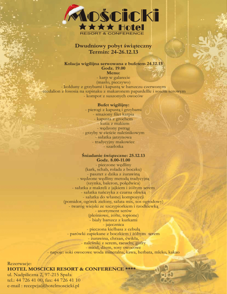 RESORT & CONFERENCE Dwudniowy pobyt świąteczny Termin: 24-26.12.13 Kolacja wigilijna serwowana z bufetem 24.12.13 Godz. 19.00 Menu: - karp w galarecie (masło, pieczywo) - kołduny z grzybami i kapustą w barszczu czerwonym -medalion z łososia na szpinaku z makaronem papardellle i sosem serowym - kompot z suszonych owoców Bufet wigilijny: - pierogi z kapustą i grzybami - smażony filet karpia - kapusta z grochem - kutia z makiem - wędzony pstrąg - grzyby w cieście naleśnikowym - sałatka jarzynowa - tradycyjny makowiec - szarlotka Śniadanie świąteczne: 25.12.13 Godz. 8.00-11.00 - pieczone wędliny (kark, schab, rolada z boczku) - pasztet z dzika z żurawiną - wędzone wędliny metodą tradycyjną (szynka, baleron, polędwica) - sałatka z makreli z jajkiem i żółtym serem - sałatka tuńczyka z czarna oliwką - sałatka do własnej kompozycji (pomidor, ogórek zielony, sałata mix, sos ogrodowy) - twaróg wiejski ze szczypiorkiem i rzodkiewką - asortyment serów (pleśniowe, żółte, topione) - biały barszcz z kurkami - jajecznica - pieczona kiełbasa z cebulą - parówki zapiekane z boczkiem i żółtym serem - żurawina, chrzan, ćwikła, - naleśniki z serem, racuchy, gofry - miód, dżem, sosy owocowe - napoje: soki owocowe woda mineralna, kawa, herbata, mleko, kakao Rezerwacje: HOTEL MOSCICKI RESORT & CONFERENCE **** ul. Nadpiliczna 2, 97-215 Spała tel.: 44 726 41 00, fax: 44 726 41 10 e-mail : [email protected] RESORT & CONFERENCE Podwieczorek przy samowarze: 25.12.13 Godz. 15-16.00 - ciasto serowo-makowe - czekoladowa babka piaskowa - keks z bakaliami - owoce Obiadokolacja: 25.12.13 Godz.17.00-19.00 - rosół z bażanta z kołdunami mięsnymi - zrazy wolowy w sosie jałowcowym - nugetsy drobiowe w złotej panierce - medalion z łososia na szpinaku z sosem serowym - kluski śląskie - pieczone ćwiartki ziemniaków z papryką i ziołami prowansalskimi - fasola szparagowa - sałatka a'la mimoz (sałata, siekane jajko, grzanki, ziarno słonecznika, sos ogrodowy) - sałatka szwedzka - sernik carski z sosem malinowym - kawa, herbata, woda mineralna Śniadanie bufetowe: 26.12.13 Godz. 7.00-11.00 - parówki zapiekane z serem i boczkiem - parówki cielęce - pieczona kiełbasa z cebulą - naleśniki z serem - jajecznica Dania zimne: - sałatka do własnej kompozycji (sałata, pomidor, ogórek, cebula) - wędliny wędzone metoda tradycyjne (szynka, polędwica, baleron) - pasztet domowy - jajka na twardo z sosem majonezowo -chrzanowym - twarożek wiejski - asortyment serów żółtych i topionych - napoje: soki owocowe, woda mineralna kawa, herbata, mleko, kakao Rezerwacje: HOTEL MOSCICKI RESORT & CONFERENCE **** ul. Nadpiliczna 2, 97-215 Spała tel.: 44 726 41 00, fax: 44 726 41 10 e-mail : [email protected]