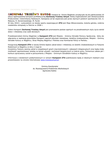 ZACHOWAJ TRZEŹWY UMYSŁ 1 kwietna br. Gmina Węgliniec przyłączyła się do jubileuszowej 10 edycji ogólnopolskiej kampanii profilaktycznej Zachowaj Trzeźwy Umysł, której organizatorem jest Stowarzyszenie Producentów i Dziennikarzy Radiowych. Kampania od lat wspierana jest przez słynnych polskich sportowców min. A. Małysza, R. Korzeniowskiego, M. Pyrek. W roku 2010 r. autorytetem ze świata sportu wspierającym ZTU jest Maja Włoszczowska, kolarka górska, srebrna medalistka olimpiady w Pekinie w 2008 r. Celem Kampanii Zachowaj Trzeźwy Umysł jest promowanie postaw opartych na prozdrowotnym stylu życia wśród dzieci i młodzieży oraz osób dorosłych. Przedstawicielem Gminy Węgliniec w Kampanii ZTU jest Miejsko – Gminny Ośrodek Pomocy Społecznej, który do włączenia w realizację postulatów Kampanii zaprosił placówki oświatowe, świetlice środowiskowe, Miejsko – Gminny Ośrodek Kultury w Węglińcu, Straż Miejską Węglińca i Pieńska oraz Komisariat Policji w Pieńsku. Inauguracją Kampanii ZTU w naszej Gminie będzie udział dzieci i młodzieży ze świetlic środowiskowych w Festynie Rodzinnym w Węglińcu w dniu 2 maja br. Uczestnicy Festynu wezmą udział w zespołowych grach zręcznościowych i zabawach integracyjnych oraz będą miały możliwość zaprezentować wiedzę na temat używek i zachowań bezpiecznych w trakcie quizu. Scenariusz zabaw jak i konkurs opracowany został w porozumieniu z Miejsko – Gminnym Ośrodkiem Kultury w Węglińcu. Informacje o działaniach podejmowanych w ramach Kampanii ZTU publikowane będą w lokalnych mediach oraz prezentowane na stronie internetowej www.trzezwyumysl.pl. Gminny Koordynator ds. Rozwiązywania Problemów Alkoholowych Agnieszka Kaleta