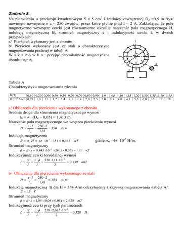 Zadanie 8. Na pierścieniu o przekroju kwadratowym 5 x 5 cm2 i średnicy zewnętrznej Dz =0,5 m /rys/ nawinięto uzwojenie o z = 250 zwojów, przez które płynie prąd I = 2 A. Zakładając, że pole magnetyczne wewnątrz cewki jest równomierne określić natężenie pola magnetycznego H, indukcję magnetyczną B, strumień magnetyczny ¢ i indukcyjność cewki L w dwóch przypadkach: a/ Pierścień wykonany jest z ebonitu, b/ Pierścień wykonany jest ze stali o charakterystyce magnesowania podanej w tabeli A. W s k a z ó w k a : przyjąć przenikalność magnetyczną ebonitu µe=µ0 Tabela A Charakterystyka magnesowania rdzenia B [T] H [⋅102 A/m] 0,10 0,20 0,30 0,40 0,50 0,60 0,70 0,80 0,90 1,0 1,05 1,10 1,15 1,20 1,30 1,35 1,40 1,45 0,75 1,0 1,1 1,2 1,4 1,5 1,8 2,0 2,5 3,0 3,5 4,0 4,5 5,5 6,0 10 12 18 a/ Obliczenia dla pierścienia wykonanego z ebonitu. Średnia droga dla strumienia magnetycznego wynosi lśr = π ⋅ (DZ – 0,05) = 1,413 m. Natężenie pola magnetycznego we wnętrzu pierścienia wynosi H = z ⋅ I 250 ⋅ 2 = = 354 l sr 1,41 A/ m Indukcja magnetyczna B = µ ⋅ H = 4π ⋅ 10 −7 ⋅ 354 = 0,445 mT gdzie: µ0 =4π⋅ 10-7 H/m. Strumień magnetyczny φ = B ⋅ s = 0,445 ⋅ 10 −3 ⋅ (0,05 × 0,05) = 1,11 µT Indukcyjność cewki toroidalnej wynosi L= Ψ z ⋅ φ 250 ⋅ 1,11 ⋅ 10 −6 = = = 0.139 mH I I 2 b/ Obliczenia dla pierścienia wykonanego ze stali H = z ⋅ I 250 ⋅ 2 = = 354 l sr 1,41 A/ m Indukcję magnetyczną B dla H = 354 A/m odczytujemy z krzywej magnesowania /tabela A/. B = 1,5 T Strumień magnetyczny φ = B ⋅ s = 1,05 ⋅ (0,05 × 0,05) = 2,625 mT Indukcyjność cewki przy tych parametrach L= Ψ z ⋅ φ 250 ⋅ 2,625 ⋅ 10 −3 = = = 0.328 H I I 2