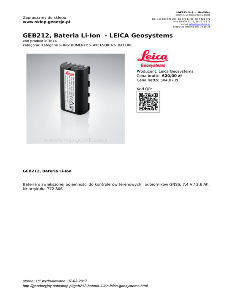 I-NET.PL Sp.J. o. GeoSklep Olsztyn, ul. Cementowa 3/301 Zapraszamy do sklepu www.sklep.geoezja.pl tel. +48 609 571 271, 89 670 11 00, 58 7 421 571 faks 89 670 11 11, 58 7421 871 e-mail [email protected] bezpłatna infolinia 800 70 30 31 GEB212, Bateria Li-Ion - LEICA Geosystems kod produktu: 3644 kategoria: Kategorie > INSTRUMENTY > AKCESORIA > BATERIE Producent: Leica Geosystems Cena brutto: 620,00 zł Cena netto: 504,07 zł Kod QR: GEB212, Bateria Li-Ion Bateria o zwiększonej pojemności do kontrolerów terenowych i odbiorników GNSS, 7.4 V / 2.6 Ah. Nr artykułu: 772 806 strona: 1/1 wydrukowano: 07-03-2017 http://geodezyjny.soteshop.pl/geb212-bateria-li-ion-leica-geosystems.html