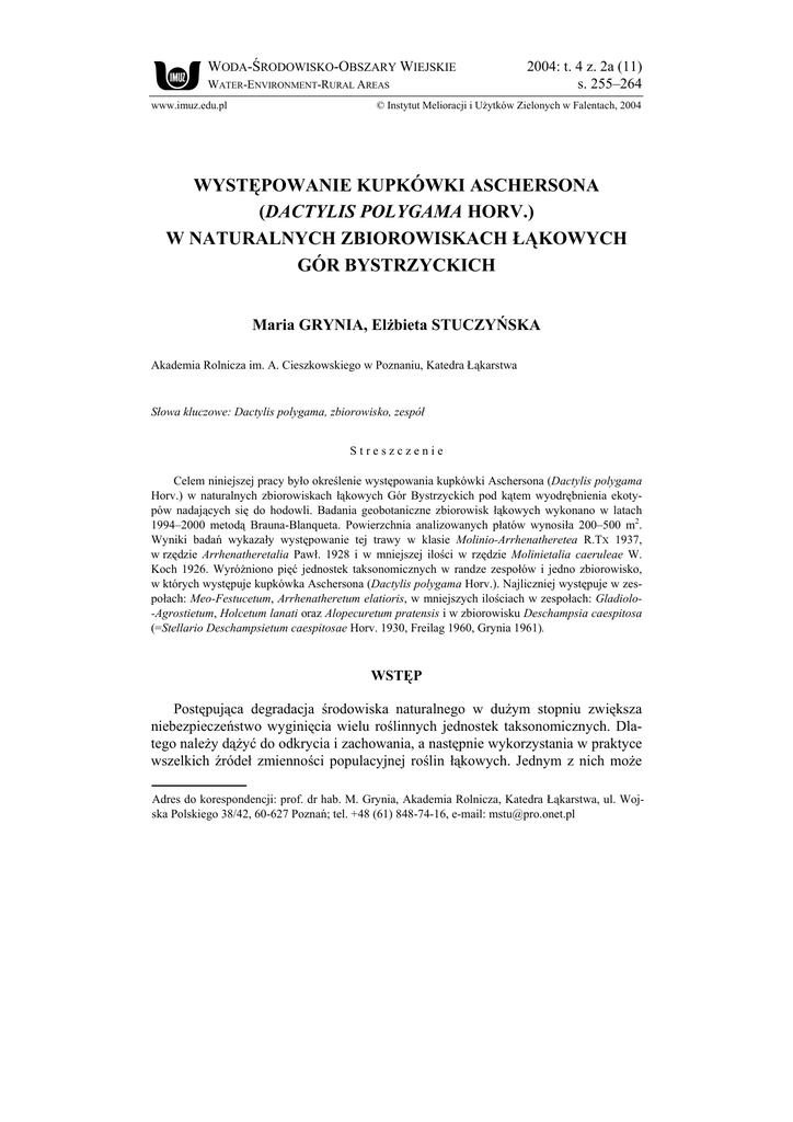 WODA-ŚRODOWISKO-OBSZARY WIEJSKIE WATER-ENVIRONMENT-RURAL AREAS www.imuz.edu.pl 2004: t. 4 z. 2a (11) s. 255–264 © Instytut Melioracji i Użytków Zielonych w Falentach, 2004 WYSTĘPOWANIE KUPKÓWKI ASCHERSONA (DACTYLIS POLYGAMA HORV.) W NATURALNYCH ZBIOROWISKACH ŁĄKOWYCH GÓR BYSTRZYCKICH Maria GRYNIA, Elżbieta STUCZYŃSKA Akademia Rolnicza im. A. Cieszkowskiego w Poznaniu, Katedra Łąkarstwa Słowa kluczowe: Dactylis polygama, zbiorowisko, zespół Streszczenie Celem niniejszej pracy było określenie występowania kupkówki Aschersona (Dactylis polygama Horv.) w naturalnych zbiorowiskach łąkowych Gór Bystrzyckich pod kątem wyodrębnienia ekotypów nadających się do hodowli. Badania geobotaniczne zbiorowisk łąkowych wykonano w latach 1994–2000 metodą Brauna-Blanqueta. Powierzchnia analizowanych płatów wynosiła 200–500 m2. Wyniki badań wykazały występowanie tej trawy w klasie Molinio-Arrhenatheretea R.TX 1937, w rzędzie Arrhenatheretalia Pawł. 1928 i w mniejszej ilości w rzędzie Molinietalia caeruleae W. Koch 1926. Wyróżniono pięć jednostek taksonomicznych w randze zespołów i jedno zbiorowisko, w których występuje kupkówka Aschersona (Dactylis polygama Horv.). Najliczniej występuje w zespołach: Meo-Festucetum, Arrhenatheretum elatioris, w mniejszych ilościach w zespołach: Gladiolo-Agrostietum, Holcetum lanati oraz Alopecuretum pratensis i w zbiorowisku Deschampsia caespitosa (=Stellario Deschampsietum caespitosae Horv. 1930, Freilag 1960, Grynia 1961). WSTĘP Postępująca degradacja środowiska naturalnego w dużym stopniu zwiększa niebezpieczeństwo wyginięcia wielu roślinnych jednostek taksonomicznych. Dlatego należy dążyć do odkrycia i zachowania, a następnie wykorzystania w praktyce wszelkich źródeł zmienności populacyjnej roślin łąkowych. Jednym z nich może Adres do korespondencji: prof. dr hab. M. Grynia, Akademia Rolnicza, Katedra Łąkarstwa, ul. Wojska Polskiego 38/42, 60-627 Poznań; tel. +48 (61) 848-74-16, e-mail: [email protected] 256 Woda-Środowisko-Obszary Wiejskie t. 4 z. 2a (11) być zmienność genotypowa kupkówki Aschersona (Dactylis polygama Horv.). Ten obcopylny gatunek o diploidalnej liczbie chromosomów występuje na terenie całej Polski, a szczególnie na łąkach śródleśnych, w niżej położonych terenach górskich, często poleśnych, a także przyleśnych nadmorskich. Rośnie na glebach dość żyznych, średnio wilgotnych i przewiewnych. Do pełni wzrostu i rozwoju potrzebuje dużej wilgotności powietrza, która może częściowo zrekompensować niedobór wody w glebie. Nie ma dużych wymagań świetlnych i wykazuje mniejszą konkurencyjność niż kupkówka pospolita (Dactylis glomerata L.). Z tych względów może być stosowana jako komponent mieszanek z roślinami motylkowatymi [STUCZYŃSKI, STUCZYŃSKA, 1999]. Kupkówka Aschersona (Dactylis polygama Horv.) była przedmiotem badań prowadzonych przez wielu autorów, wśród których byli STUCZYŃSKI [1992; 1998], STUCZYŃSKI, STUCZYŃSKA [1999], SZAFRAN [1933], VACEK [1974]. Od 1999 r. w Katedrze Łąkarstwa AR w Poznaniu prowadzone są prace dotyczące wykorzystania kupkówki Aschersona (Dactylis polygama Horv.) w mieszankach z roślinami motylkowatymi. Brak jest opracowań dotyczących występowania tej trawy w różnych zbiorowiskach łąkowych. Obserwacje i badania w niektórych rejonach kraju wskazują jednak na jej obecność w zespołach [GRYNIA, KRYSZAK 1996; 1999a; b]. Celem niniejszej pracy jest określenie występowania kupkówki Aschersona (Dactylis polygama Horv.) w naturalnych zbiorowiskach łąkowych w Górach Bystrzyckich pod kątem wyodrębnienia ekotypów nadających się do hodowli. METODY BADAŃ Przedstawione w pracy wyniki badań opracowano na podstawie syntezy zdjęć fitosocjologicznych wykonanych metodą Brauna-Blanqueta w latach 1994–2000. Badaniami geobotanicznymi objęto duże powierzchnie zbiorowisk łąkowo-pastwiskowych na terenie Gór Bystrzyckich. W niniejszym opracowaniu uwzględniono 30 reprezentatywnych zdjęć, w których stwierdzono występowanie tego gatunku. Zdjęcia te wykonano w okolicach Polanicy, Paszkowa oraz Dusznik, położonych na dużych przyleśnych lub poleśnych kompleksach łąkowo-pastwiskowych. Powierzchnia analizowanych płatów wynosiła 200–500 m2. Udział gatunków dominujących oraz kupkówki Aschersona (Dactylis polygama Horv.) w wyróżnionych zbiorowiskach określano na podstawie ilościowości i towarzyskości według metody Brauna-Blanqueta. Ponadto obliczono współczynnik pokrycia (Wp). Wyniki podano w ujęciu syntetycznym z uwagi na ograniczoną objętość opracowania. Na podstawie opracowań GRYNI [1995] i MATUSZKIEWICZA [2002] wyróżniono jednostki fitosocjologiczne i zaklasyfikowano je do systemu fitosocjologicznego. Nazwy łacińskie roślin badanych zbiorowisk podano według SZAFERA, KULCZYŃSKIEGO, PAWŁOWSKIEGO [1988] oraz MIRKA i in. [1995]. Oceny wartości gospo- M. Grynia, E. Stuczyńska: Występowanie kupkówki Aschersona ... 257 darczej dokonano na podstawie składu florystycznego. W zakresie badań środowiska dokonano rozpoznania typologicznego gleb z uwzględnieniem wilgotności i odczynu. OGÓLNA CHARAKTERYSTYKA BADANEGO TERENU Góry Bystrzyckie są najbardziej okazałym masywem górskim w Sudetach. Ich północna część zbudowana jest z kambryjskich gnejsów i łupków mikowych pokrytych górnokredowymi piaskowcami ciosowymi. Klimat tego obszaru jest korzystny dla produkcji łąkowej. Okres wegetacji jest średnio o 2–3 tygodnie krótszy w porównaniu z innymi regionami Polski. Średnia temperatura powietrza w okresie wegetacji wynosi 12°C, zaś średnia suma opadów atmosferycznych 320–650 mm. Wilgotność względna powietrza w okresie lata rzadko spada do 70%, co wynika z istnienia na tym terenie znacznej ilości kompleksów leśnych oraz specyficznej konfiguracji terenu [GRYNIA, KRYSZAK, 1996; 1997; 1998]. Badane zbiorowiska występują w S