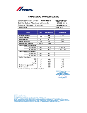 ŚWIADECTWO JAKOŚCI CEMENTU Cement portlandzki EN 197-1 – CEM I 42,5 R Certyfikat Stałości Właściwości Użytkowych: Deklaracja Właściwości Użytkowych: Okres wysyłki: Cecha "CZERWONY" 1487-CPR-019-02 1487-CPR-019-02 lipiec 2015 Wynik średni Wymagania > 120 cm2/g 180 238 27,1 1,0 3849 po 2 dniach po 28 dniach Wytrzymałość na zginanie: MPa MPa 28,5 58,2 > 20 < 29 > 42,5 < 62,5 po 2 dniach po 28 dniach Analiza chemiczna: SO3 MPa MPa 4,9 8,3 % % % % % 2,90 0,091 0,64 0,60 3,58 Początek wiązania Koniec wiązania Wodożądność Stałość objętości Powierzchnia właściwa Wytrzymałość na ściskanie: Cl Na2Oeq Części nierozpuszczalne Straty prażenia Jedn. min % mm < 28 < 10 < 4,0 < 0,10 < 0,8 < 5,0 < 5,0 Zawarość rozpuszczalnego chromu Cr(VI) poniżej 2 ppm CEMEX Polska Sp. z o.o. Zakład Cementownia Chełm ul. Fabryczna 6, 22-100 Chełm, tel. +48 (82) 56 46 100, fax +48 (82) 56 46 796 z siedzibą w Warszawie, adres: ul. Łopuszańska 38 D, 02-232 Warszawa, tel. +48 (22) 57 14 100, fax +48 (22) 57 14 101 Zarząd: Marcelo Catala, Tadeusz Radzięciak, Iwona Górakowska-Szyszka, Kamila Skorupińska, Włodzimierz Chołuj, Rafał Gajewski; Izabela Rokicka; Adrian Burchard; Michał Daszkiewicz. Organ rejestrowy: Sąd Rejonowy dla m.st. Warszawy w Warszawie, XIII Wydział Gospodarczy KRS, KRS 0000037375, Regon 012192639, NIP 951-14-96-432, Kapitał zakładowy 314 268 600,00 zł