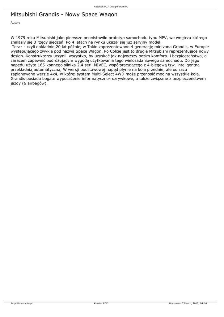 AutoRok.PL / DesignForum.PL Mitsubishi Grandis - Nowy Space Wagon Autor: W 1979 roku Mitsubishi jako pierwsze przedstawiło prototyp samochodu typu MPV, we wnętrzu którego znalazły się 3 rzędy siedzeń. Po 4 latach na rynku ukazał się już seryjny model. Teraz - czyli dokładnie 20 lat później w Tokio zaprezentowano 4 generację minivana Grandis, w Europie występującego zwykle pod nazwą Space Wagon. Po Colcie jest to drugie Mitsubishi reprezentujące nowy design. Konstruktorzy uczynili wszystko, by uzyskać jak najwyższy pozim komfortu i bezpieczeństwa, a zarazem zapewnić podróżującym wygodę użytkowania tego wielozadaniowego samochodu. Do jego napędu użyto 165-konnego silnika 2,4 serii MIVEC, współpracującego z 4-biegową tzw. inteligentną przekładnią automatyczną. W wersji podstawowej napęd płynie na koła przednie, ale od razu zaplanowano wersję 4x4, w której system Multi-Select 4WD może przenosić moc na wszystkie koła. Grandis posiada bogate wyposażenie informatyczno-rozrywkowe, a także związane z bezpieczeństwem jazdy (6 airbagów). http://mas.auto.pl Kreator PDF Utworzono 7 March, 2017, 04:14