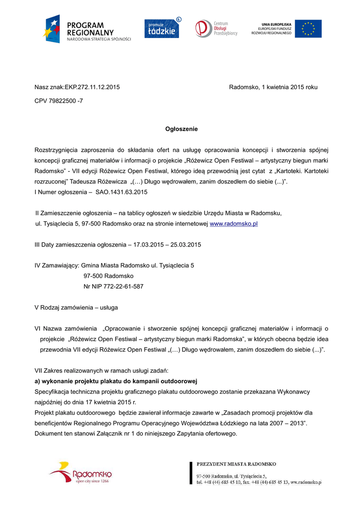 Nasz znak:EKP.272.11.12.2015 Radomsko, 1 kwietnia 2015 roku CPV 79822500 -7 Ogłoszenie Rozstrzygnięcia zaproszenia do składania ofert na usługę opracowania koncepcji i stworzenia spójnej koncepcji graficznej materiałów i informacji o projekcie „Różewicz Open Festiwal – artystyczny biegun marki Radomsko” - VII edycji Różewicz Open Festiwal, którego ideą przewodnią jest cytat z „Kartoteki. Kartoteki rozrzuconej” Tadeusza Różewicza „(…) Długo wędrowałem, zanim doszedłem do siebie (...)”. I Numer ogłoszenia – SAO.1431.63.2015 II Zamieszczenie ogłoszenia – na tablicy ogłoszeń w siedzibie Urzędu Miasta w Radomsku, ul. Tysiąclecia 5, 97-500 Radomsko oraz na stronie internetowej www.radomsko.pl III Daty zamieszczenia ogłoszenia – 17.03.2015 – 25.03.2015 IV Zamawiający: Gmina Miasta Radomsko ul. Tysiąclecia 5 97-500 Radomsko Nr NIP 772-22-61-587 V Rodzaj zamówienia – usługa VI Nazwa zamówienia „Opracowanie i stworzenie spójnej koncepcji graficznej materiałów i informacji o projekcie „Różewicz Open Festiwal – artystyczny biegun marki Radomska”, w których obecna będzie idea przewodnia VII edycji Różewicz Open Festiwal „(…) Długo wędrowałem, zanim doszedłem do siebie (...)”. VII Zakres realizowanych w ramach usługi zadań: a) wykonanie projektu plakatu do kampanii outdoorowej Specyfikacja techniczna projektu graficznego plakatu outdoorowego zostanie przekazana Wykonawcy najpóźniej do dnia 17 kwietnia 2015 r. Projekt plakatu outdoorowego będzie zawierał informacje zawarte w „Zasadach promocji projektów dla beneficjentów Regionalnego Programu Operacyjnego Województwa Łódzkiego na lata 2007 – 2013”. Dokument ten stanowi Załącznik nr 1 do niniejszego Zapytania ofertowego. b) wykonanie projektów graficznych ogłoszeń prasowych: - dla 2 ogłoszeń w prasie lokalnej i 1 ogłoszenia w prasie regionalnej Specyfikacja techniczna projektów graficznych ogłoszeń prasowych zostanie przekazana Wykonawcy najpóźniej do dnia 17 kwietnia 2015 r. Projekt graficznych ogłoszeń prasowych będzie zawierał informacje zawarte w „Zasadach promocji projektów dla beneficjentów Regionalnego Programu Operacyjnego Województwa Łódzkiego na lata 2007 – 2013”. Dokument ten stanowi Załącznik nr 1 do niniejszego Zapytania ofertowego. - dla 3 ogłoszeń w ogólnopolskiej prasie Specyfikacja techniczna projektów graficznych ogłoszeń prasowych zostanie przekazana Wykonawcy najpóźniej do dnia 8 kwietnia 2015 r. Projekt graficznych ogłoszeń w ogólnopolskiej prasie będzie zawierał informacje zawarte w „Zasadach promocji projektów dla beneficjentów Regionalnego Programu Operacyjnego Województwa Łódzkiego na lata 2007 – 2013”.Dokument ten stanowi Załącznik nr 1 do niniejszego Zapytania ofertowego. e) wykonanie projektów graficznych ogłoszeń internetowych Specyfikacja techniczna projektów graficznych ogłoszeń internetowych zostanie przekazana Wykonawcy najpóźniej do dnia 17 kwietnia 2015 r. Projekt graficznych ogłoszeń internetowych będzie zawierał informacje zawarte w „Zasadach promocji projektów dla beneficjentów Regionalnego Programu Operacyjnego Województwa Łódzkiego na lata 2007 – 2013”. Dokument ten stanowi Załącznik nr 1 do niniejszego Zapytania ofertowego. f) wykonanie projektu graficznego programu (ulotek z programem wydarzenia) Specyfikacja techniczna projektu graficznego programu: format A4 ( składane na DL), kolor - 4+4 CMYK. Projekt graficzny programu będzie zawierał informacje zawarte w „Zasadach promocji projektów dla beneficjentów Regionalnego Programu Operacyjnego Województwa Łódzkiego na lata 2007 – 2013”. Dokument ten stanowi Załącznik nr 1 do niniejszego Zapytania ofertowego. VIII Wspólny słownik zamówień CPV 79822500-7 IX Tryb udzielania zamówienia – postępowanie o udzielenie zamówienia publicznego poniżej 30.000 euro X Zamówienie dotyczy projektu realizowanego w ramach Regionalnego Programu Operacyjnego Województwa Łódzkiego na lata 2007-2013 Oś Priorytetowa III: Gospodarka, Innowacyjność, Przedsiębiorczość, Marketing i Promocja Produktów i „Marek” Regionalnych i Lokalnych. XI Data udzielania zamówienia: 1 kwietnia 2015 roku XII Liczba otrzymanych ofert – 6 XIII Liczba odrzuconych ofert – 1 XIV Zamawiający dokonał wyboru najkorzystniejszej oferty w oparciu o następujące kryteria ofert: Nr NAZWA KRYTERIUM WAGA (Wg) 1. Cena oferty 60,00% 2. Projekt layoutu 40,00% XV Imię i nazwisko Wykonawcy, któremu udzielono zamówienia: Pan Bartosz Wiłun Wykonawca uzyskał najwyższą liczbę punktów dla przyjętych kryteriów, która wynosi 66,67 punktów.