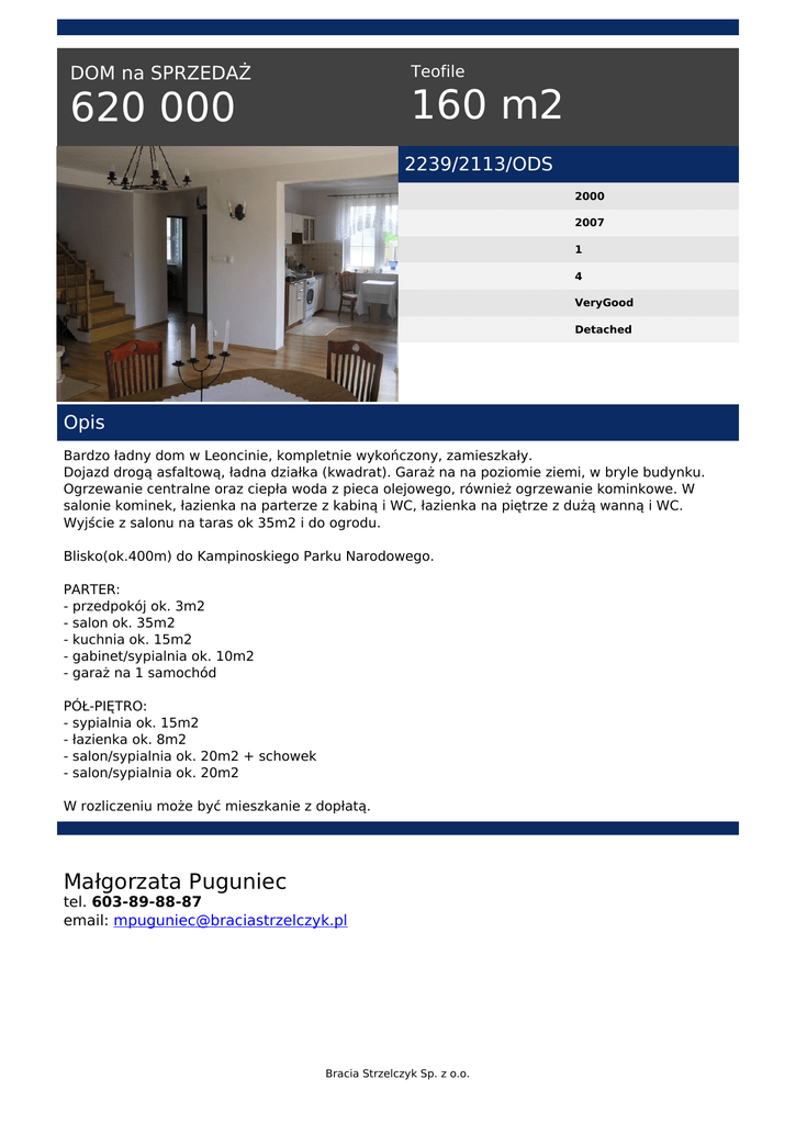 Teofile DOM na SPRZEDAŻ 160 m2 620 000 2239/2113/ODS 2000 2007 1 4 VeryGood Detached Opis Bardzo ładny dom w Leoncinie, kompletnie wykończony, zamieszkały. Dojazd drogą asfaltową, ładna działka (kwadrat). Garaż na na poziomie ziemi, w bryle budynku. Ogrzewanie centralne oraz ciepła woda z pieca olejowego, również ogrzewanie kominkowe. W salonie kominek, łazienka na parterze z kabiną i WC, łazienka na piętrze z dużą wanną i WC. Wyjście z salonu na taras ok 35m2 i do ogrodu. Blisko(ok.400m) do Kampinoskiego Parku Narodowego. PARTER: - przedpokój ok. 3m2 - salon ok. 35m2 - kuchnia ok. 15m2 - gabinet/sypialnia ok. 10m2 - garaż na 1 samochód PÓŁ-PIĘTRO: - sypialnia ok. 15m2 - łazienka ok. 8m2 - salon/sypialnia ok. 20m2 + schowek - salon/sypialnia ok. 20m2 W rozliczeniu może być mieszkanie z dopłatą. Małgorzata Puguniec tel. 603-89-88-87 email: [email protected] Bracia Strzelczyk Sp. z o.o. Powered by TCPDF (www.tcpdf.org)