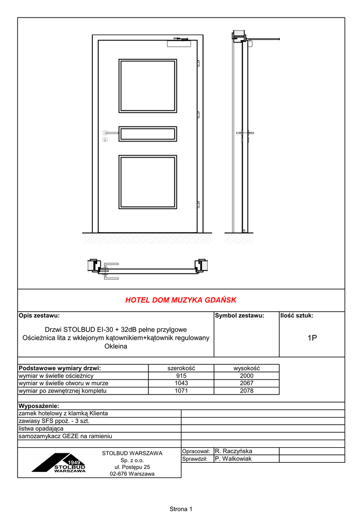 HOTEL DOM MUZYKA GDAŃSK Opis zestawu: Symbol zestawu: Drzwi STOLBUD EI-30 + 32dB pełne przylgowe OścieŜnica lita z wklejonym kątownikiem+kątownik regulowany Okleina Podstawowe wymiary drzwi: wymiar w świetle ościeŜnicy wymiar w świetle otworu w murze wymiar po zewnętrznej kompletu szerokość 915 1043 1071 1P wysokość 2000 2067 2078 WyposaŜenie: zamek hotelowy z klamką Klienta zawiasy SFS ppoŜ. - 3 szt. listwa opadająca samozamykacz GEZE na ramieniu STOLBUD WARSZAWA Sp. z o.o. ul. Postępu 25 02-676 Warszawa Opracował: R. Raczyńska Sprawdził: P. Walkowiak Strona 1 Ilość sztuk: